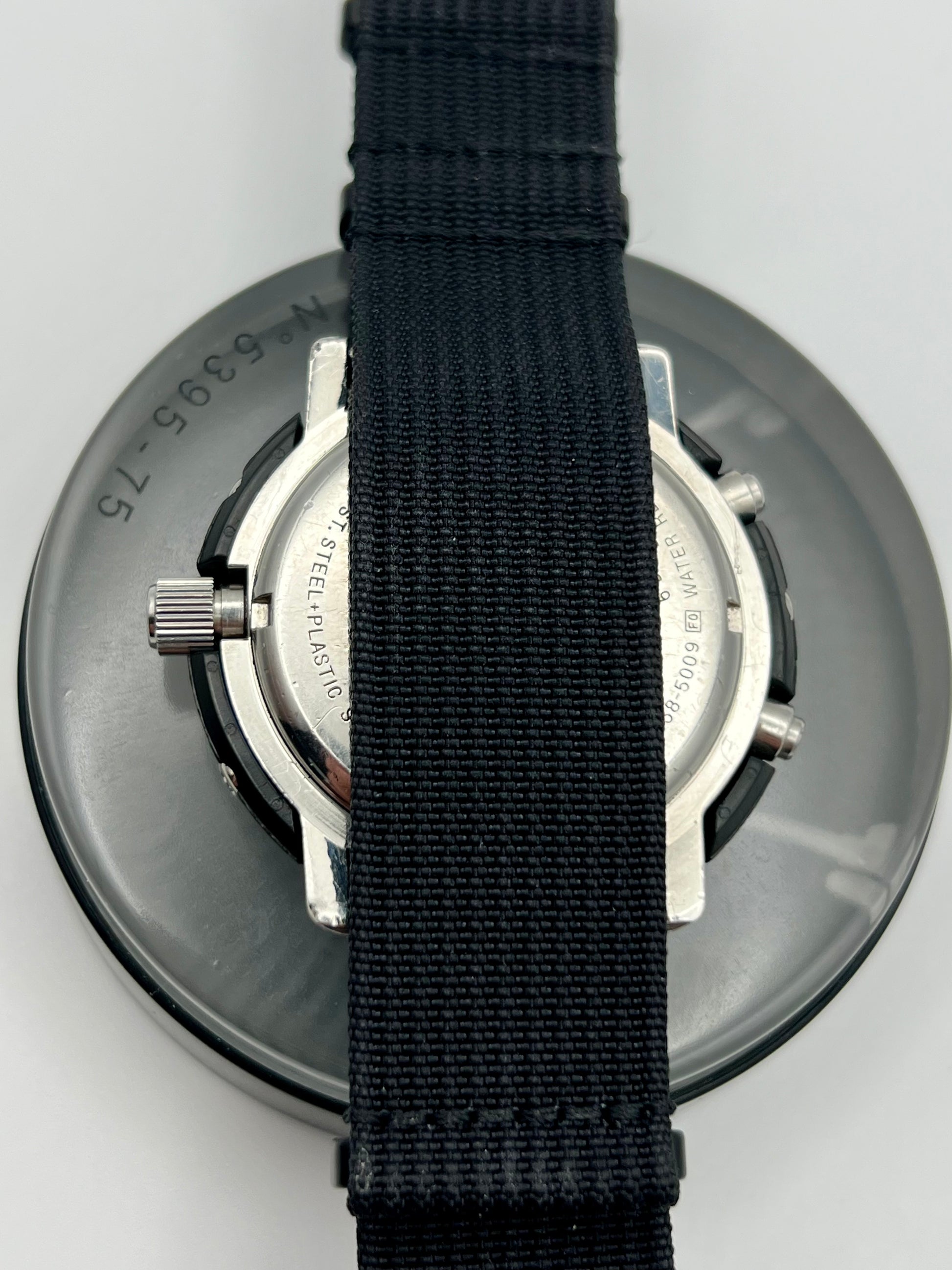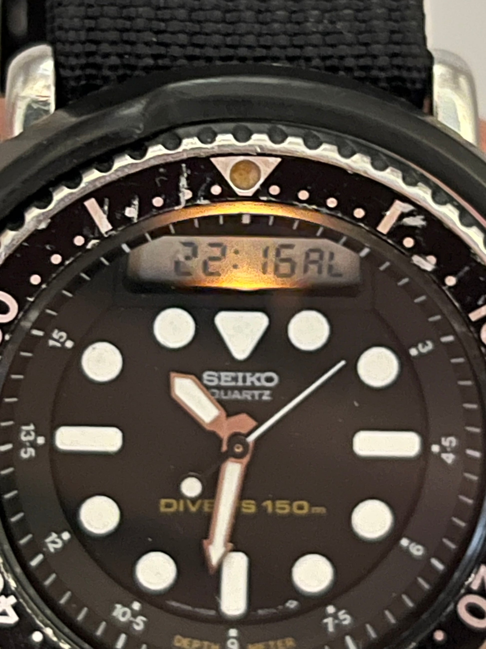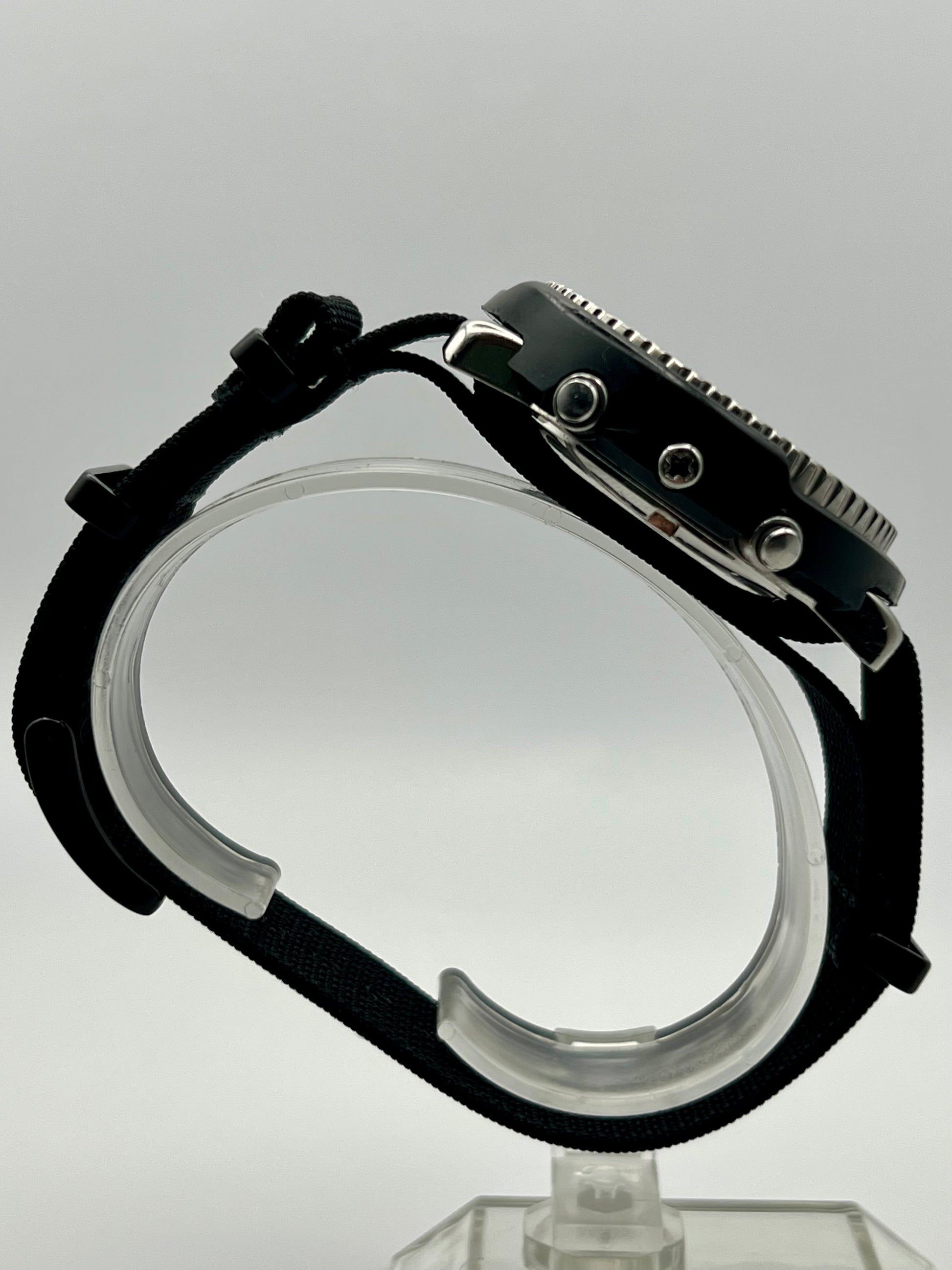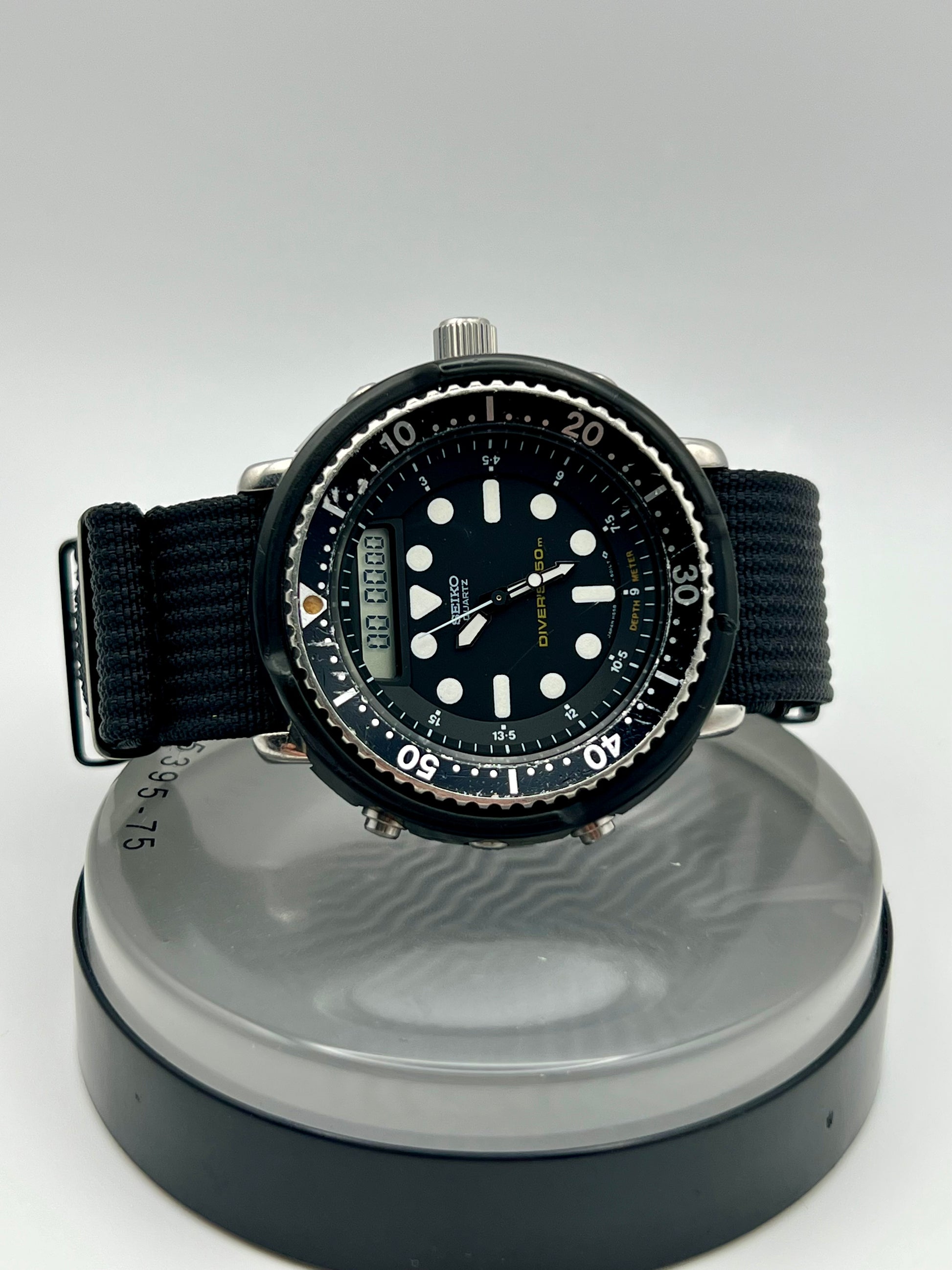 This 1986 Seiko “Arnie” H558-5009 is more than a watch; it is a piece of cinematic history. This is the same model famously worn by Arnold Schwarzenegger in classic action films like Predator and Commando, this model earned its nickname for its rugged reliability and distinctive hybrid design. Combining an analog display with digital functionality, the H558-5009 was built for extremes, featuring a durable shroud, alarm, chronograph, and world time capabilities. Collectors prize it not only for its bold, unmistakable look but also for its legacy as the quintessential action hero timepiece. Whether you are a Seiko enthusiast or a movie memorabilia fan, this watch brings authentic 1980s adventure to the wrist. Shroud is in good condition, minor previous repair done on shroud at 6 o'clock.