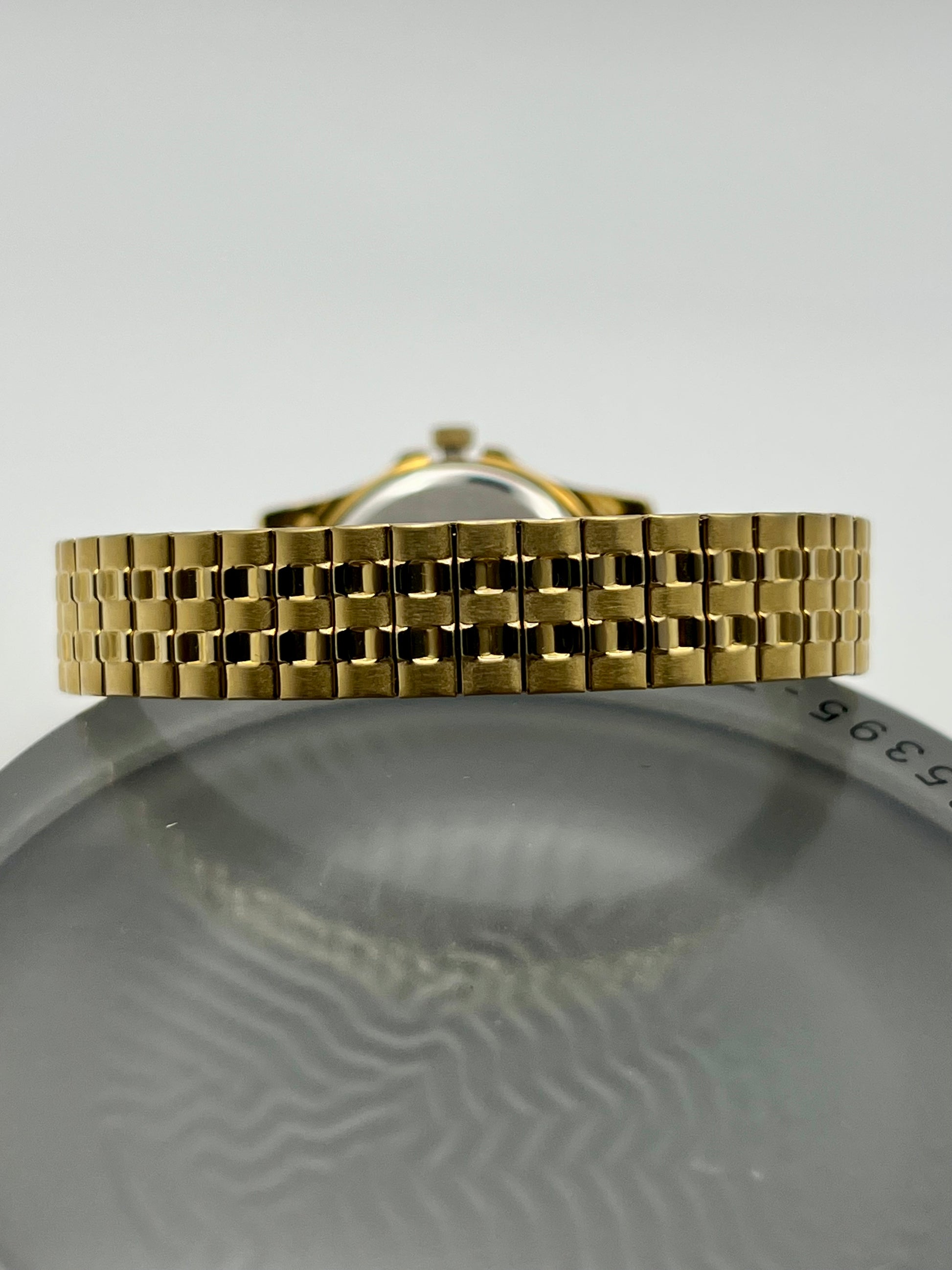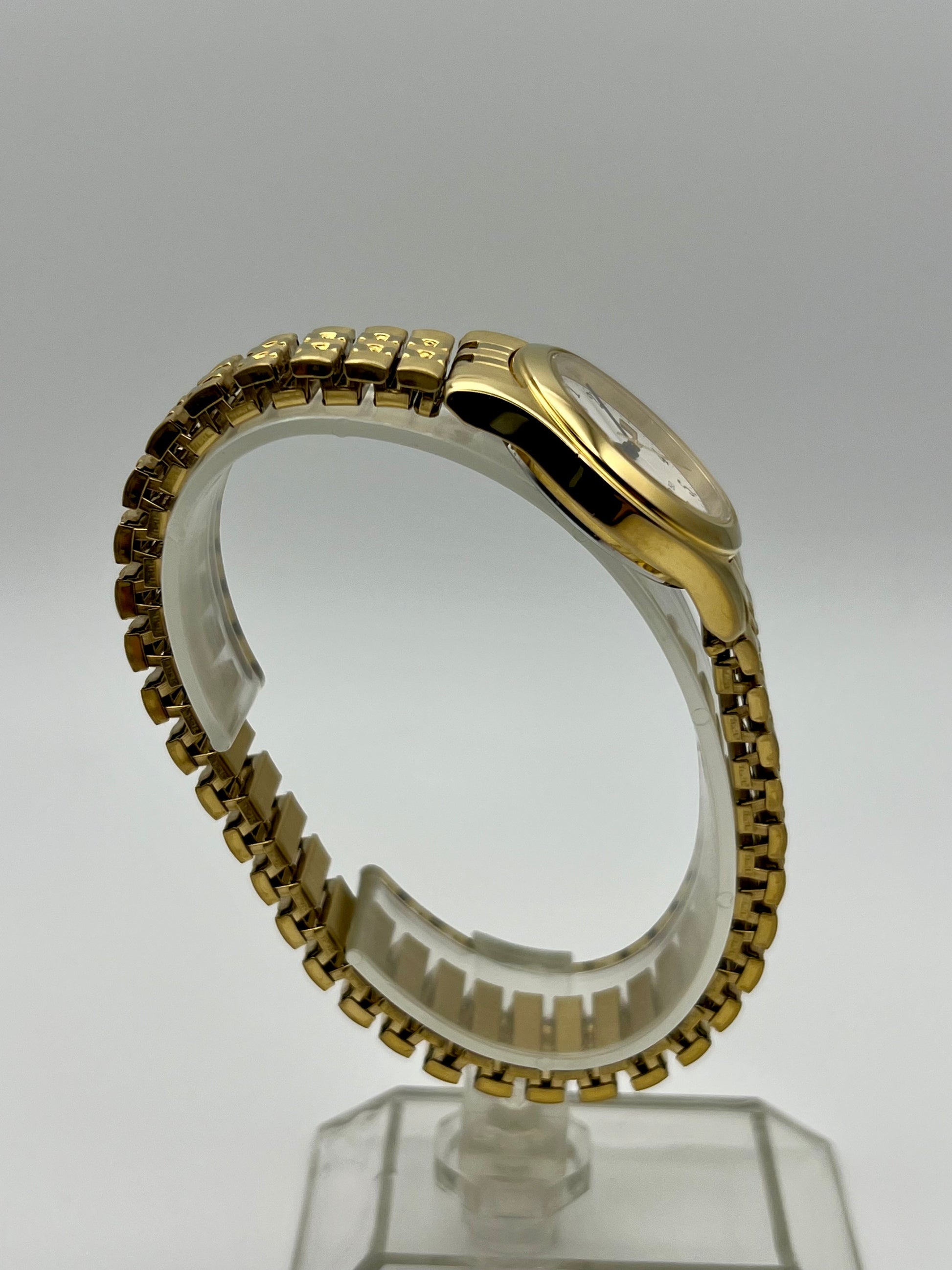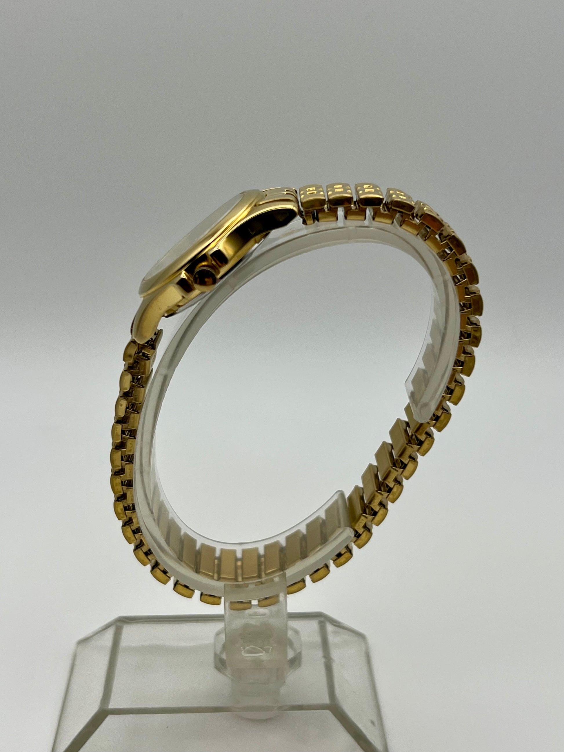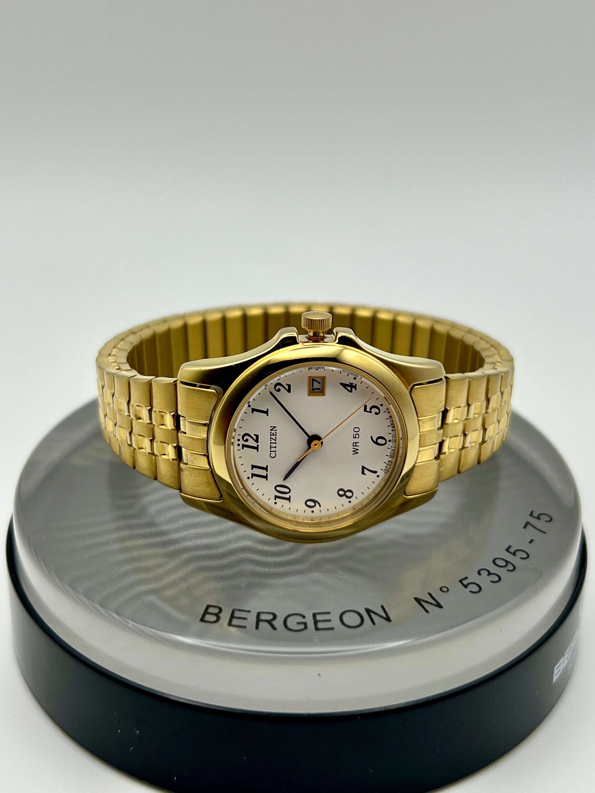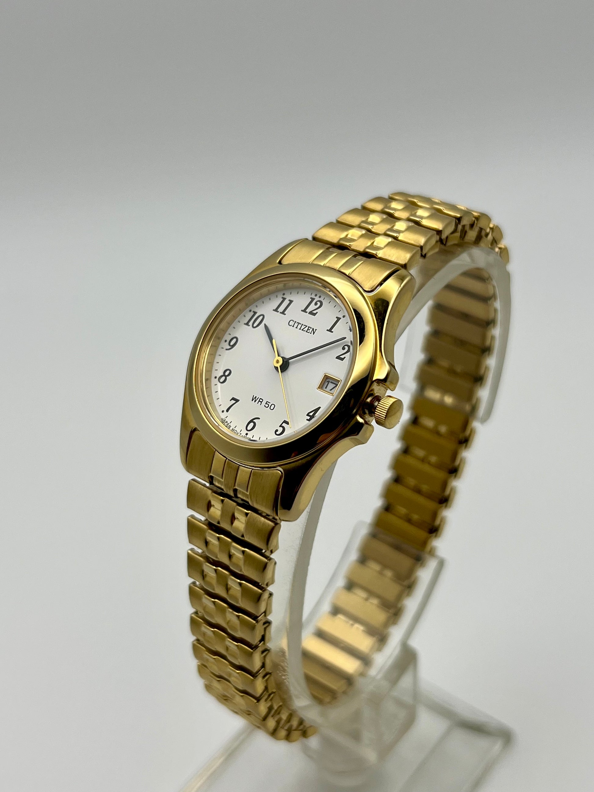 Chic and timeless, this 2003 Citizen Ladies 1012 WR50 features a warm gold tone across both the case and the classic stretch metal bracelet, offering effortless elegance for everyday wear. The round case holds a clean analog dial with easy-to-read numerals and a simple date window, all powered by a dependable quartz movement that keeps accurate time with little maintenance.