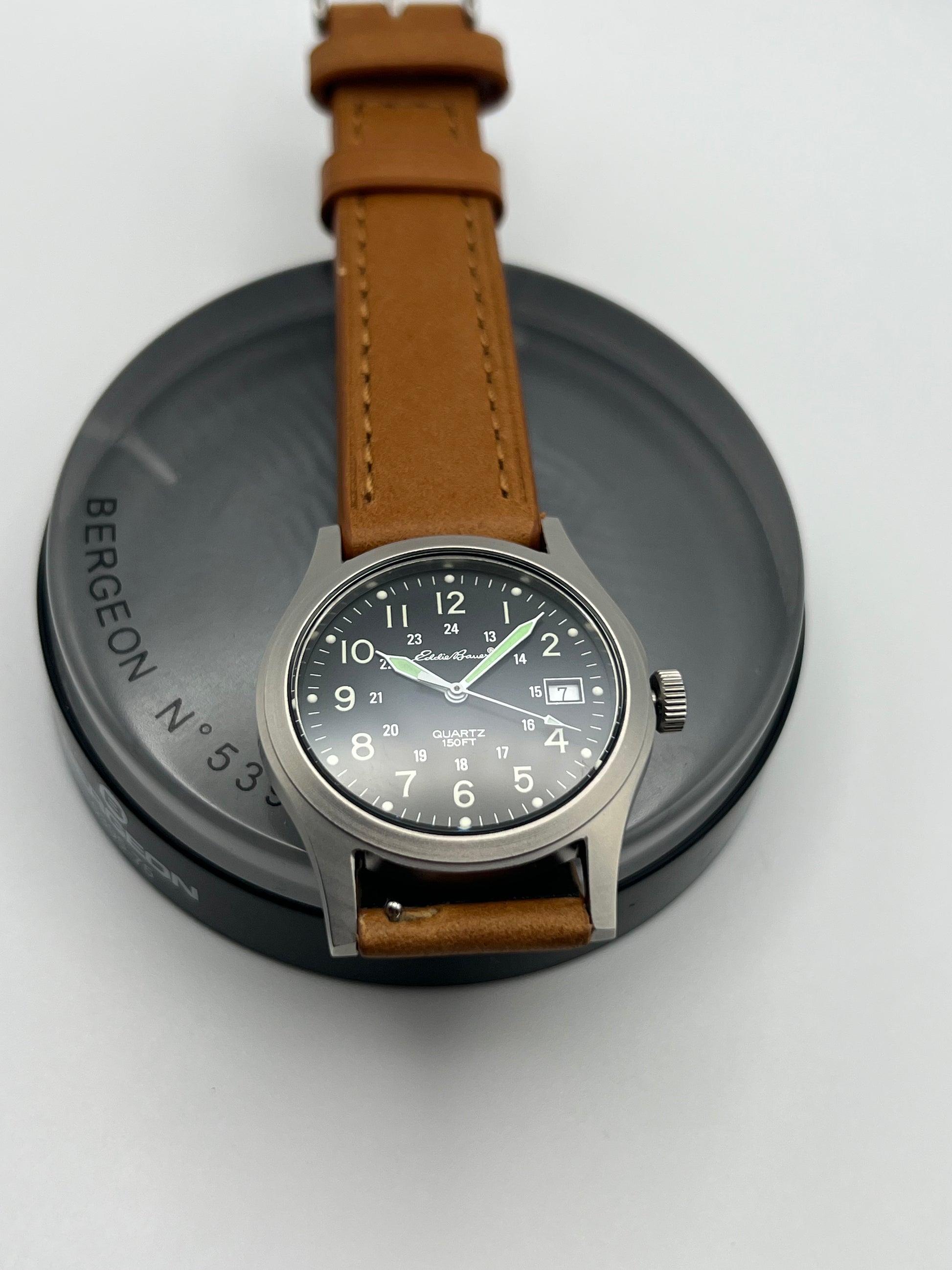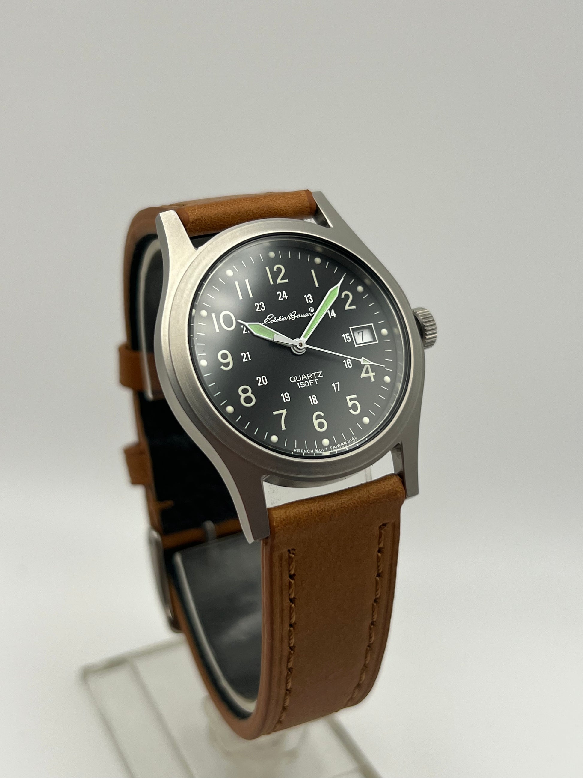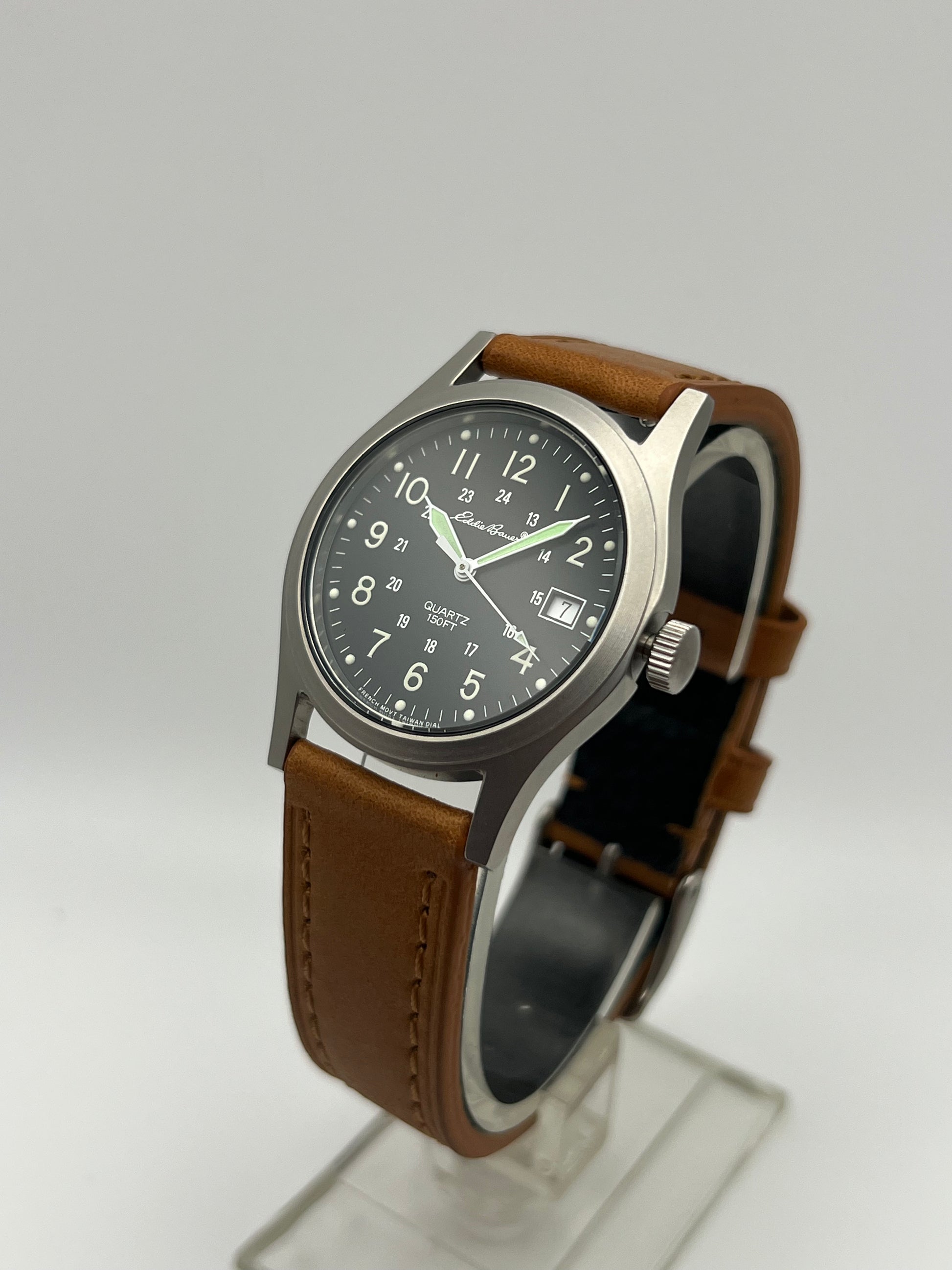 Clean and rugged, this vintage early 2000's Eddie Bauer Khaki Quartz 85323-252 delivers reliable performance with classic field-watch styling. The matte khaki dial features bold numerals, a crisp handset, and excellent lume that glows bright in low light. Powered by a dependable quartz movement, it keeps time accurately and without fuss. Fitted with a brand-new full grain leather strap, it wears comfortably and looks right at home in both casual and outdoor settings. Light wear to the case, fresh battery installed, and running strong. A solid, no-nonsense piece with timeless utility and vintage character.