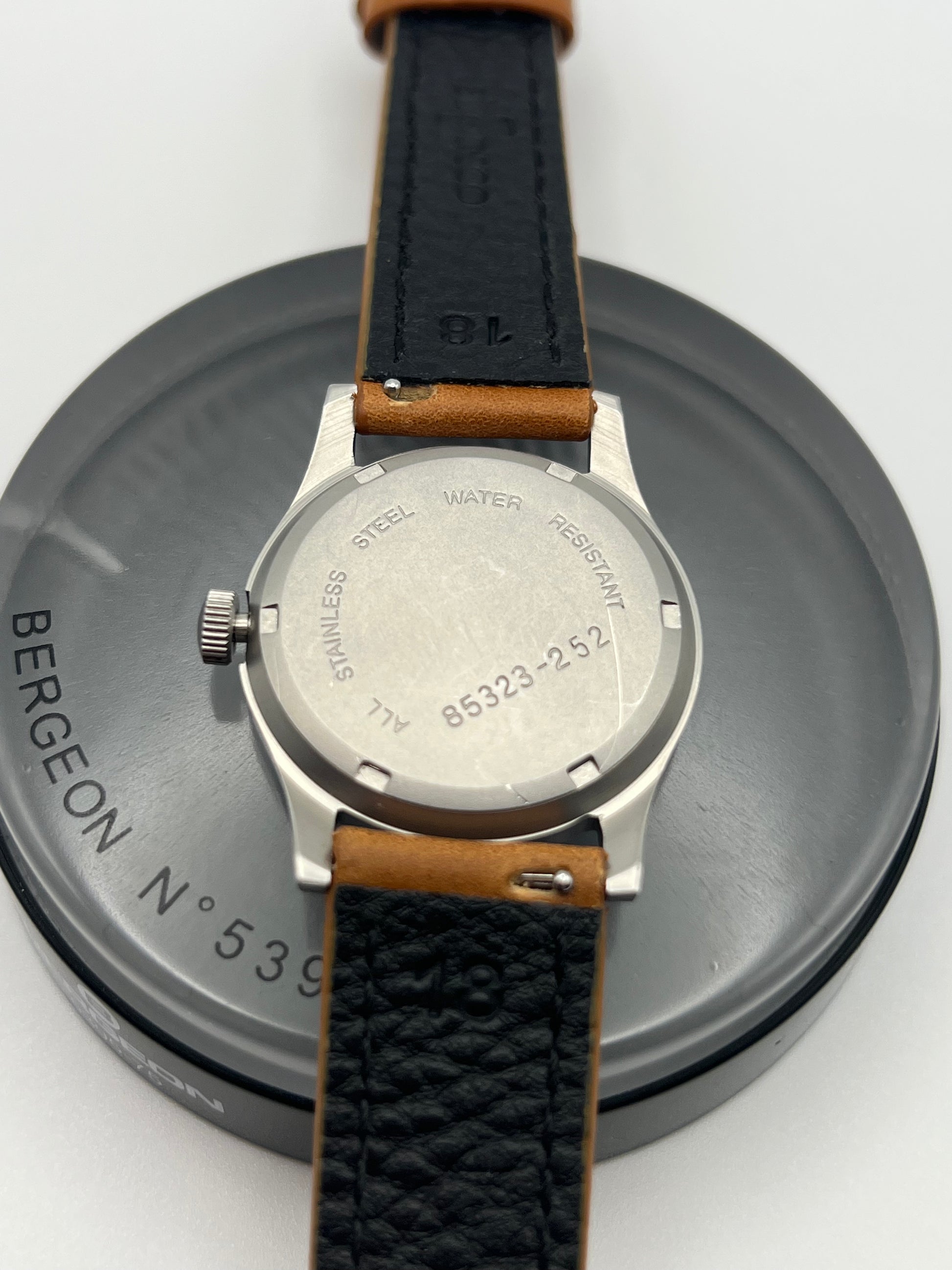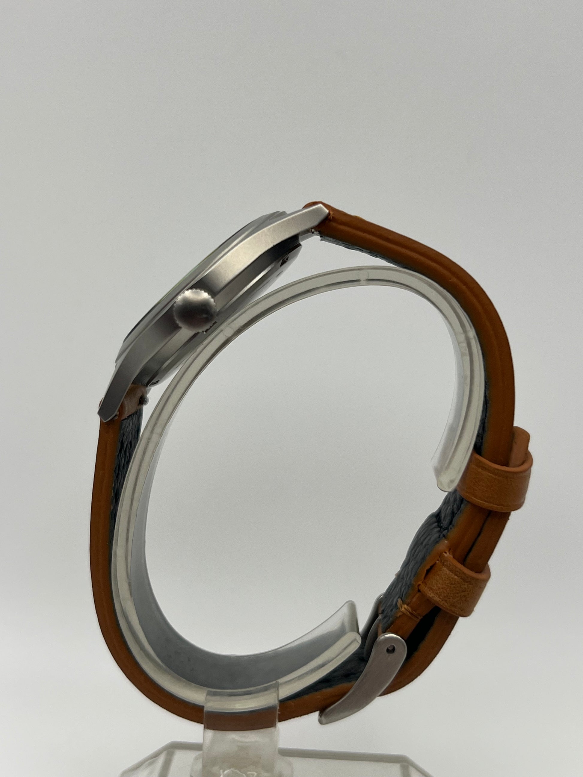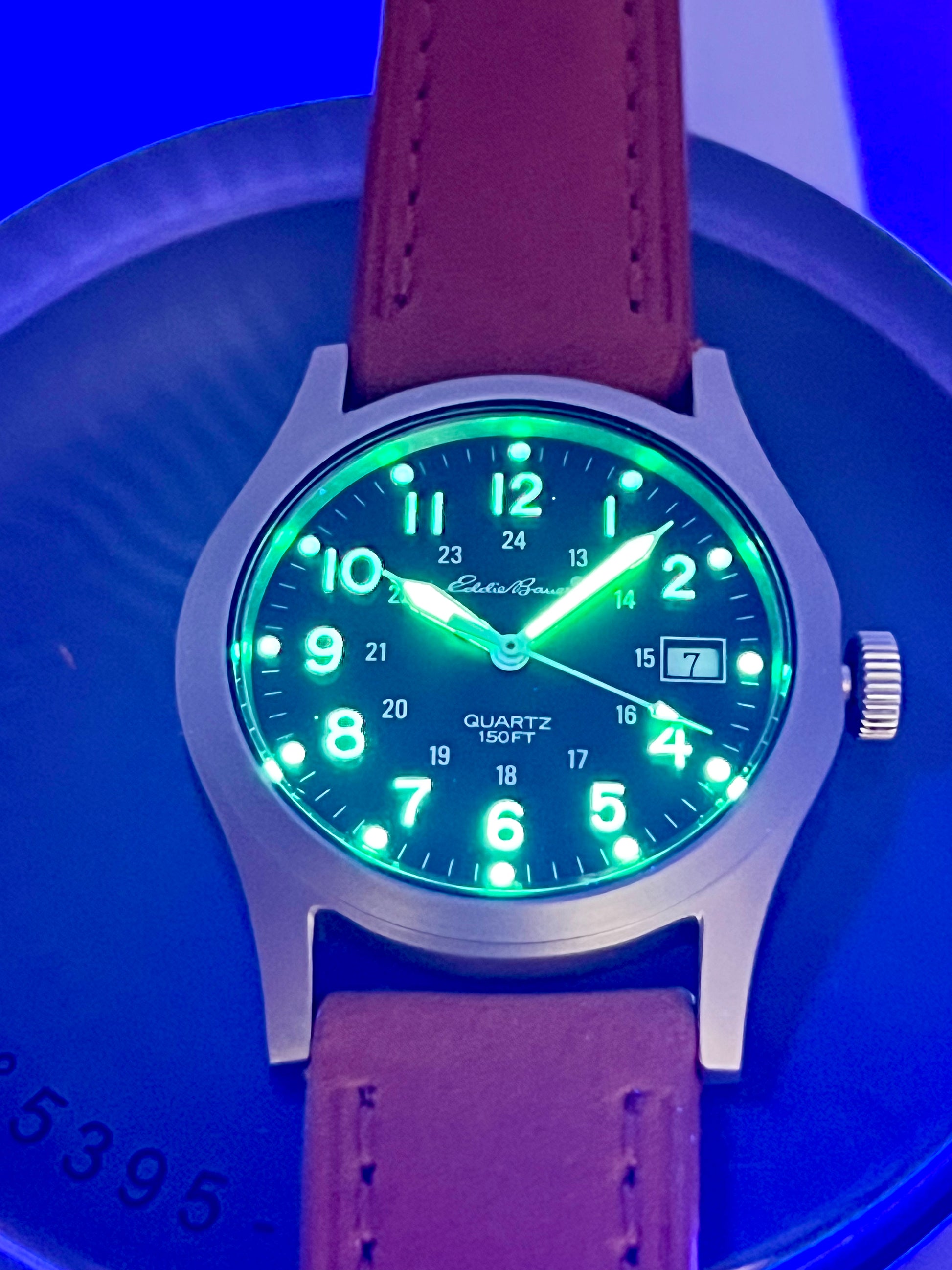 Clean and rugged, this vintage early 2000's Eddie Bauer Khaki Quartz 85323-252 delivers reliable performance with classic field-watch styling. The matte khaki dial features bold numerals, a crisp handset, and excellent lume that glows bright in low light. Powered by a dependable quartz movement, it keeps time accurately and without fuss. Fitted with a brand-new full grain leather strap, it wears comfortably and looks right at home in both casual and outdoor settings. Light wear to the case, fresh battery installed, and running strong. A solid, no-nonsense piece with timeless utility and vintage character.