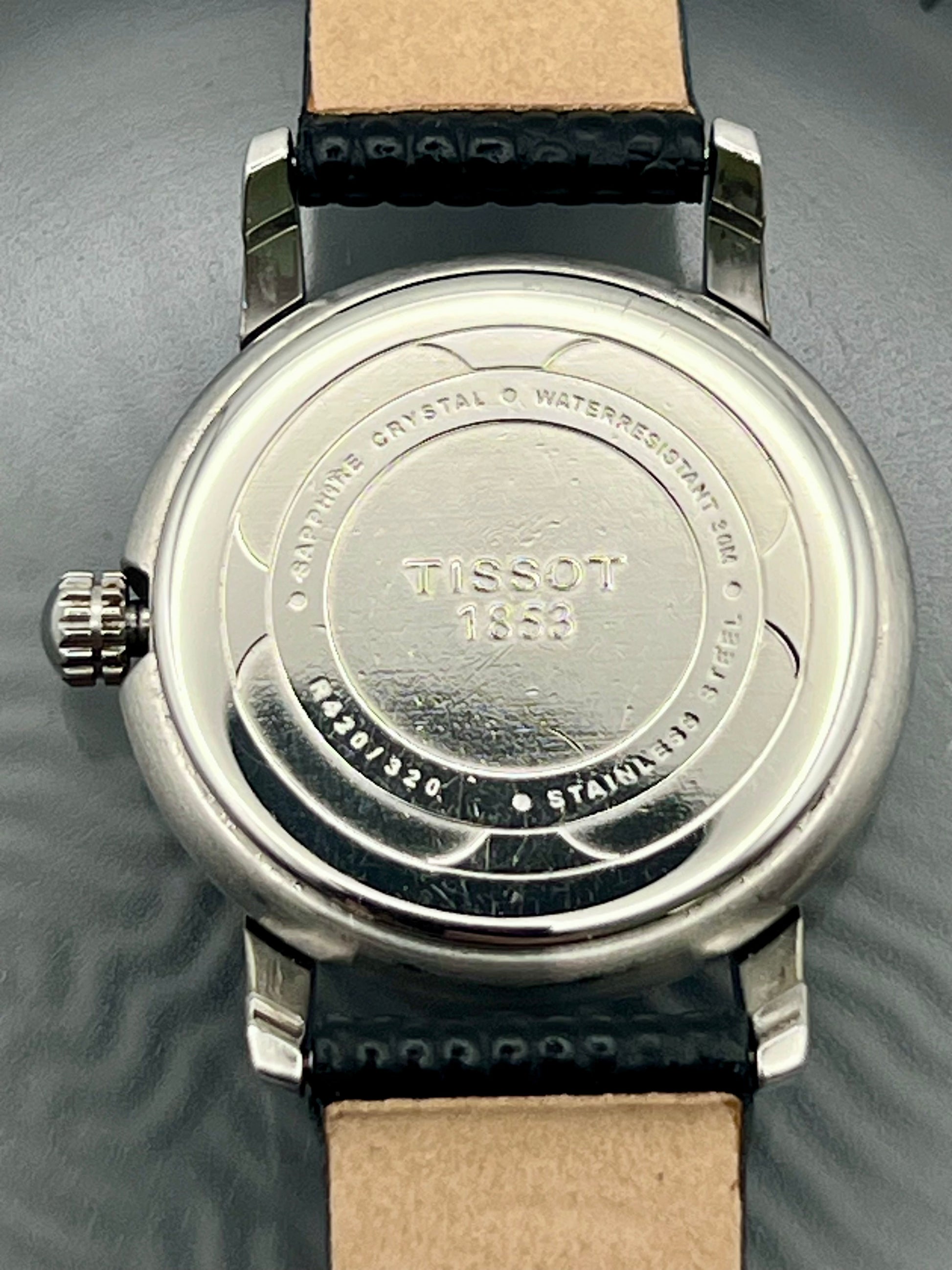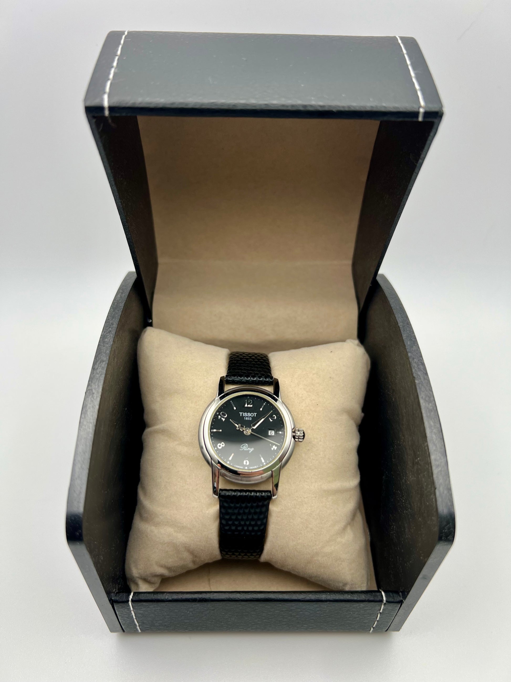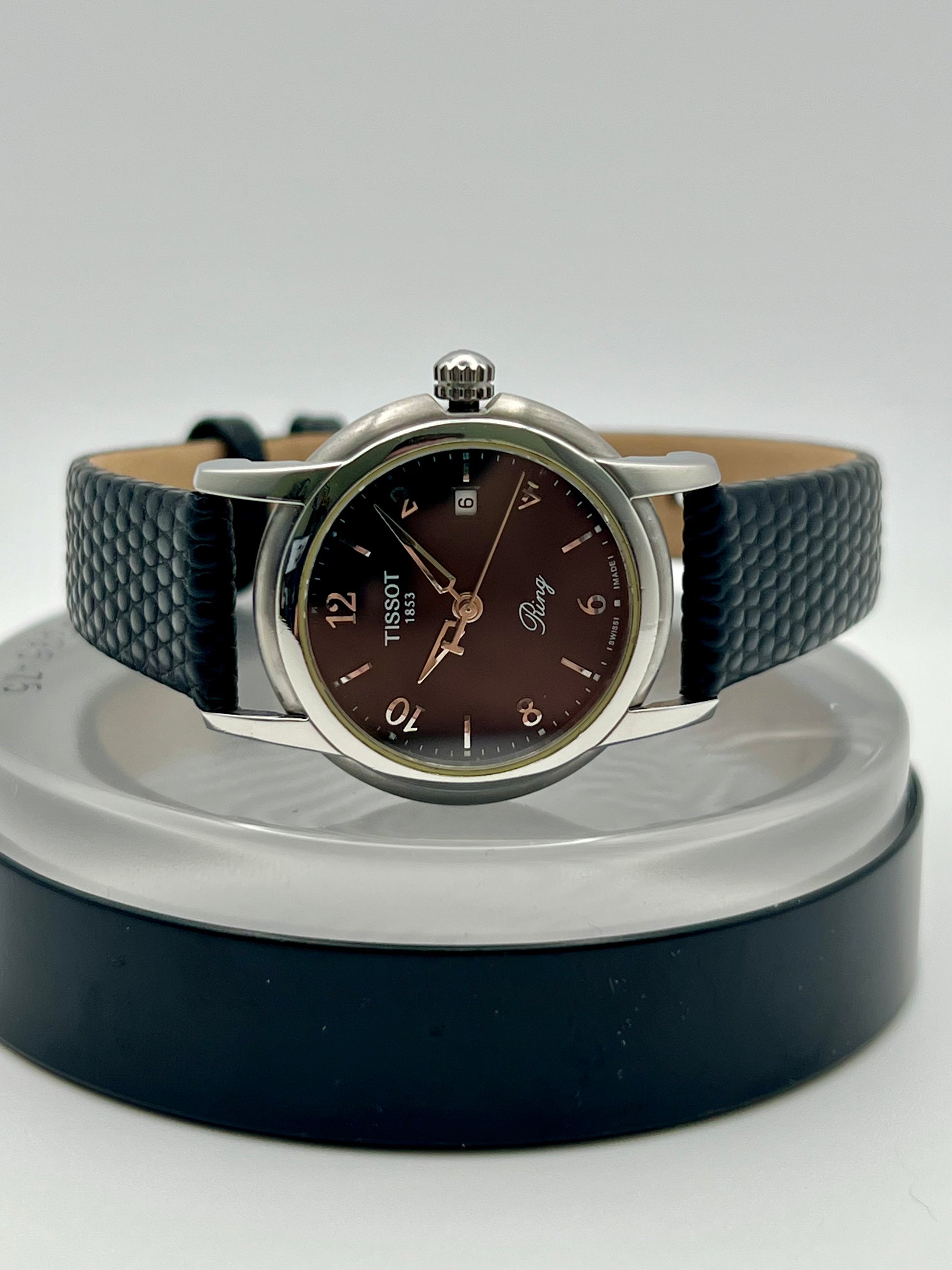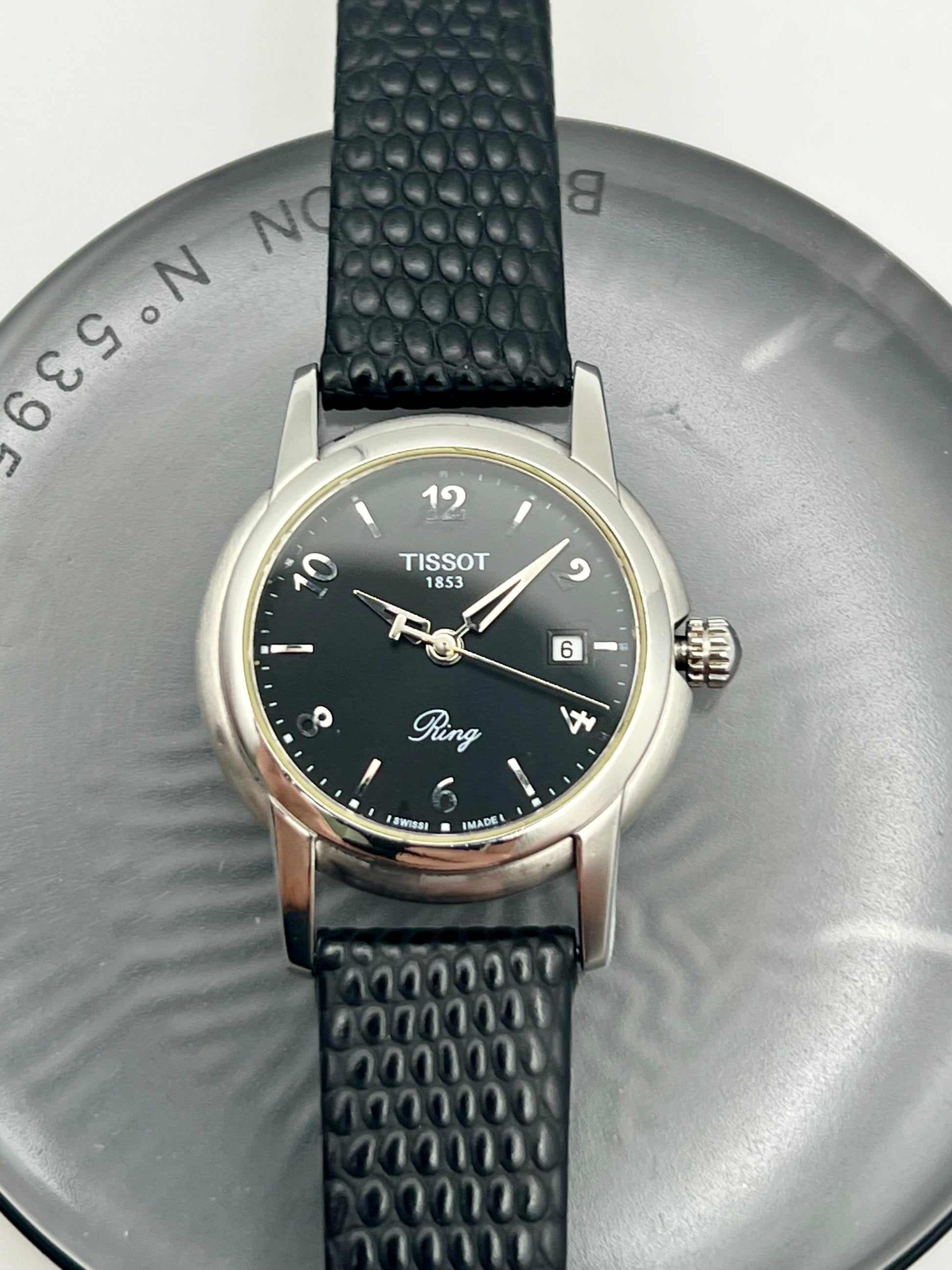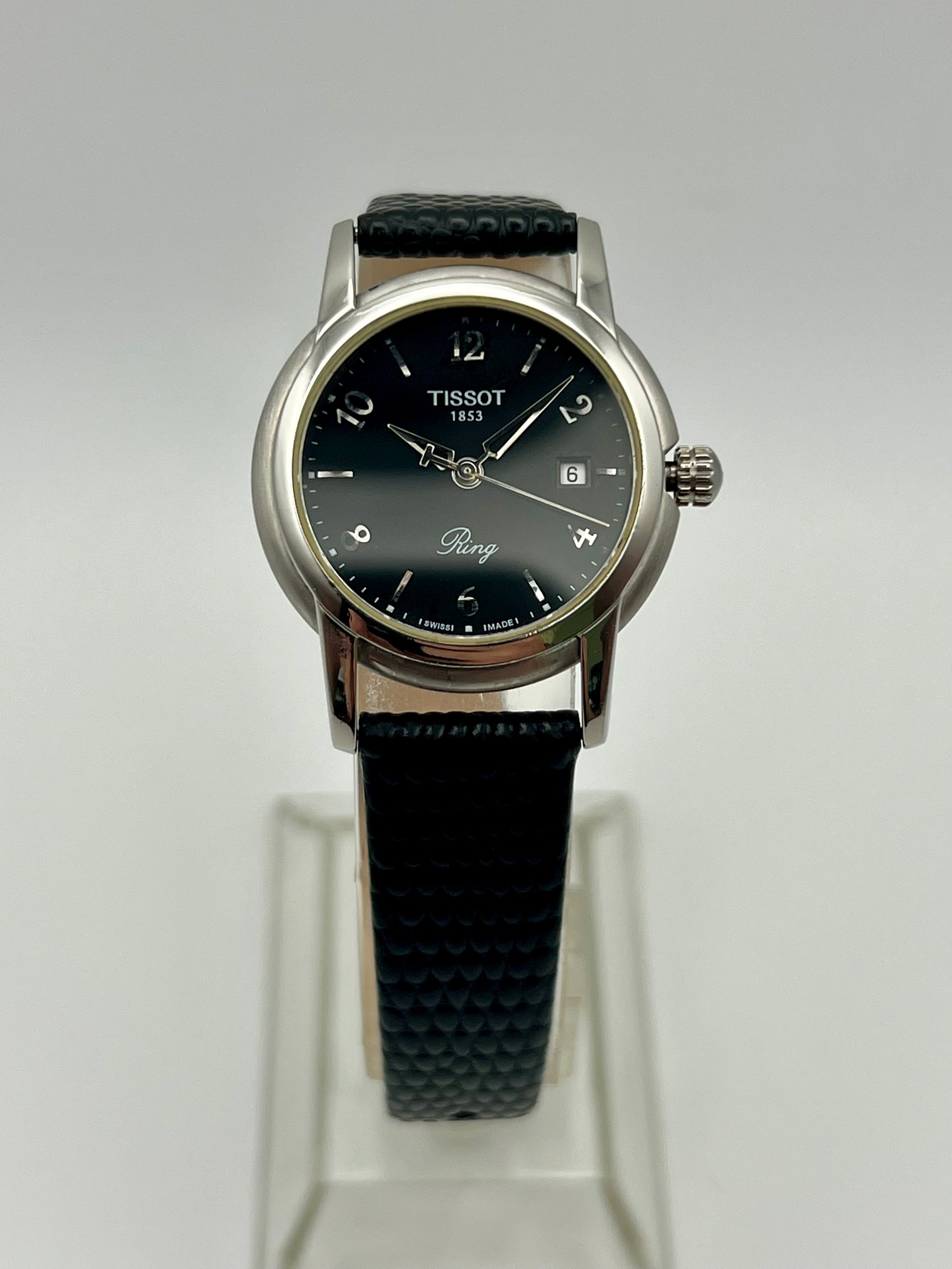 Elegant and minimal, this Tissot Ring R420 320 ladies watch brings together Swiss precision and understated style. The polished round case holds a deep black dial with crisp silver numerals and slender hands, creating a clean and modern look that remains timeless.