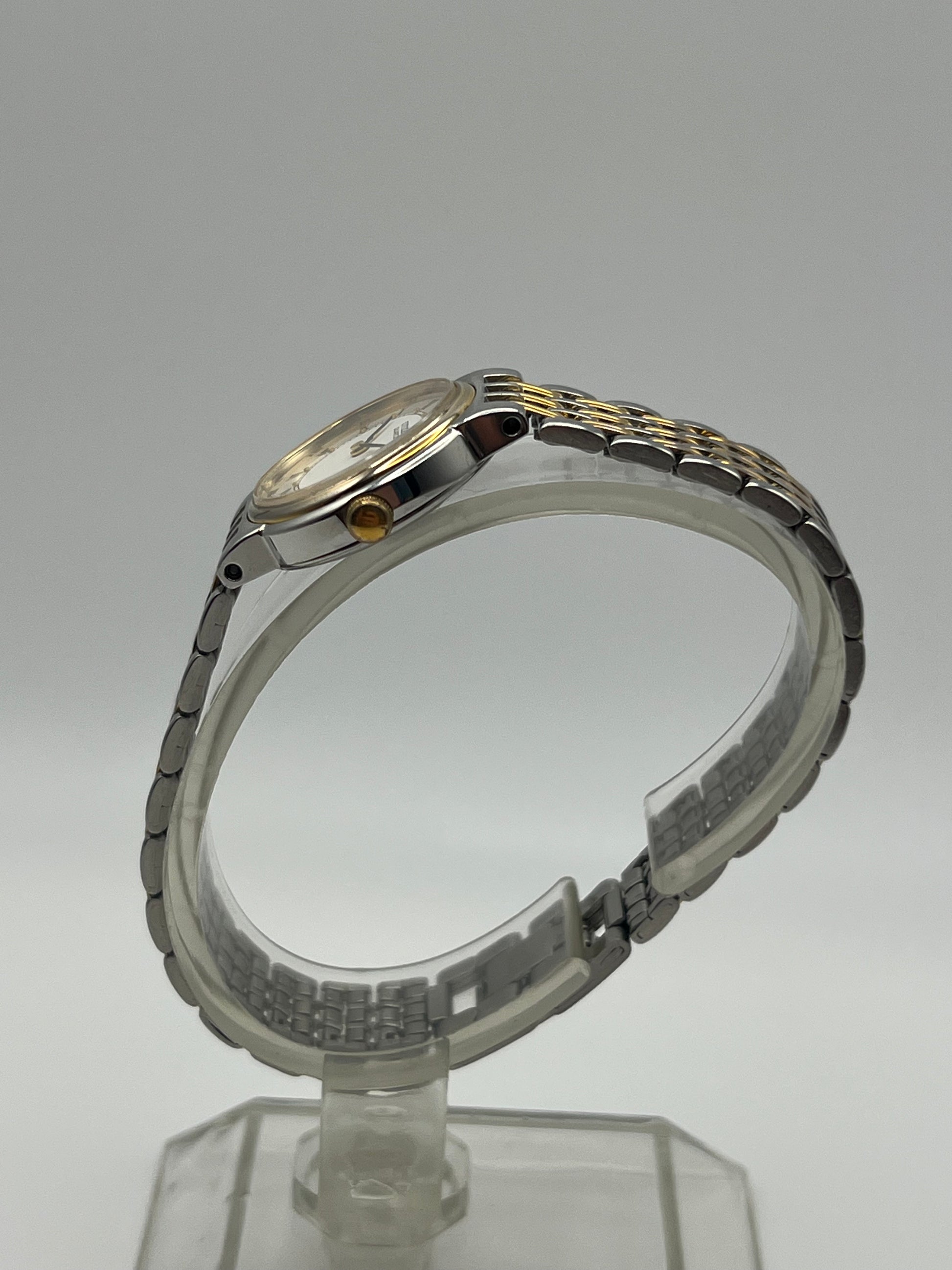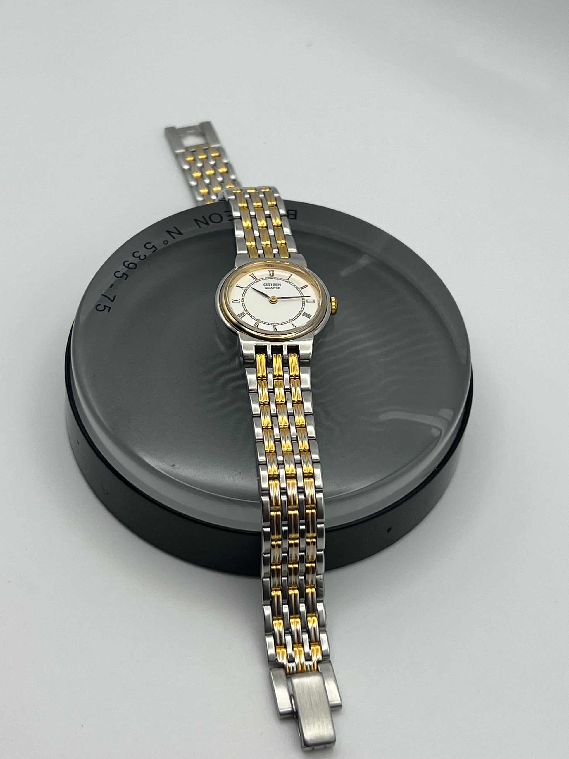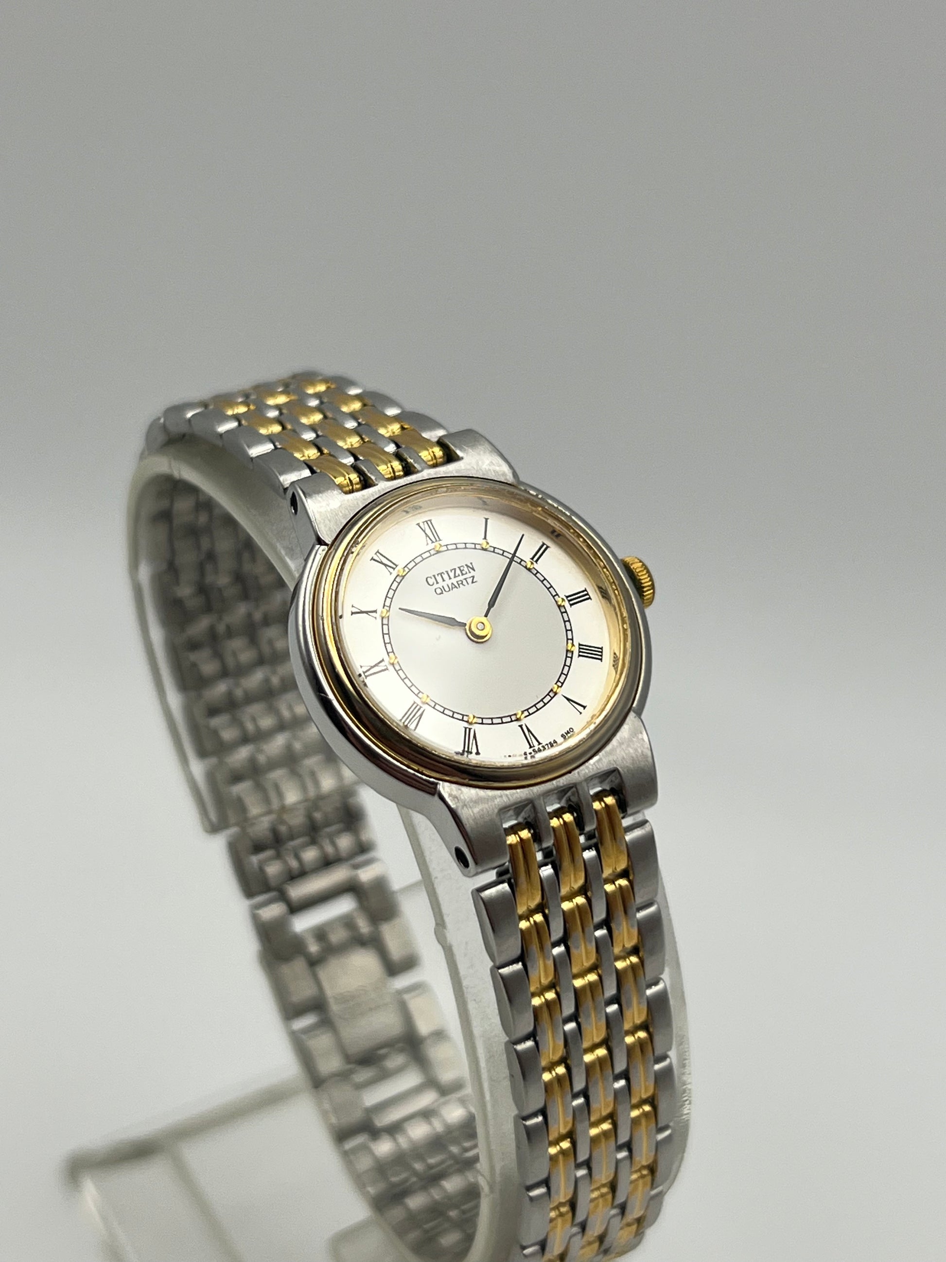 Timeless and elegant, this vintage 90’s Ladies Citizen 3220-S13271 Quartz 2-Tone blends classic design with reliable quartz accuracy. The gold and silver tones flow seamlessly together, creating a polished look that complements any outfit. The dial features clean markers and a matching handset, all framed by subtle Citizen Quartz branding. Powered by a dependable quartz movement, it keeps time accurately with minimal maintenance. Light surface wear consistent with age, fresh battery installed, and running smoothly. A versatile vintage piece that adds a touch of sophistication to everyday style.