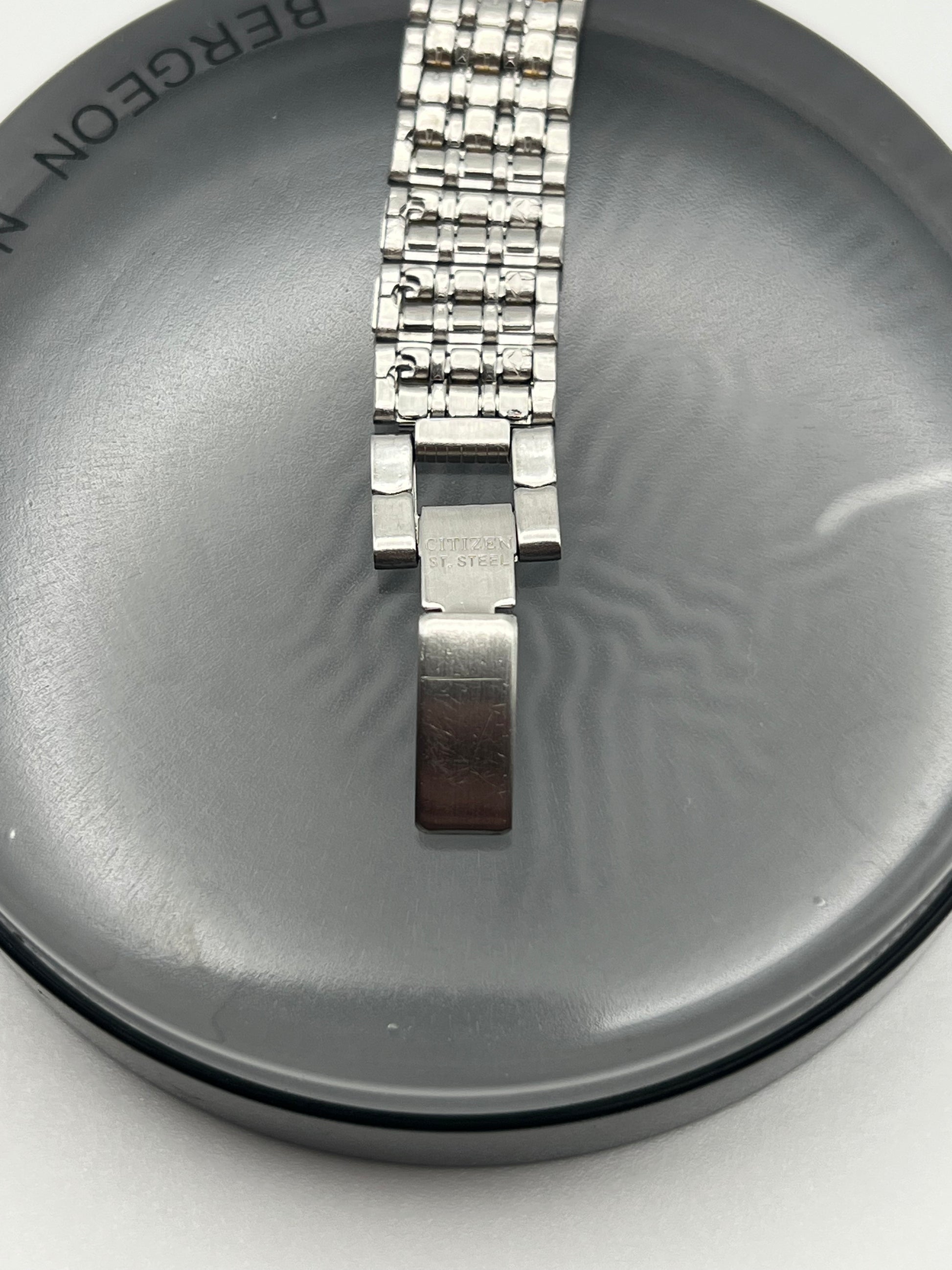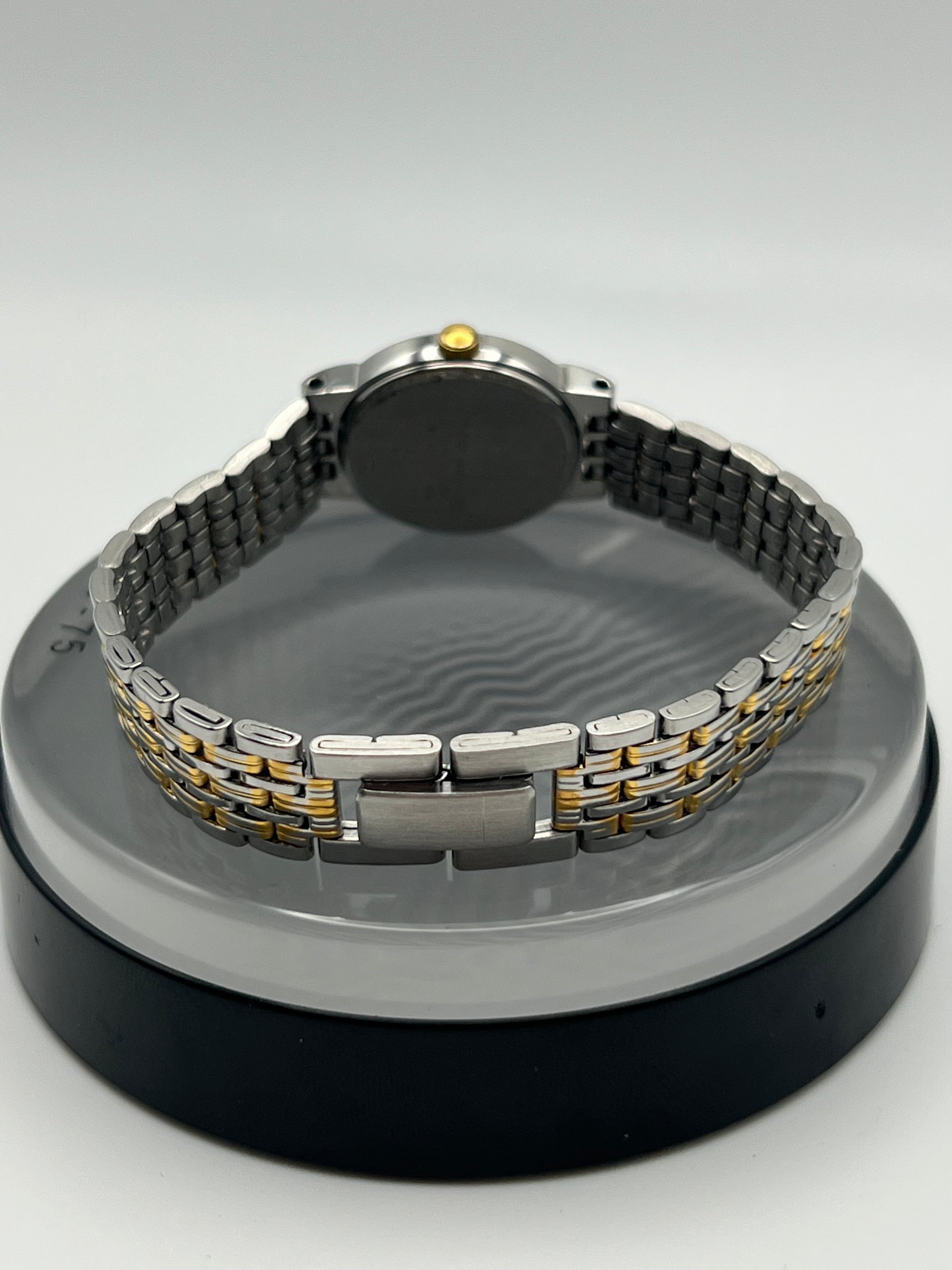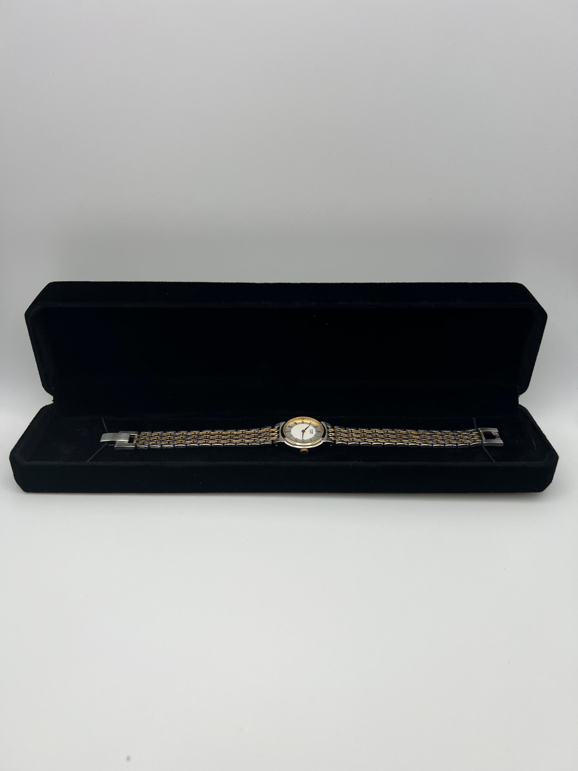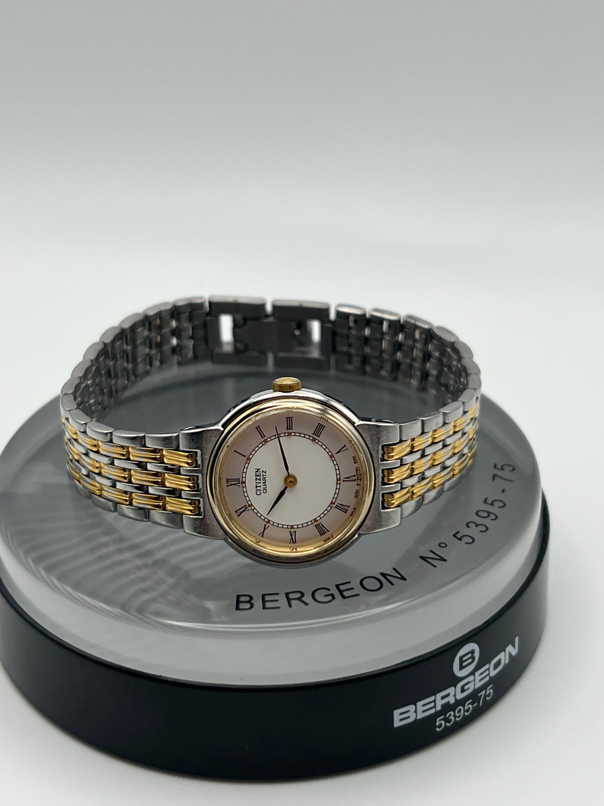 Timeless and elegant, this vintage 90’s Ladies Citizen 3220-S13271 Quartz 2-Tone blends classic design with reliable quartz accuracy. The gold and silver tones flow seamlessly together, creating a polished look that complements any outfit. The dial features clean markers and a matching handset, all framed by subtle Citizen Quartz branding. Powered by a dependable quartz movement, it keeps time accurately with minimal maintenance. Light surface wear consistent with age, fresh battery installed, and running smoothly. A versatile vintage piece that adds a touch of sophistication to everyday style.
