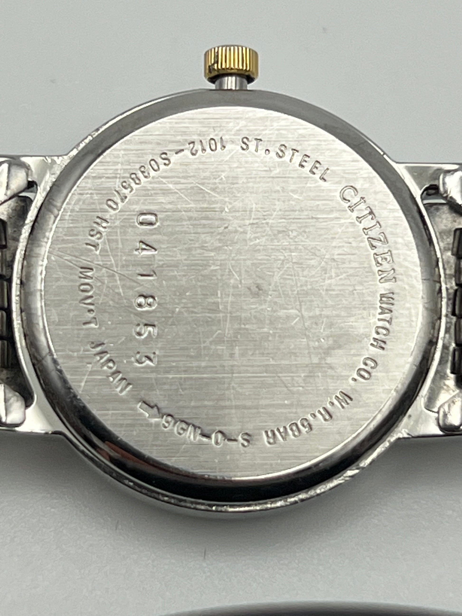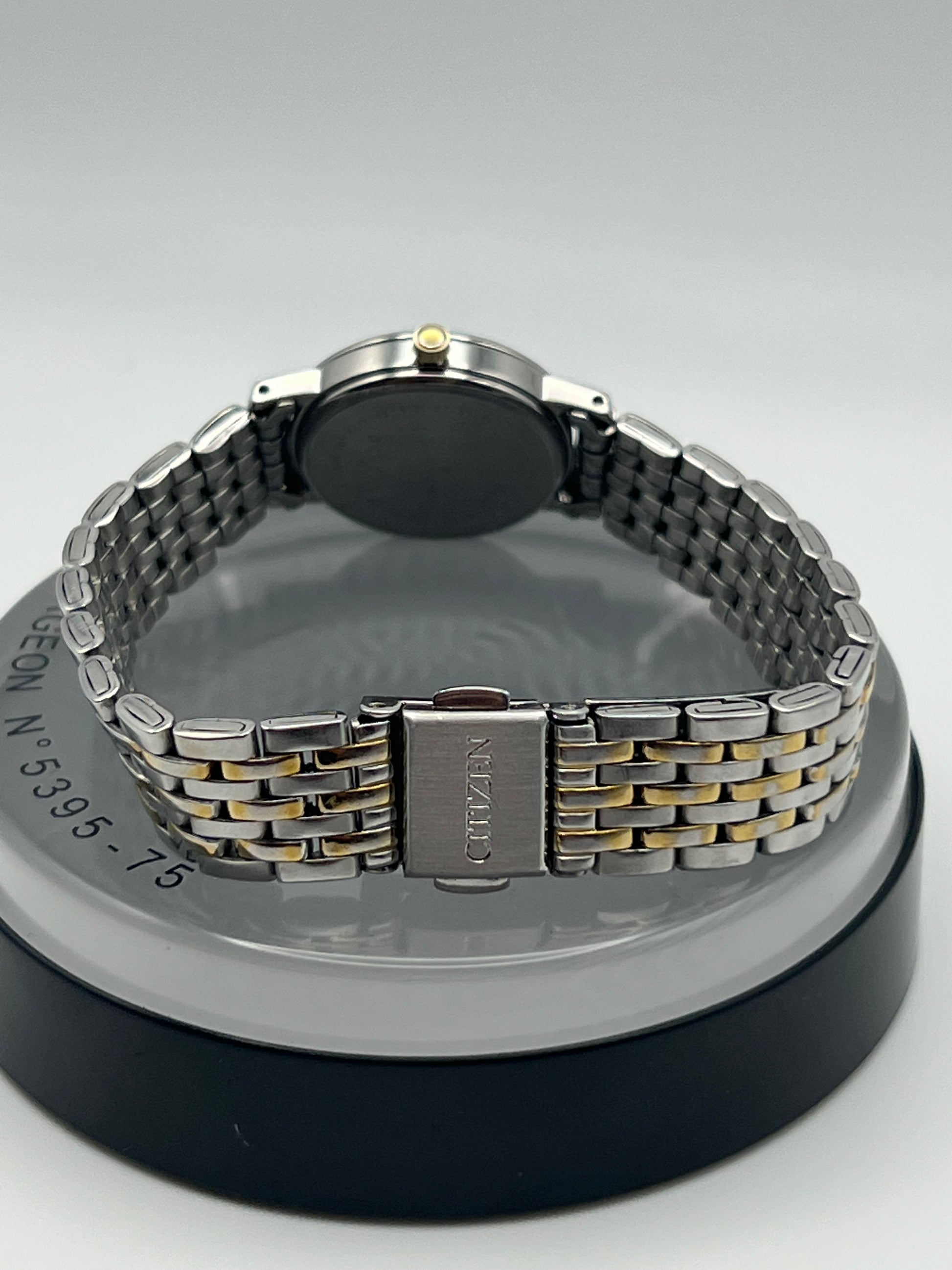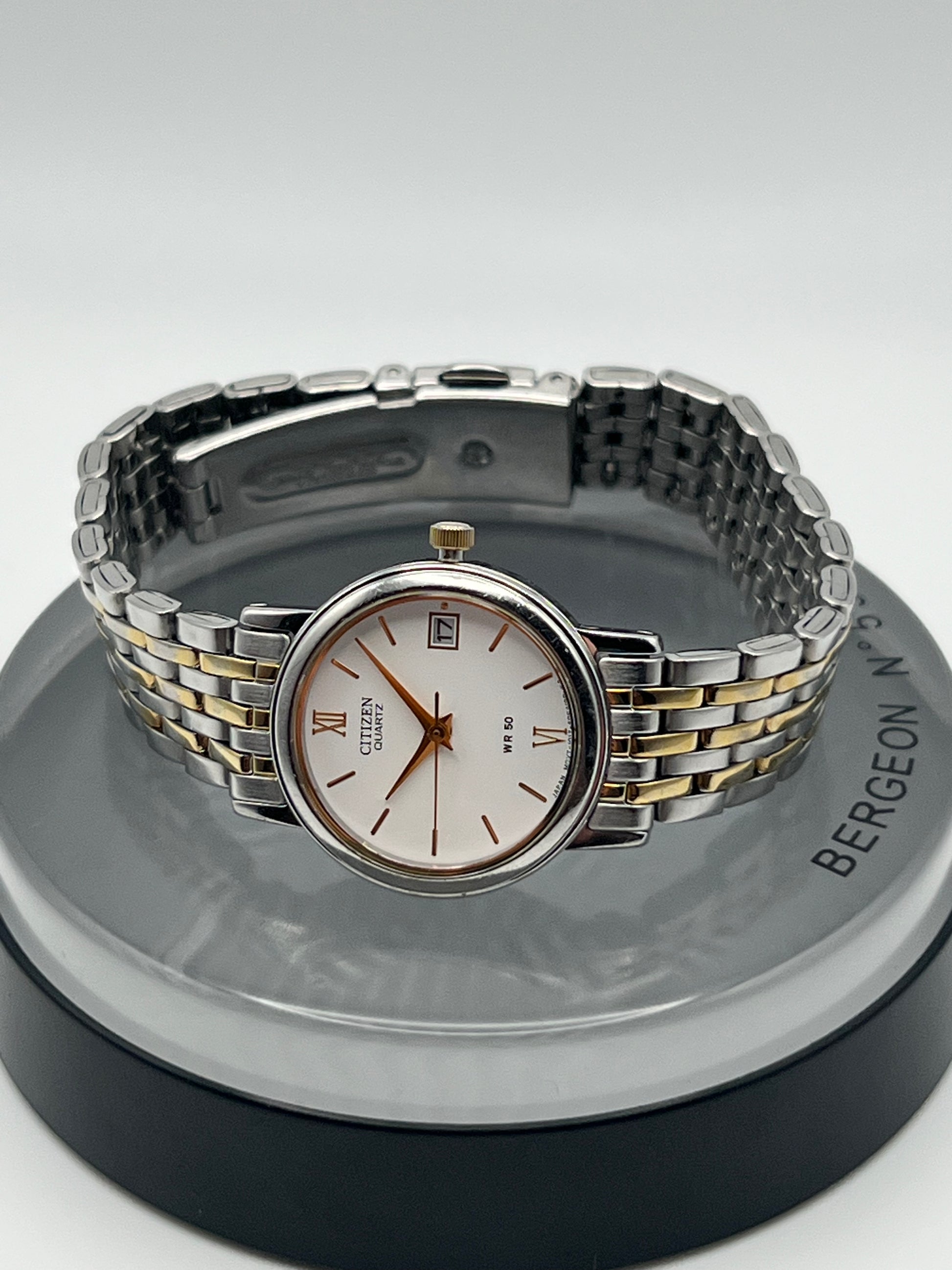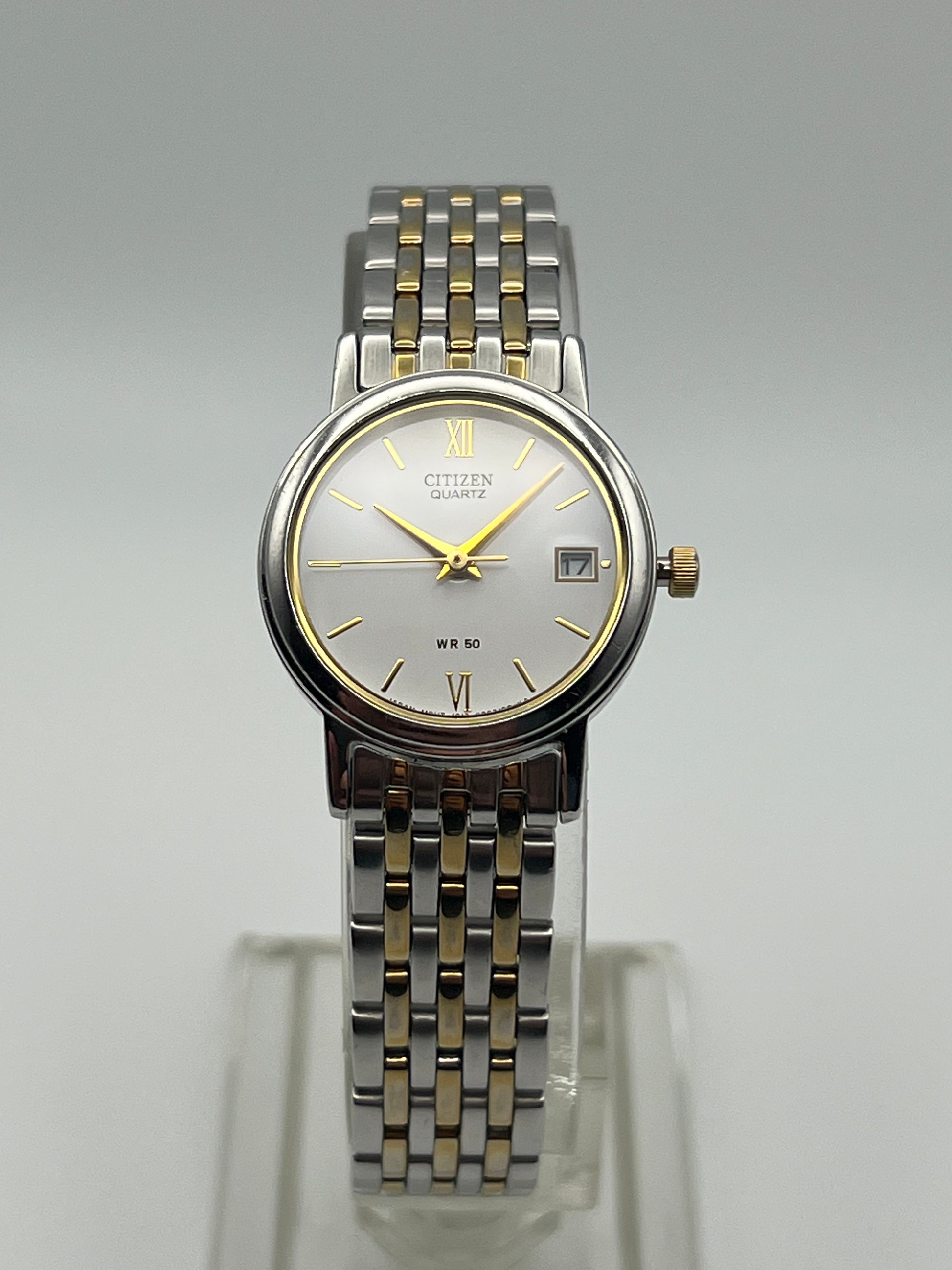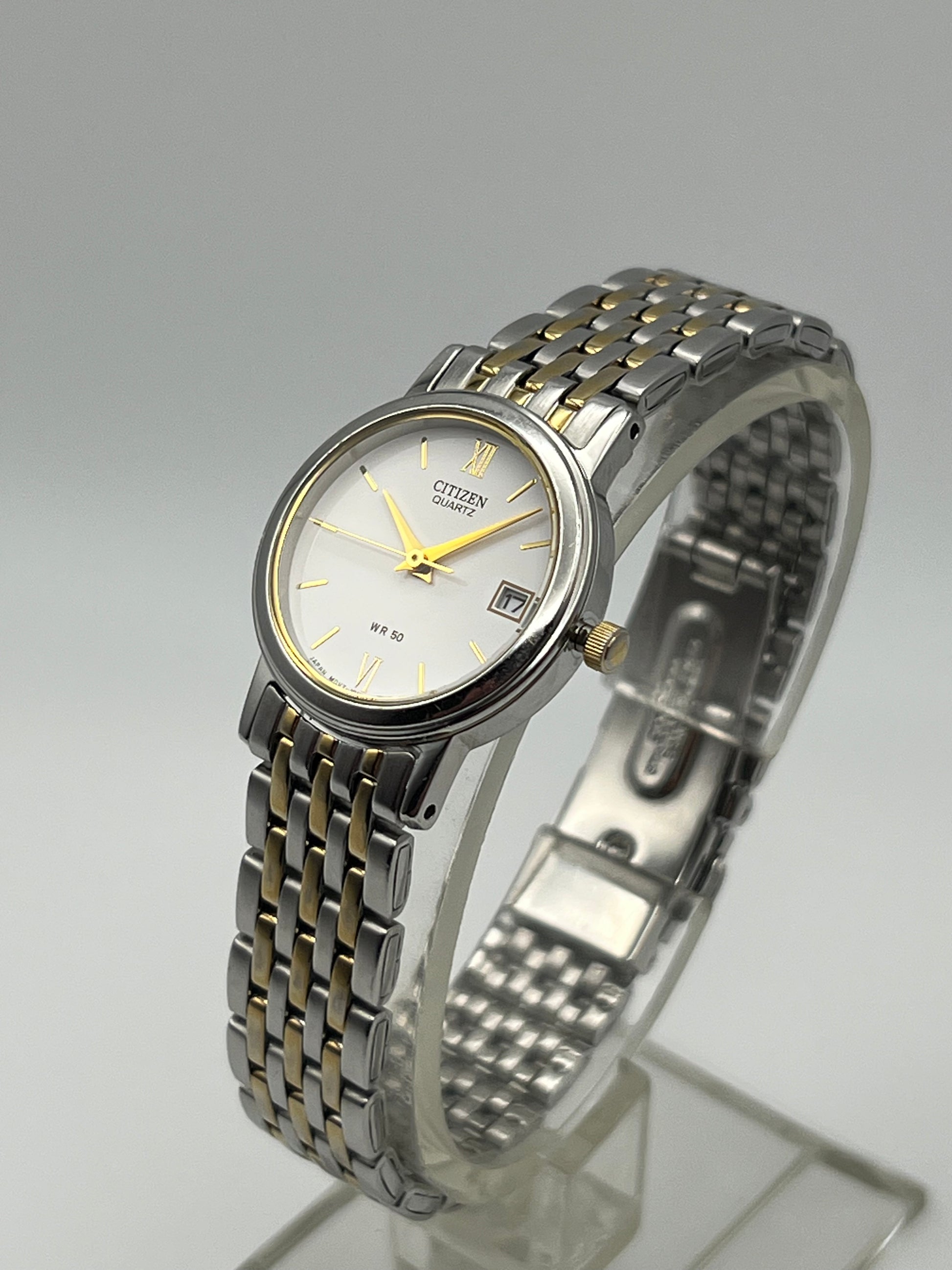 Stylish and effortless, this vintage Citizen 1012-S038570 blends graceful two-tone design with everyday reliability. The gold and silver finish gives it a polished, feminine look that pairs beautifully with both casual and dress outfits. The warm dial features slim gold markers and a refined handset, all framed by subtle Citizen Quartz branding. Powered by a dependable quartz movement with 50m water resistance, it offers practical elegance for daily wear.