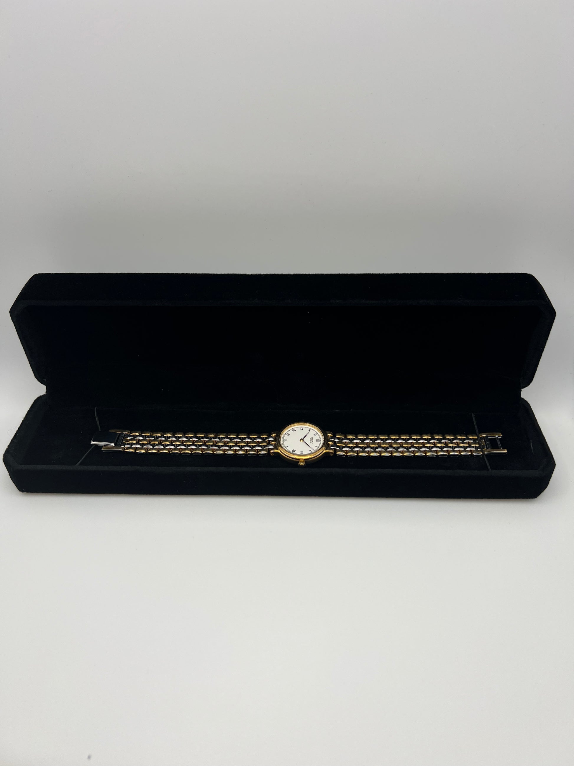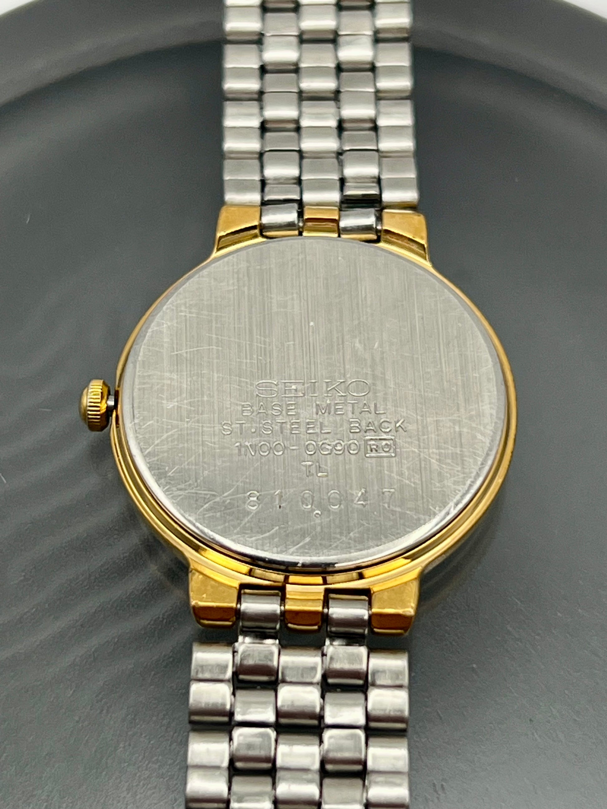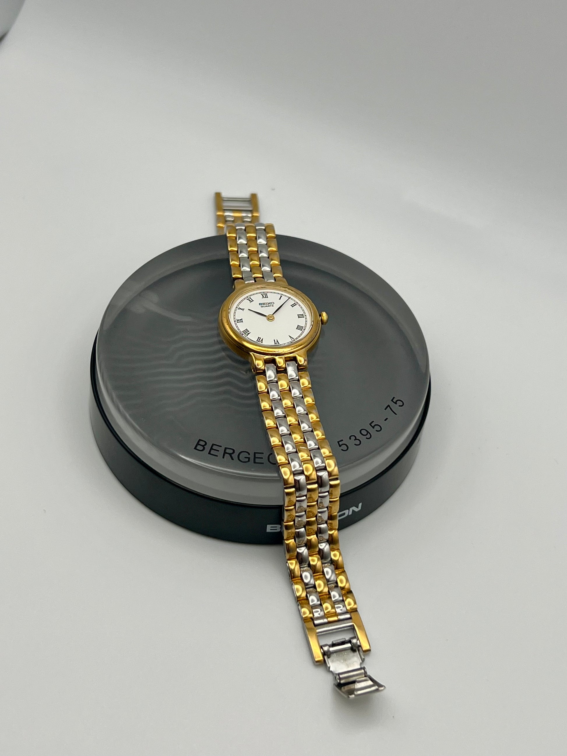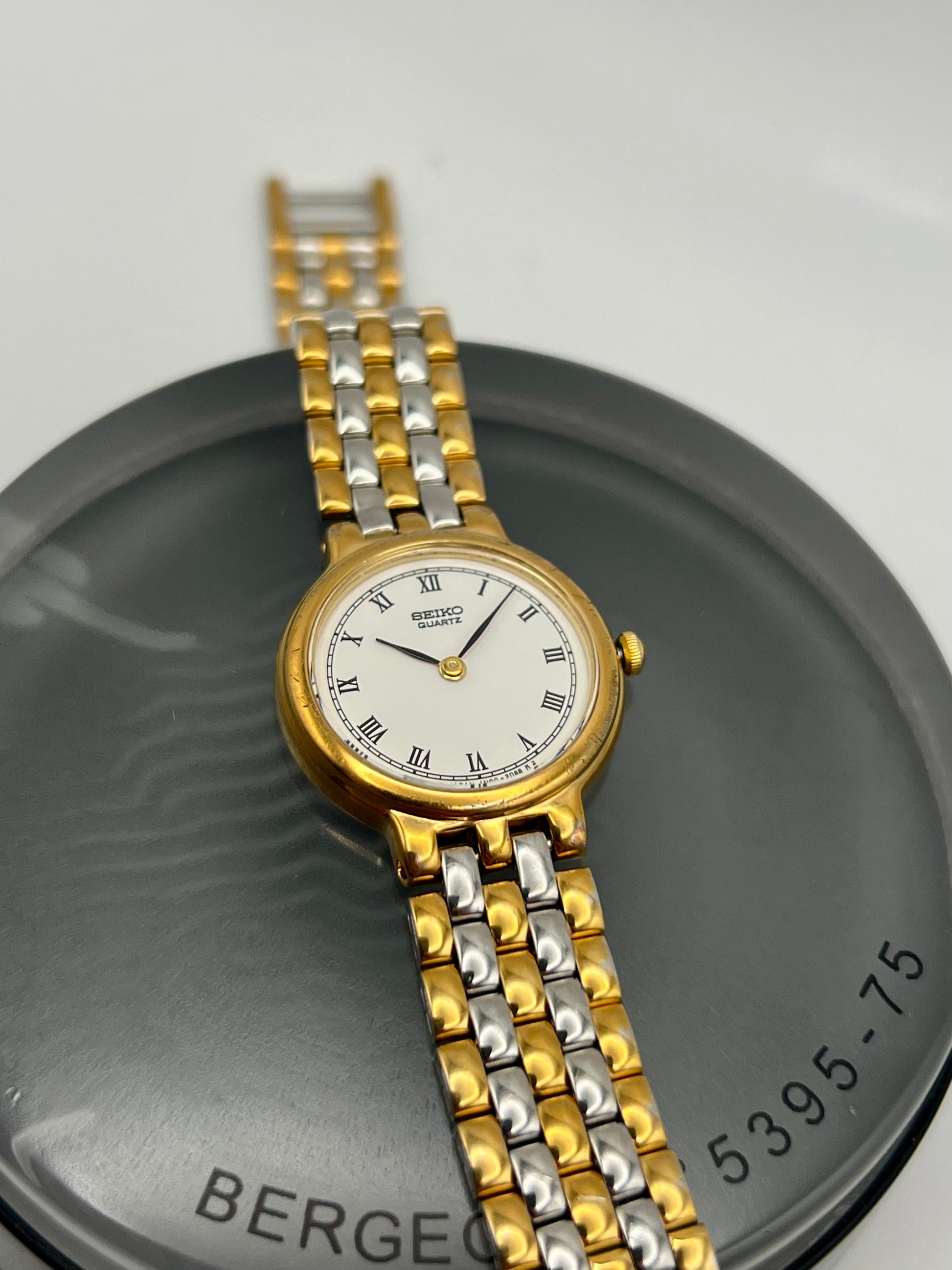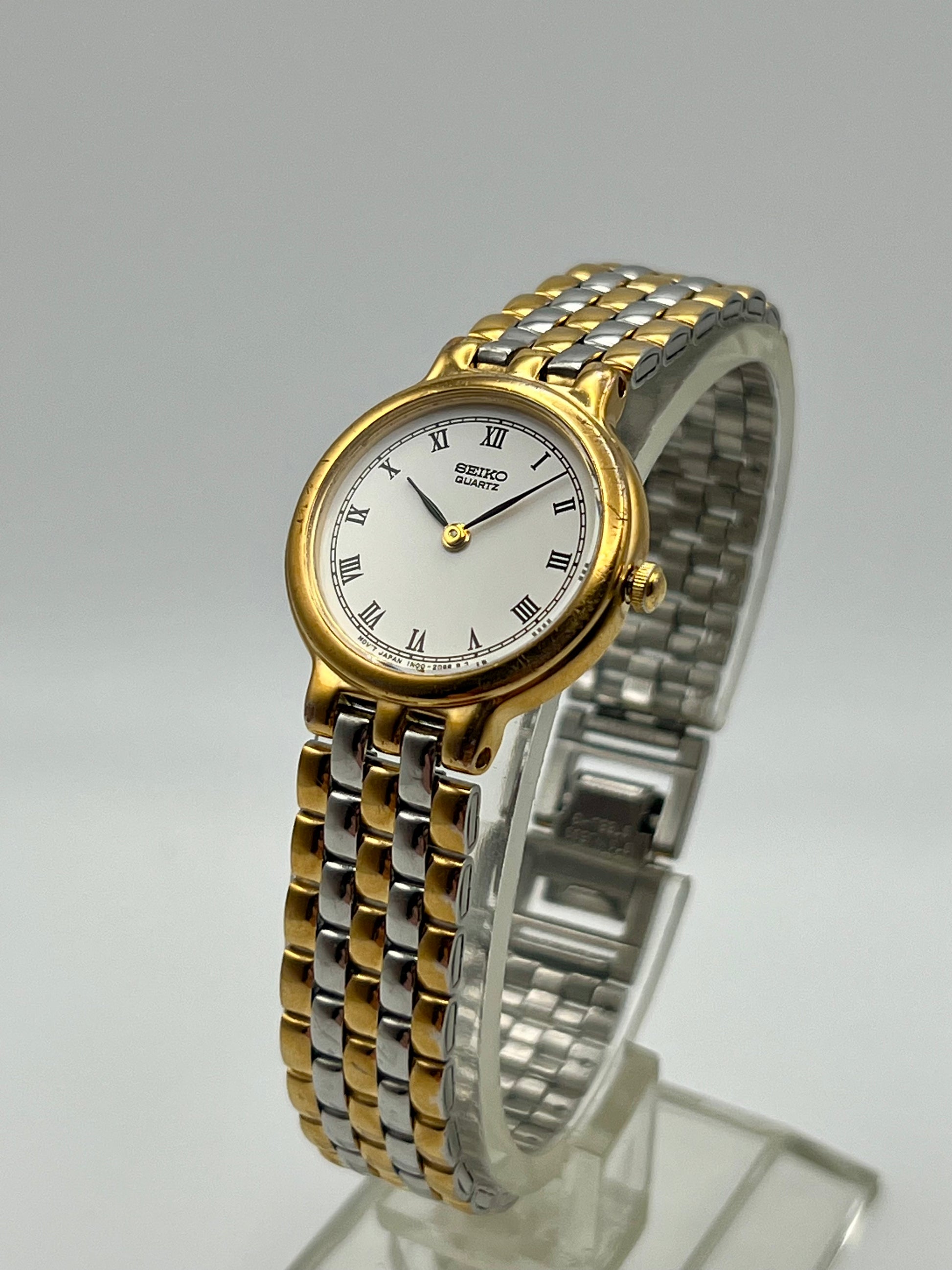 Beautifully preserved, this vintage Ladies Seiko 1N00-0G90 from the late 1990s blends timeless elegance with everyday reliability. The compact 23mm stainless steel case is paired with a gold-tone bezel that adds just the right amount of contrast. It flows seamlessly into the integrated five-link bracelet, creating a graceful and cohesive look on the wrist. The clean white dial features and the classic Seiko Quartz signature, offering a refined balance of simplicity and style. Inside, Seiko’s dependable 1N00 quartz movement keeps time accurately and effortlessly, making it a reliable companion for years to come.