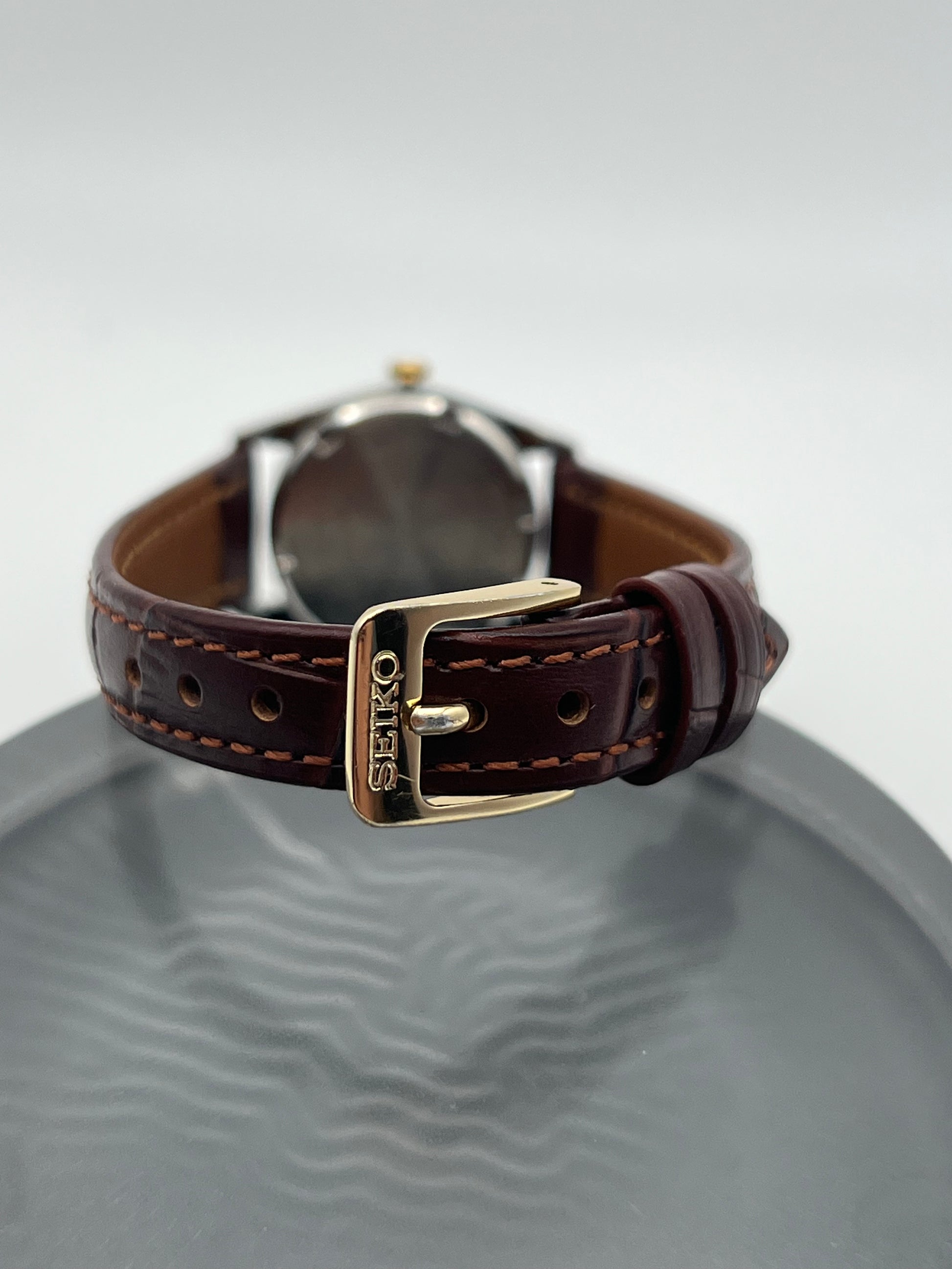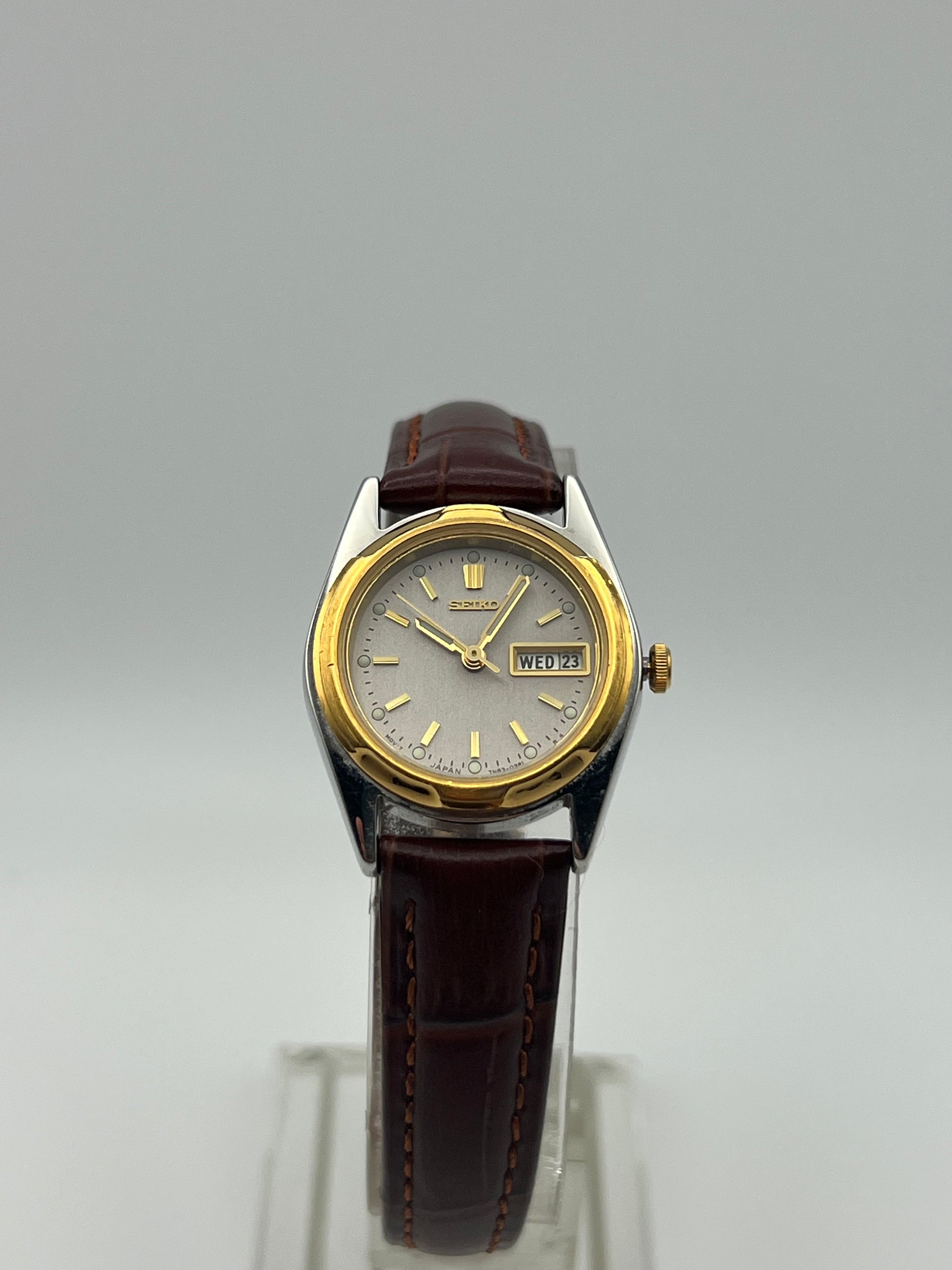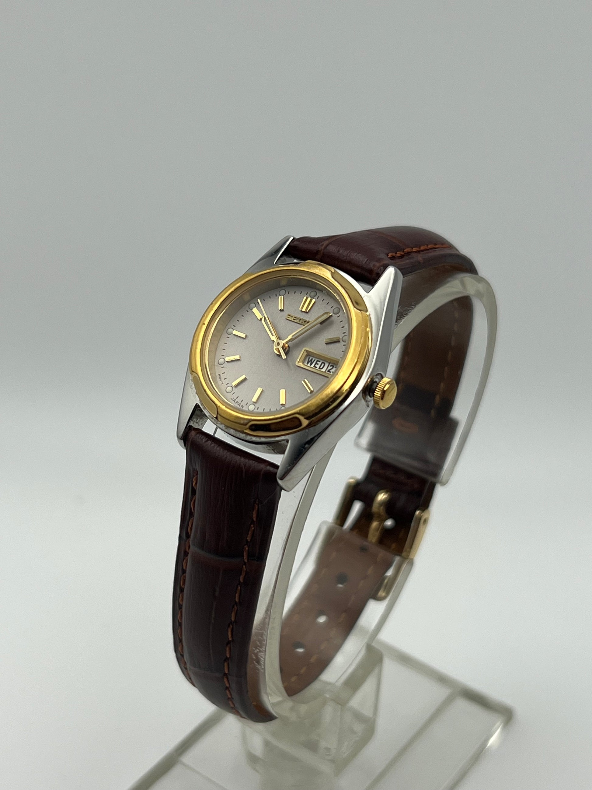 Classic charm meets reliable precision in this Ladies Seiko 7N83 0169 quartz from the 1990s. The 25mm stainless steel case is paired with a two-tone gold bezel and new brown leather strap for a clean, elegant finish. The ivory dial features gold-tone markers, a matching handset, and a framed day-date window at three o’clock. Subtle Seiko Quartz branding completes the look. Inside, the 7N83 quartz movement delivers accurate, low-maintenance timekeeping with full calendar functionality. Light wear consistent with age, fresh battery installed, and includes the original gold-tone Seiko buckle.