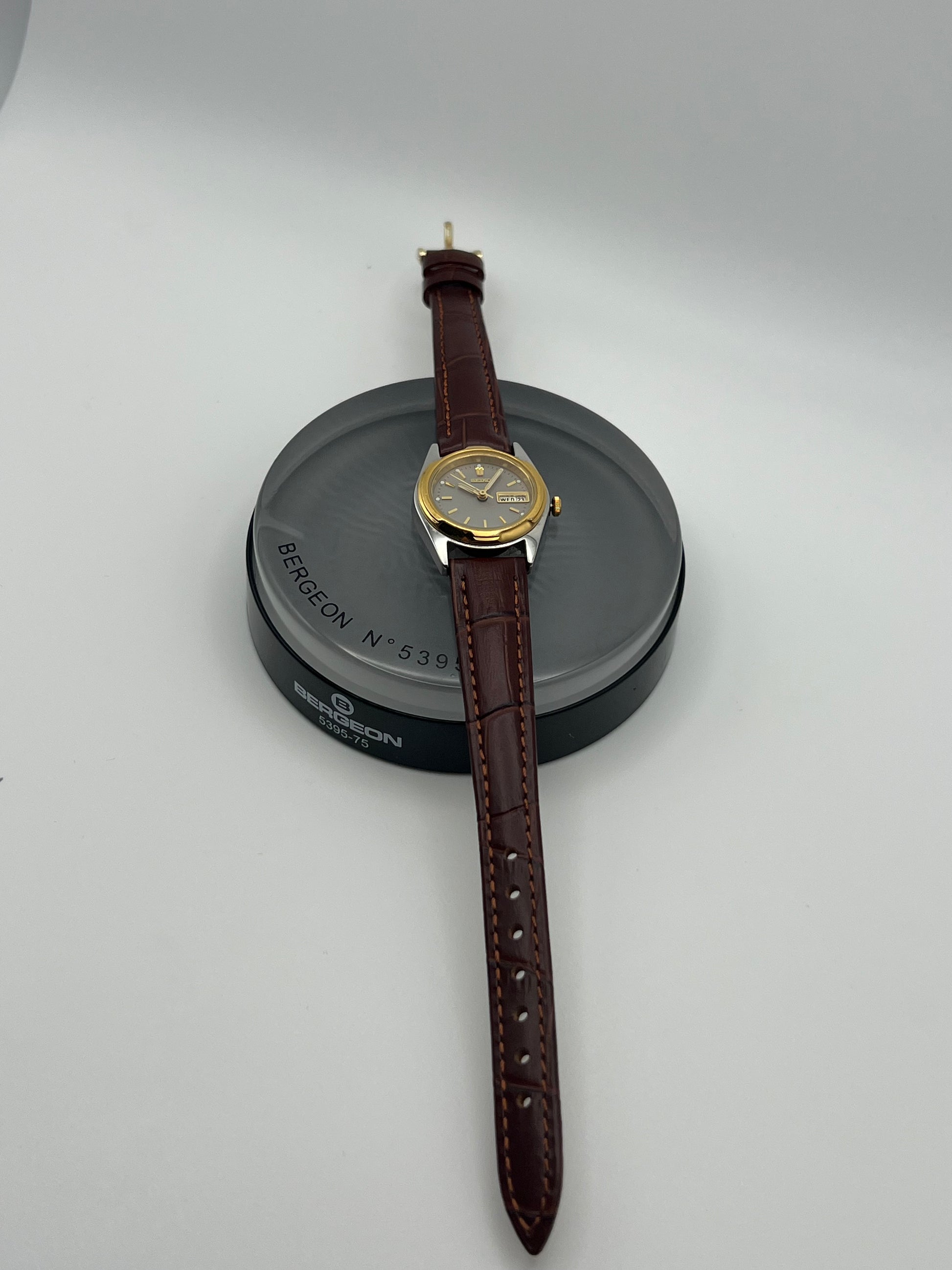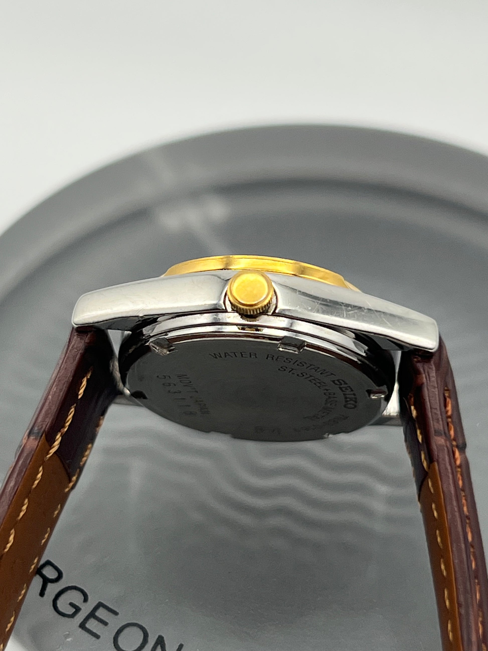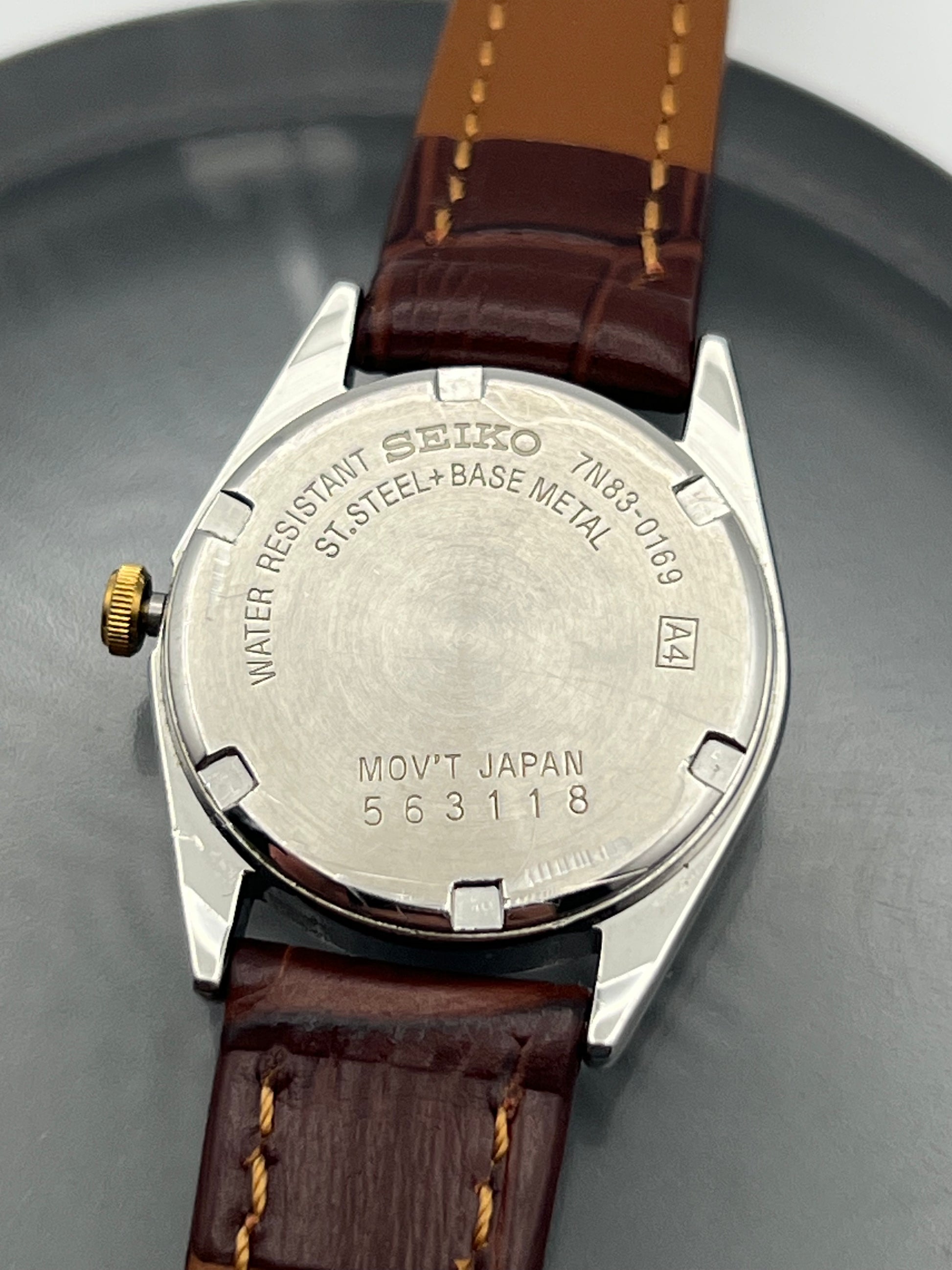 Classic charm meets reliable precision in this Ladies Seiko 7N83 0169 quartz from the 1990s. The 25mm stainless steel case is paired with a two-tone gold bezel and new brown leather strap for a clean, elegant finish. The ivory dial features gold-tone markers, a matching handset, and a framed day-date window at three o’clock. Subtle Seiko Quartz branding completes the look. Inside, the 7N83 quartz movement delivers accurate, low-maintenance timekeeping with full calendar functionality. Light wear consistent with age, fresh battery installed, and includes the original gold-tone Seiko buckle.