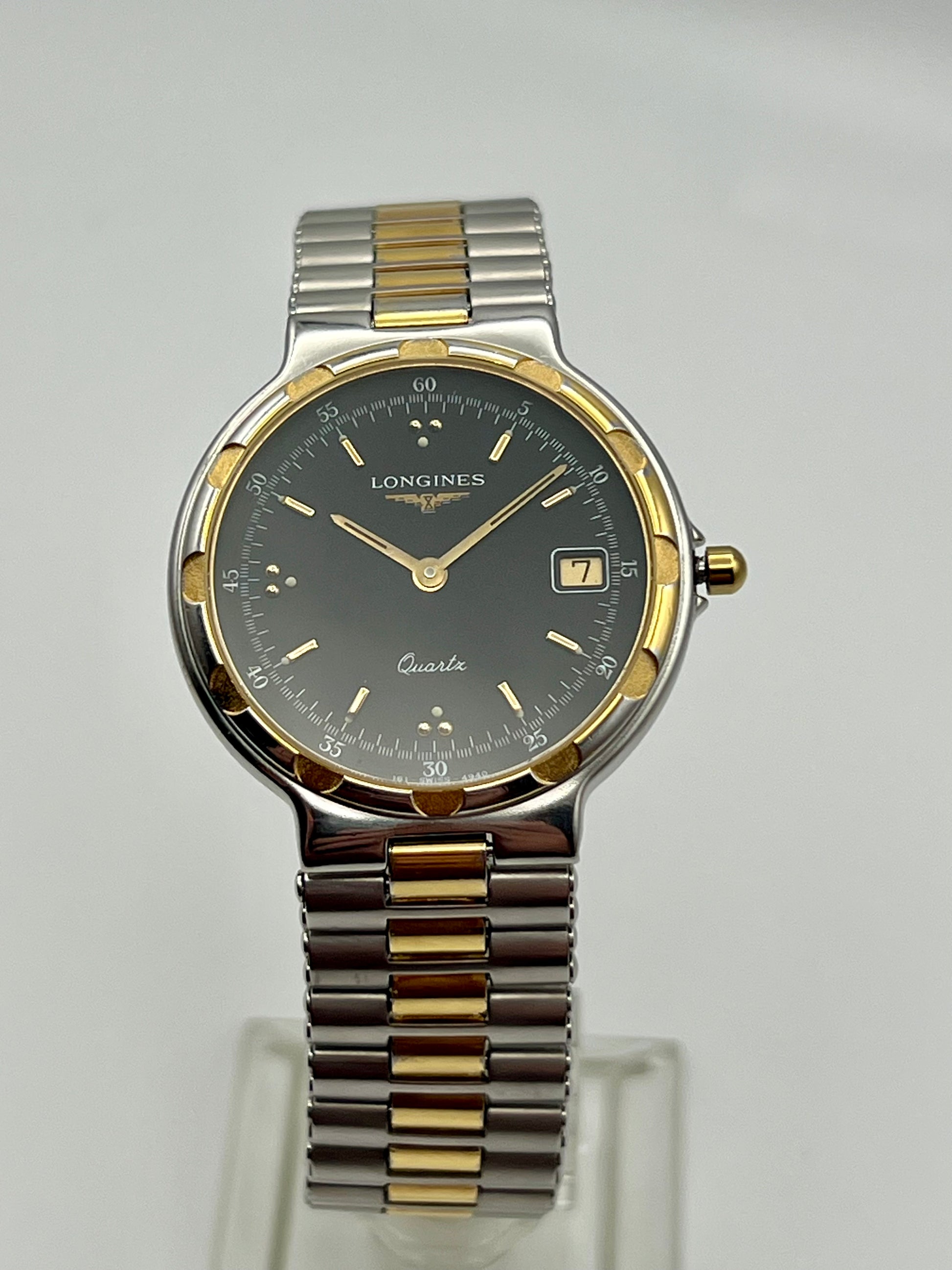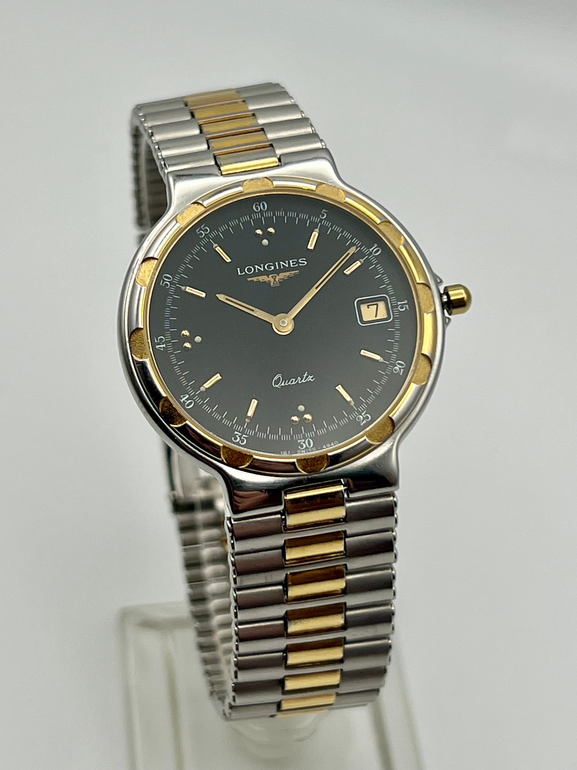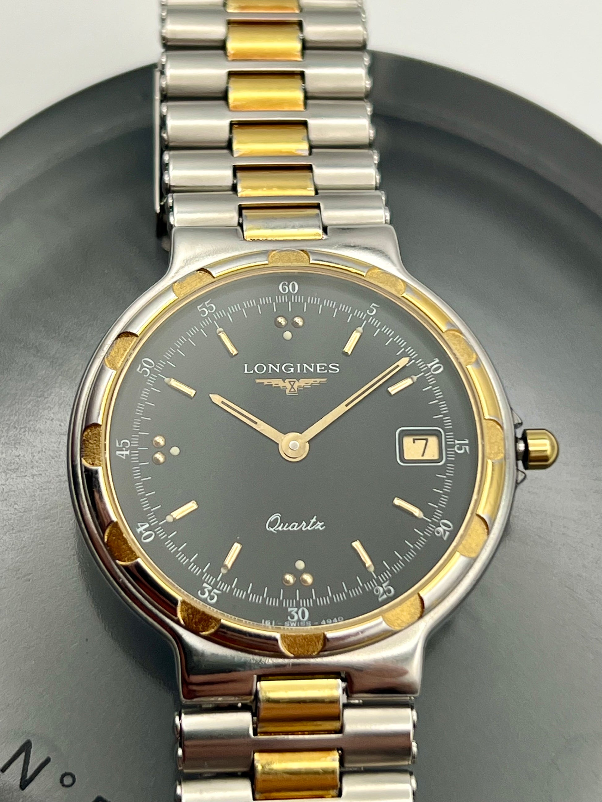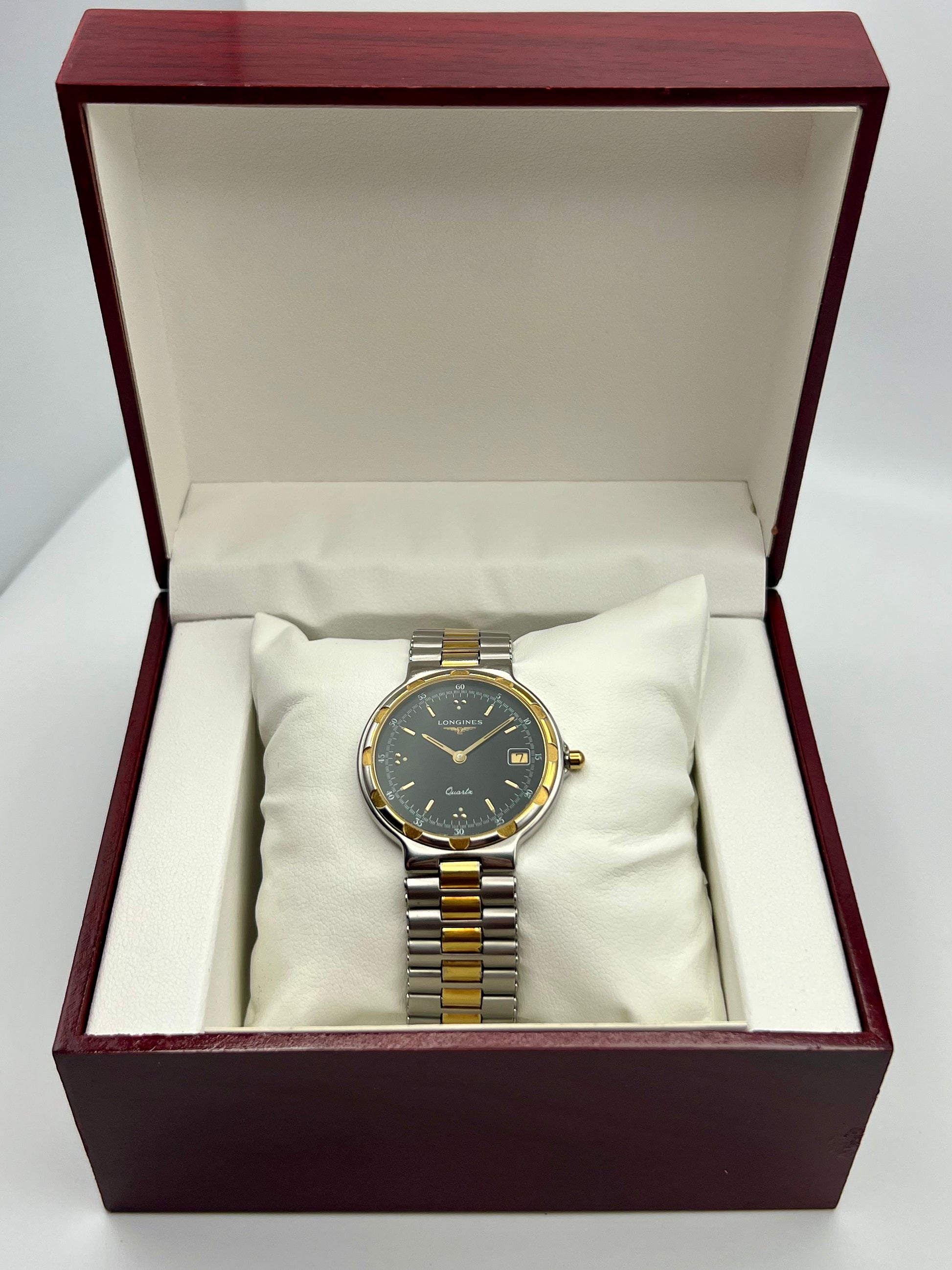 This perfectly preserved Longines Conquest Quartz Ref. 4940, a refined two tone classic from the quartz era. The 32mm stainless steel case features a brushed bezel with alternating polished and textured gold segments, complemented by an integrated bracelet for a cohesive design. The original charcoal dial includes applied gold tone indices, a beveled date window at three o’clock, and a gold tone handset with black inserts. Powered by the reliable Longines Caliber L161.2 quartz movement and finished with a signed snap on Conquest caseback, this watch offers timeless style with dependable performance.