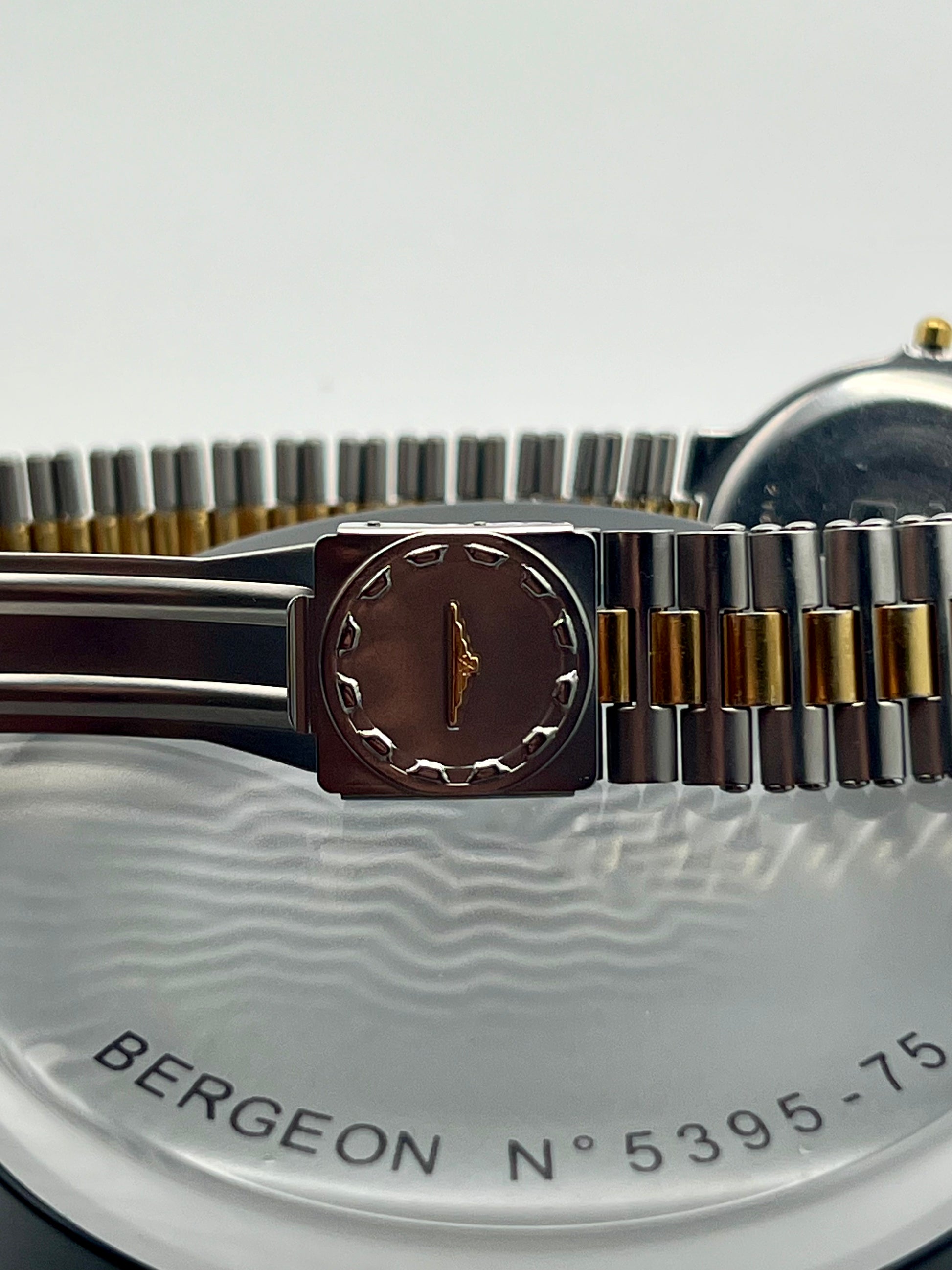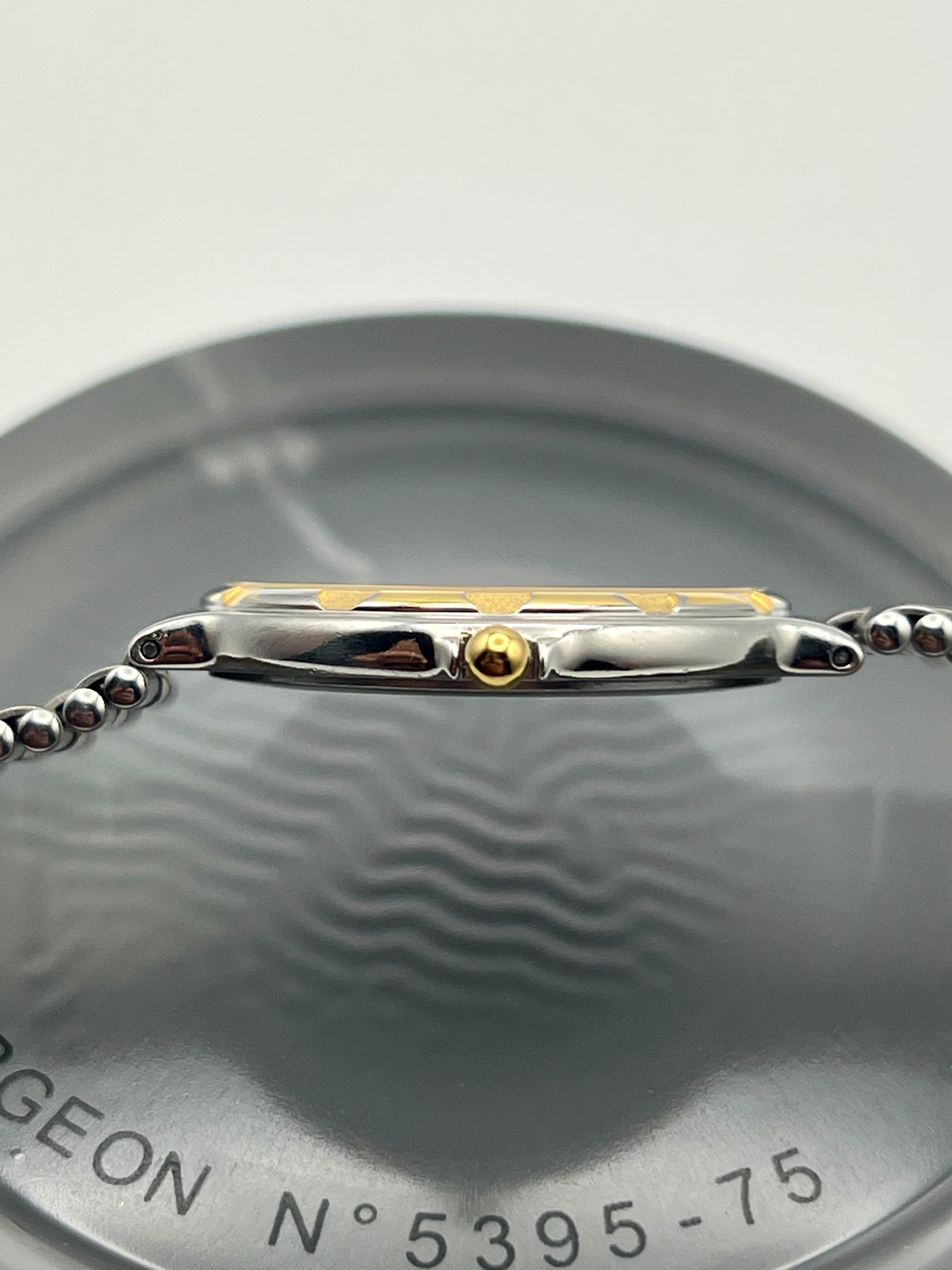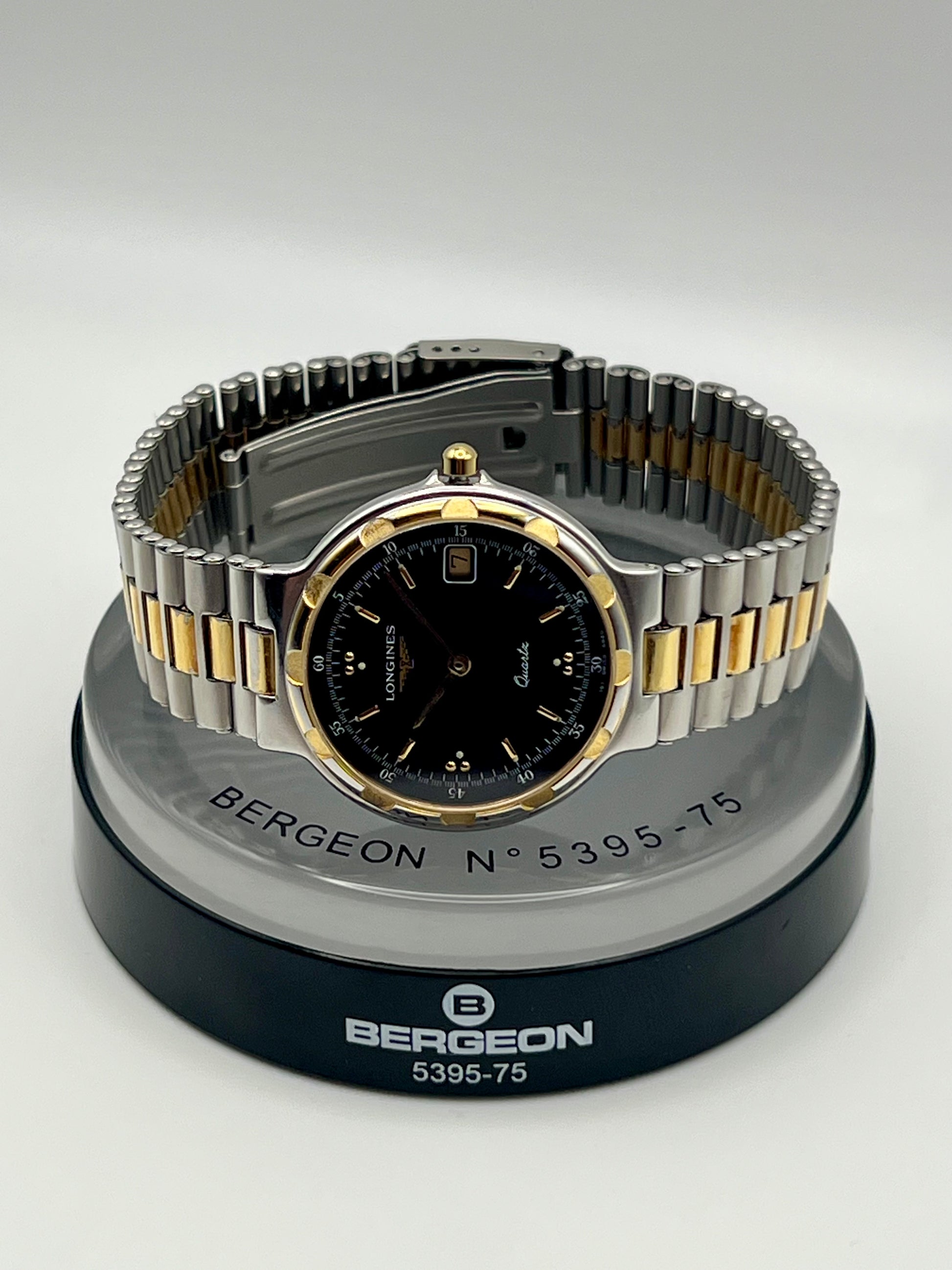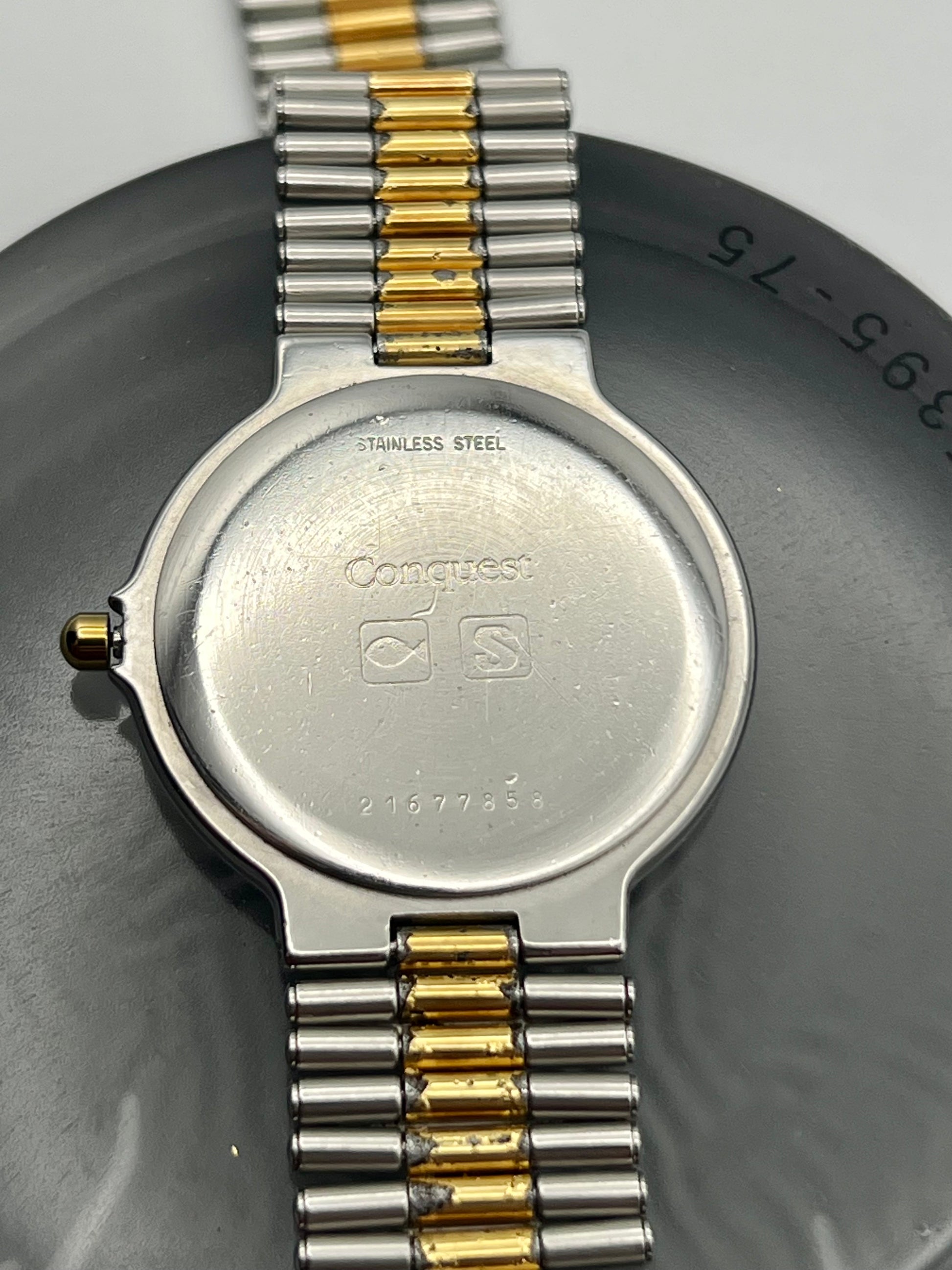 This perfectly preserved Longines Conquest Quartz Ref. 4940, a refined two tone classic from the quartz era. The 32mm stainless steel case features a brushed bezel with alternating polished and textured gold segments, complemented by an integrated bracelet for a cohesive design. The original charcoal dial includes applied gold tone indices, a beveled date window at three o’clock, and a gold tone handset with black inserts. Powered by the reliable Longines Caliber L161.2 quartz movement and finished with a signed snap on Conquest caseback, this watch offers timeless style with dependable performance.