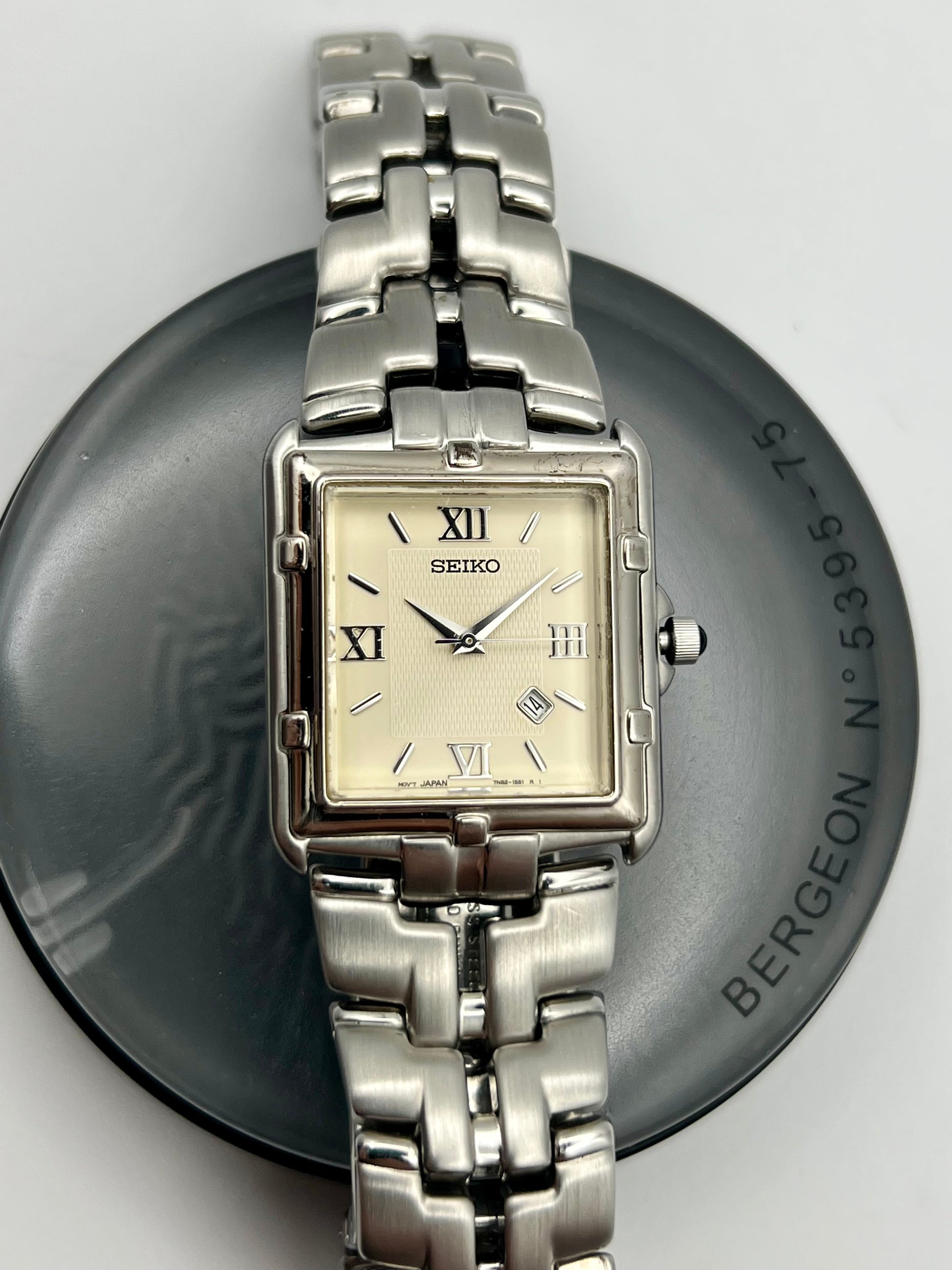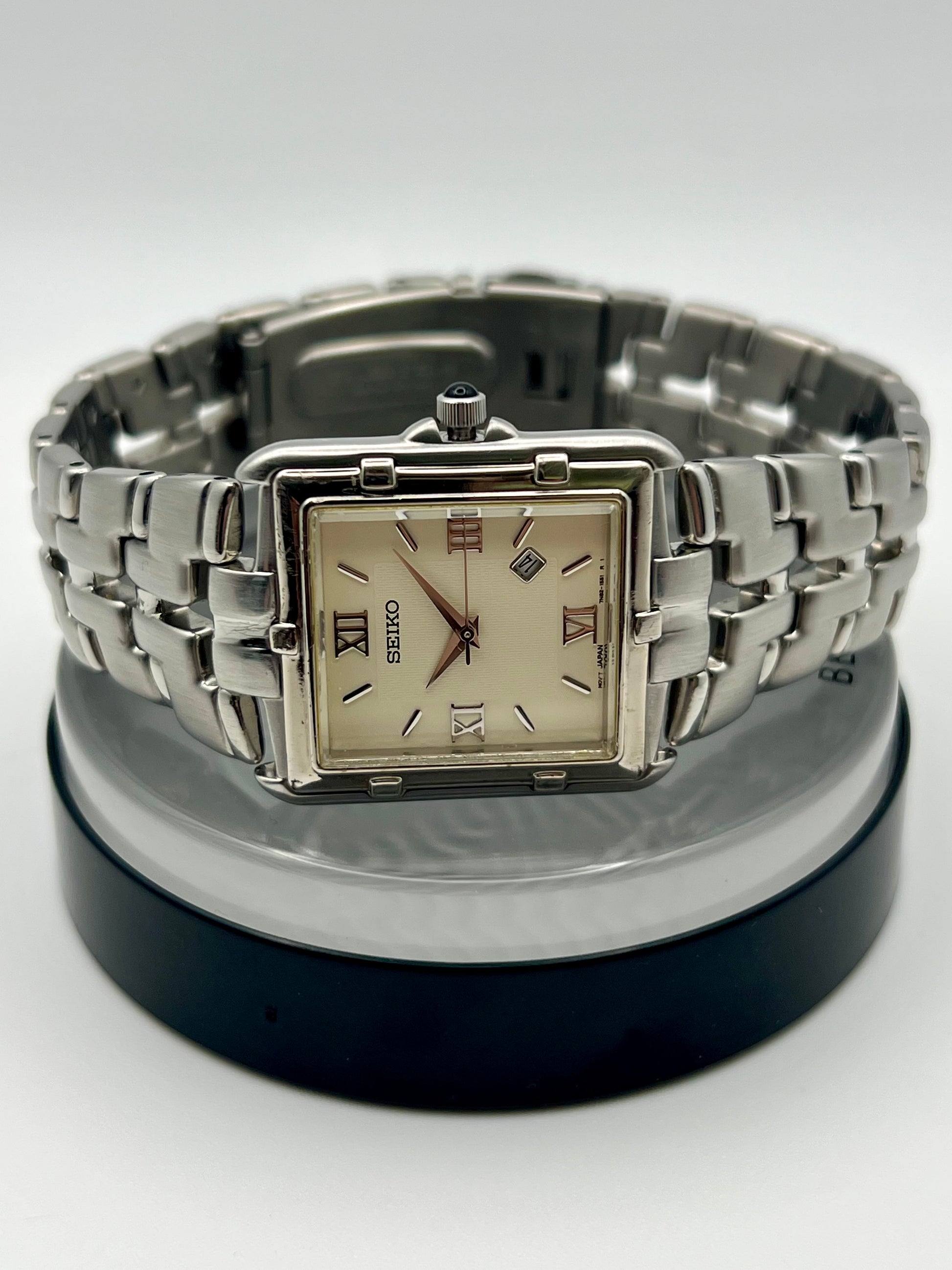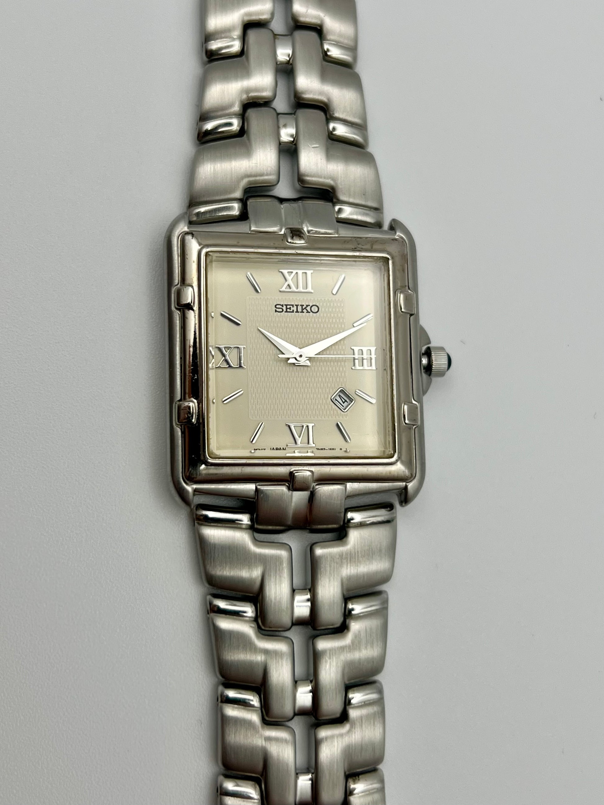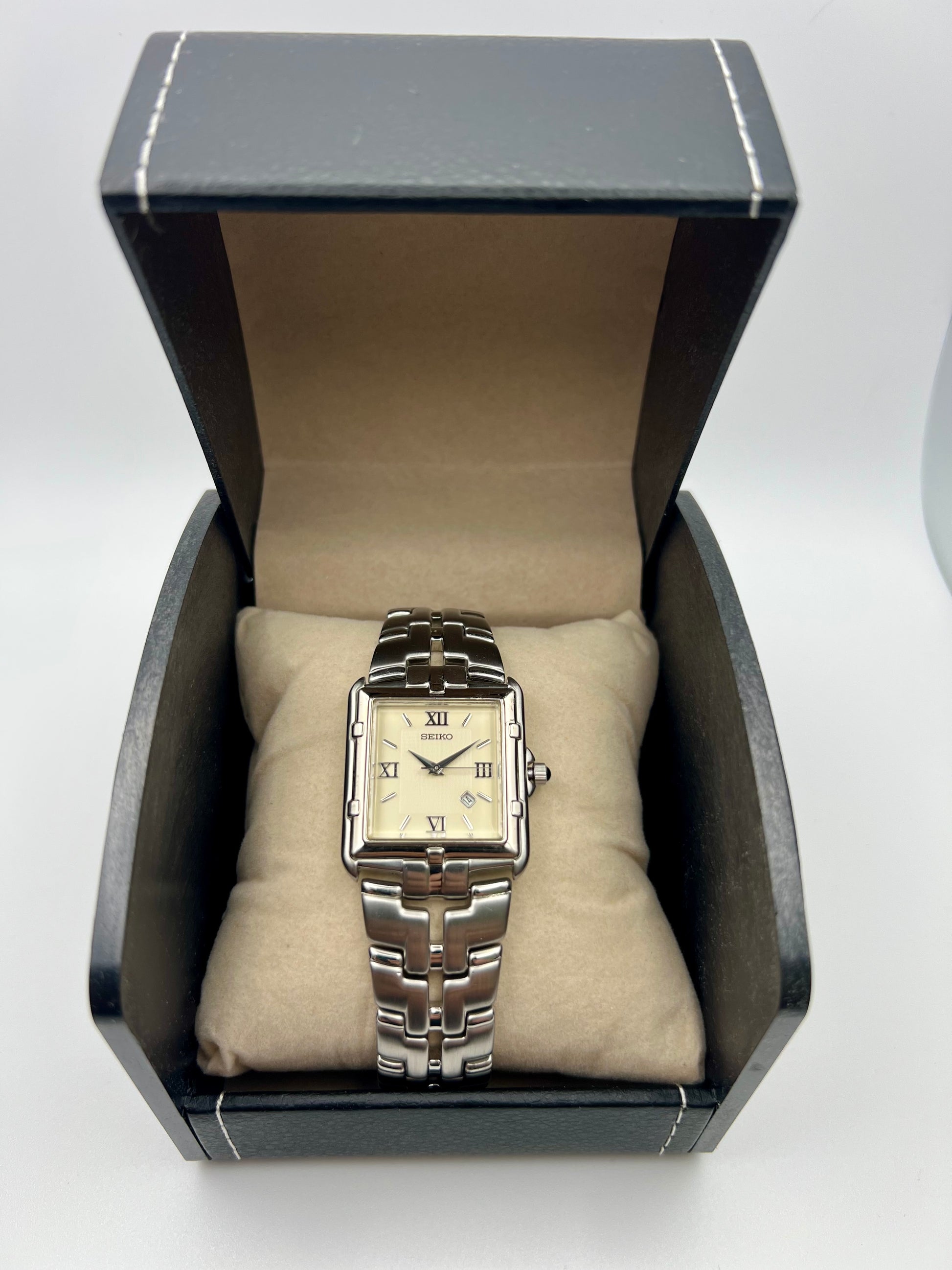 Refined and timeless, this 1997 Seiko Tank 7N82 5049 delivers a classic look with everyday reliability. The rectangular gold tone case frames a clean white dial with bold Roman numerals and a discreet date window at 4:30, giving it a non-traditional style that works for both formal and casual settings.