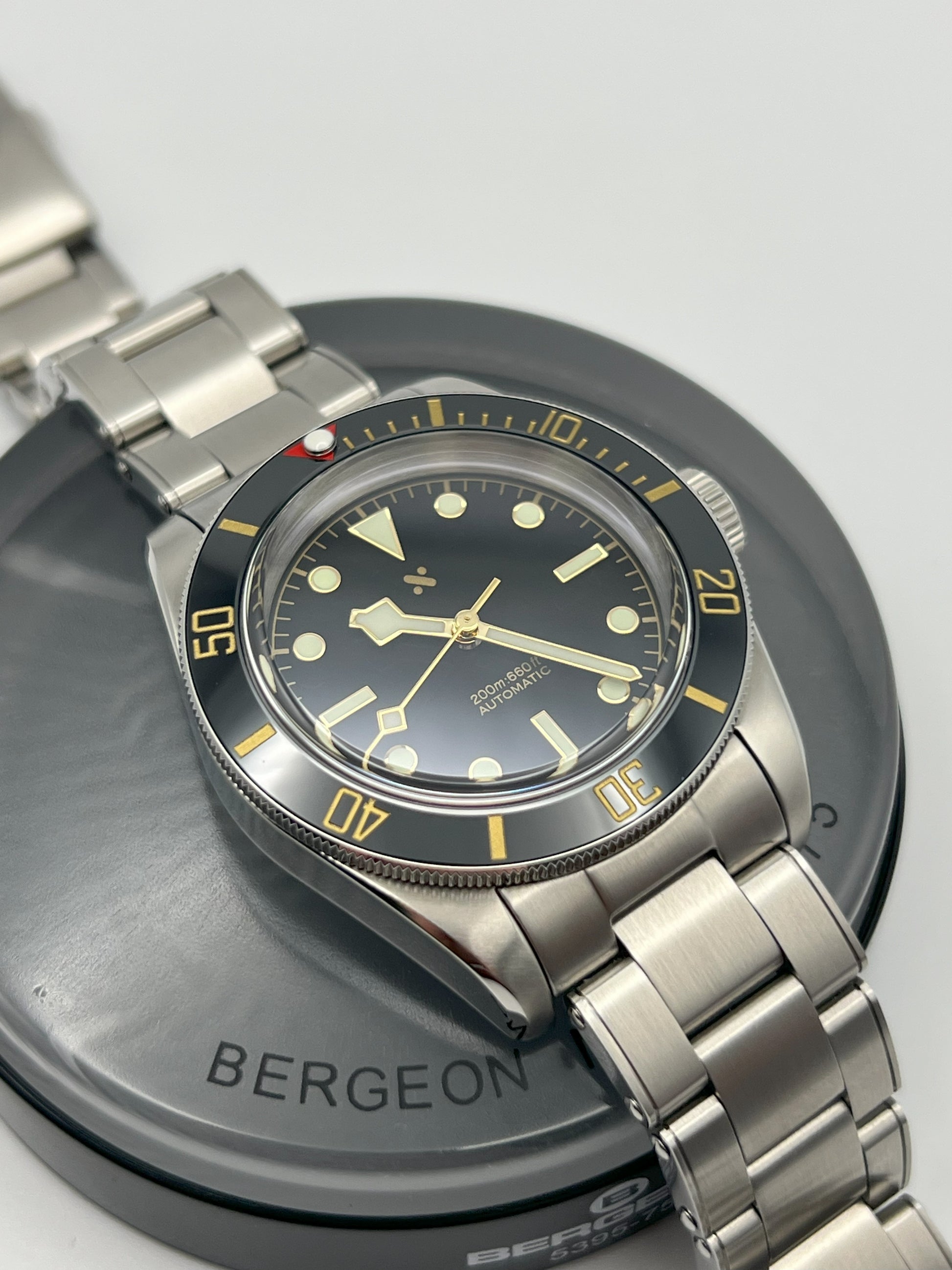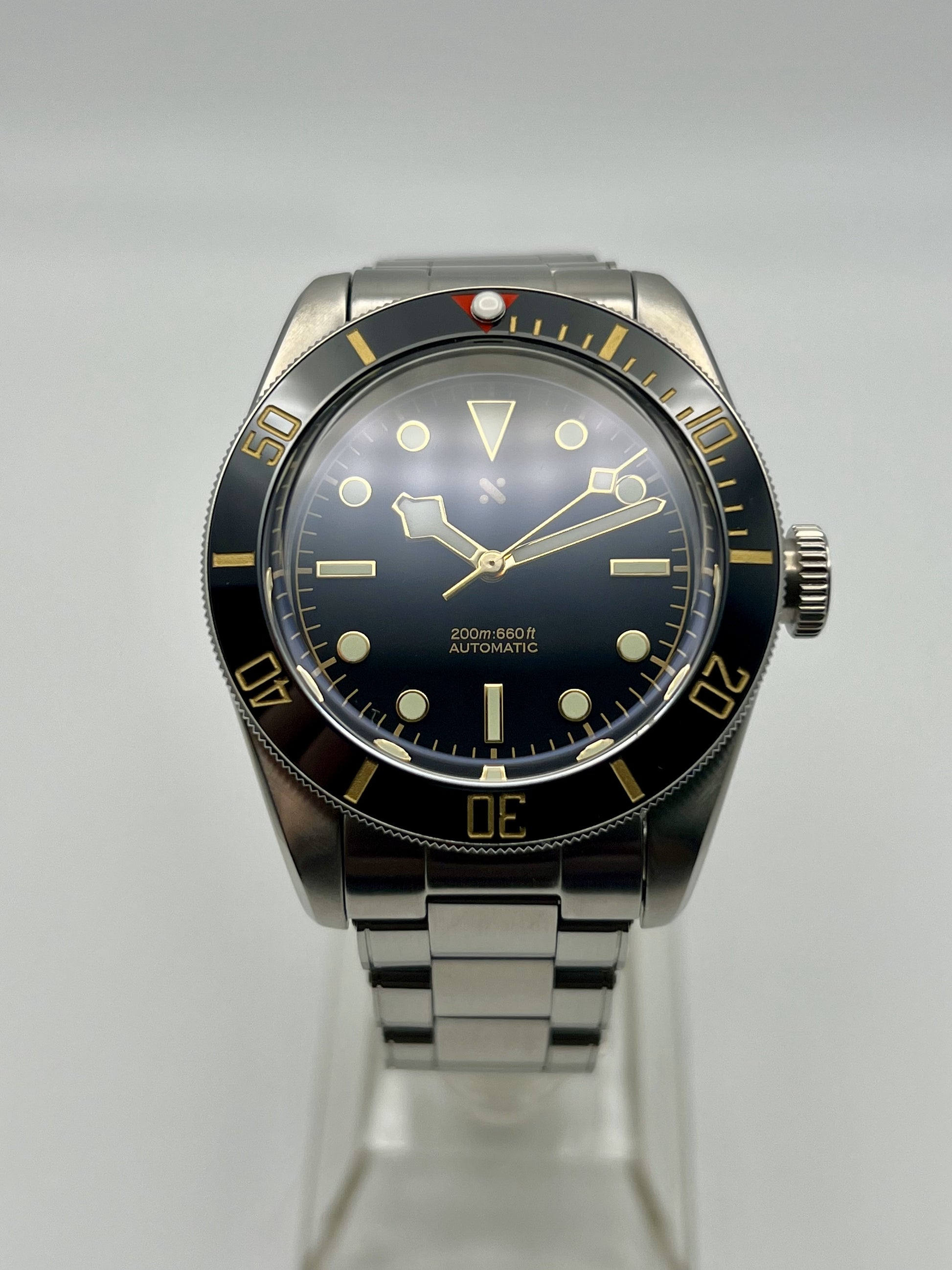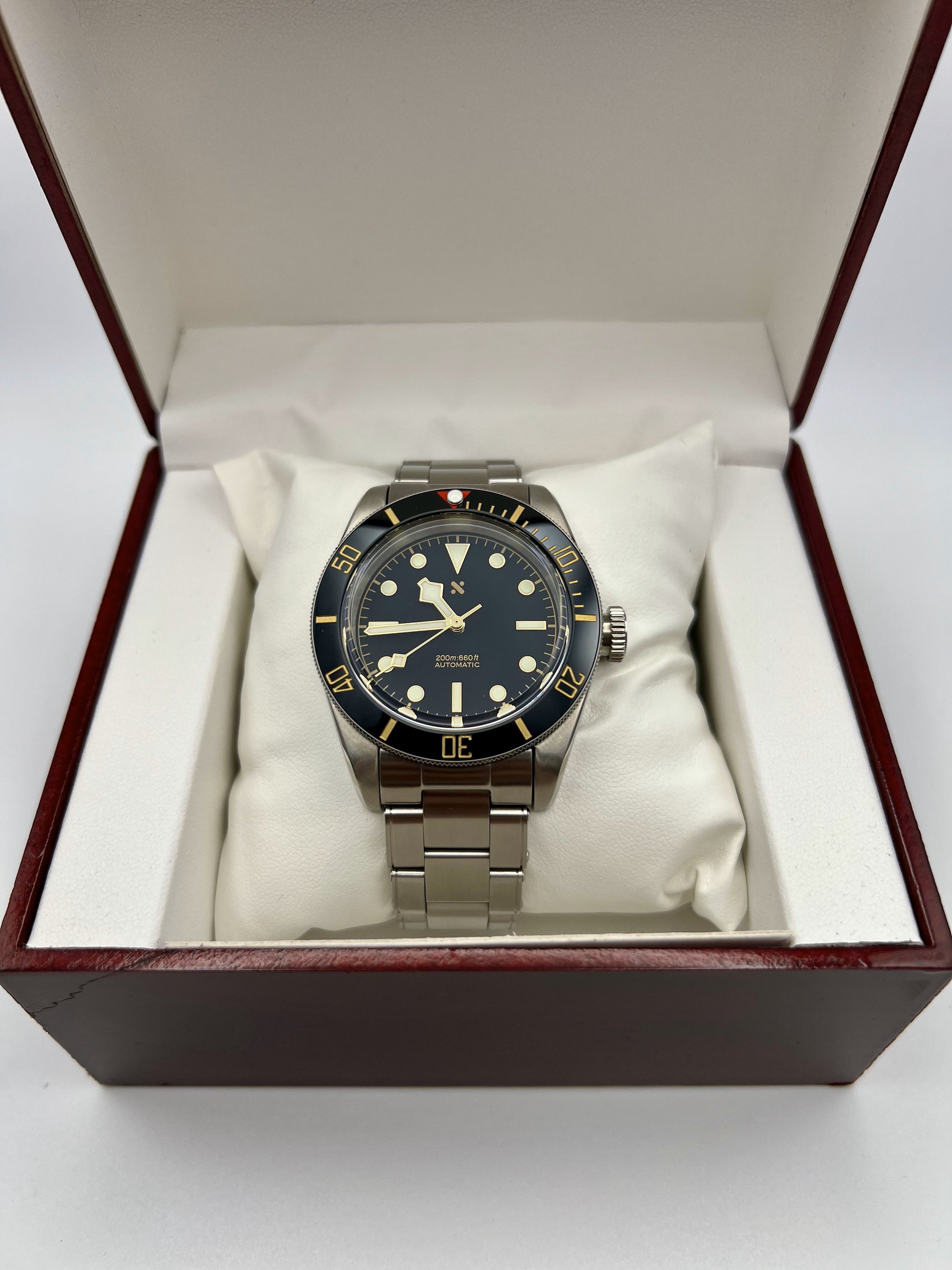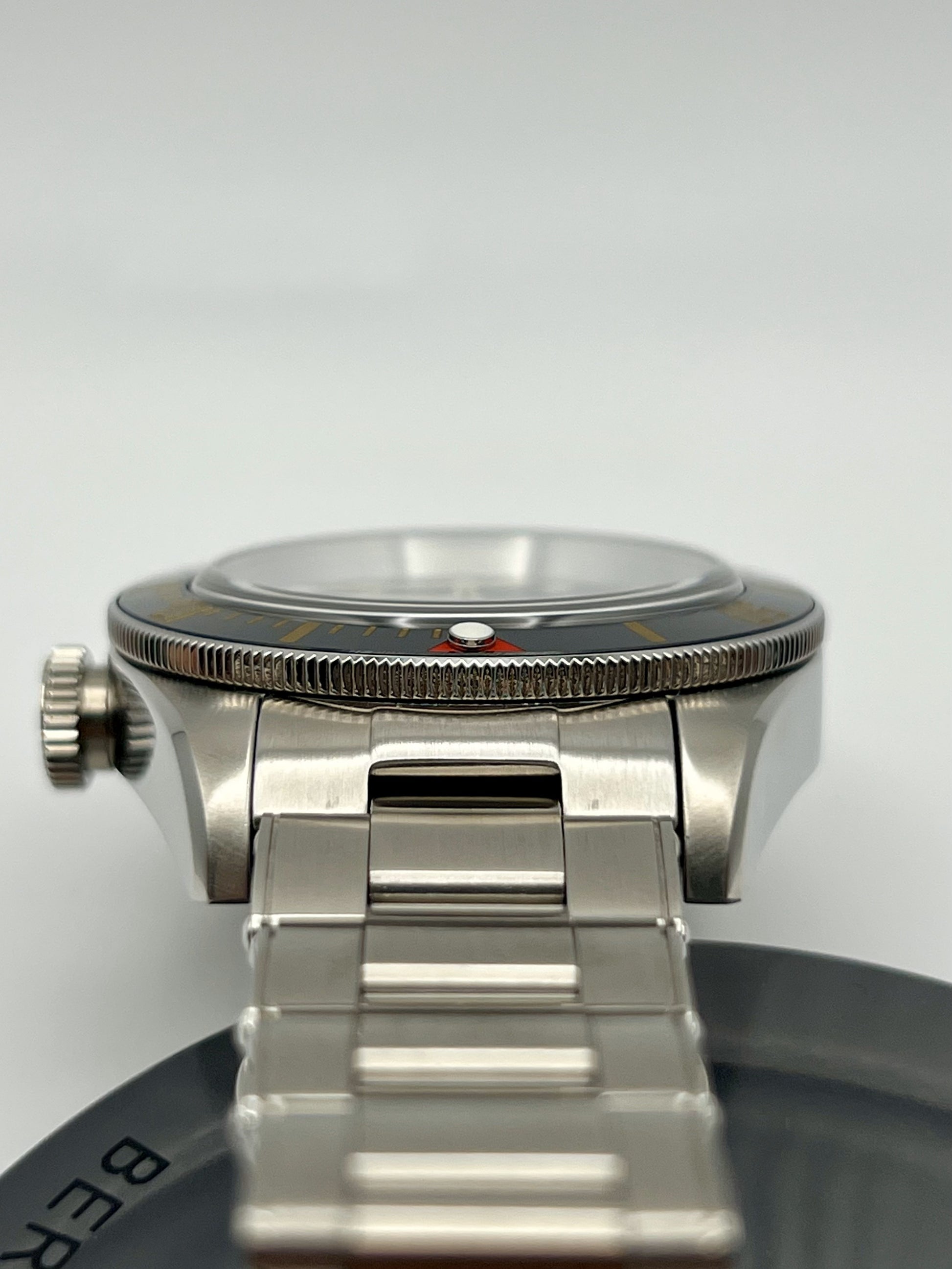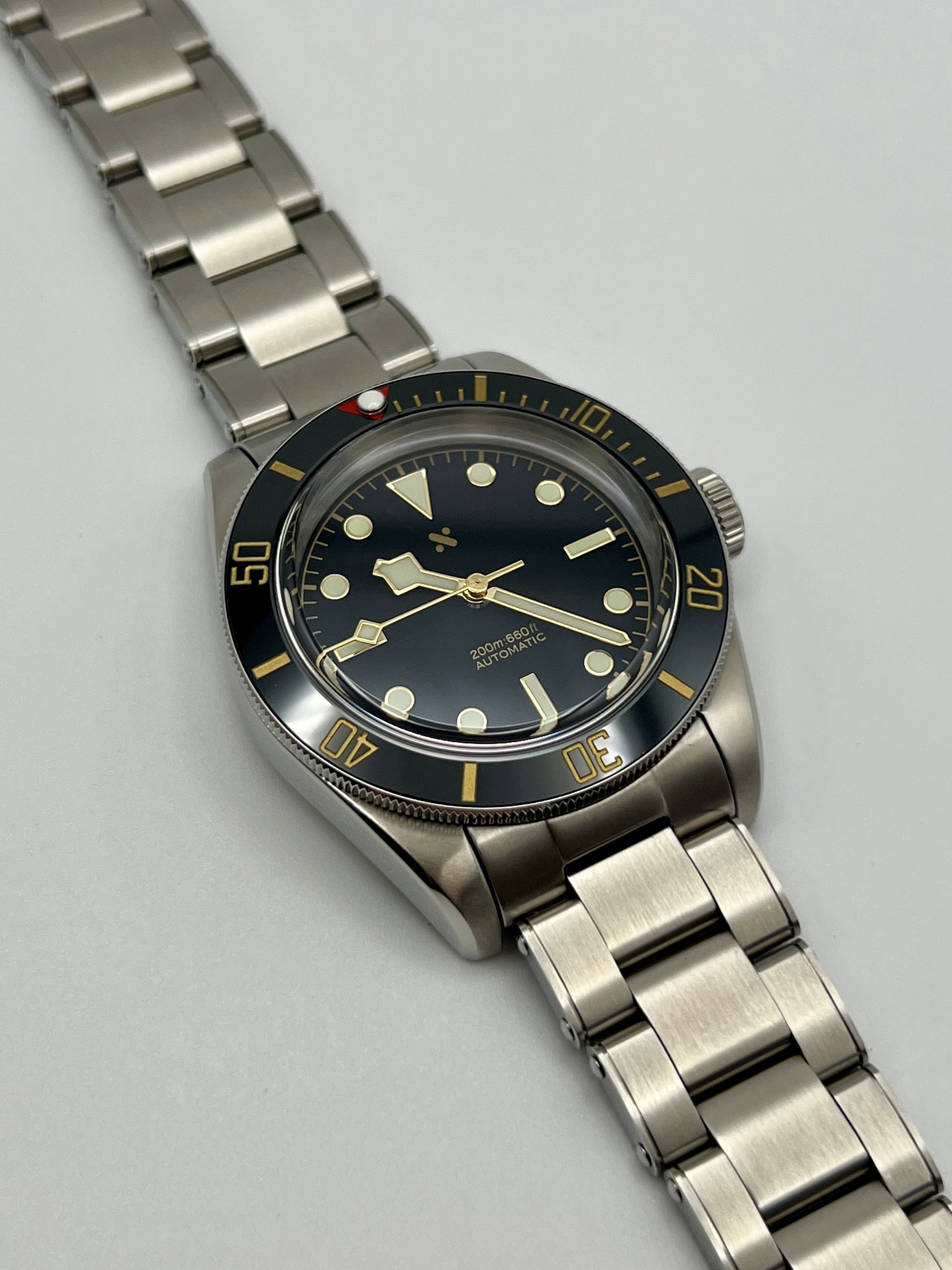 This Namoki BB58 Homage is renowned for its vintage inspired design and exceptional craftsmanship. Housed in a 39 millimeter stainless steel case, it features a slim profile, coin edge bezel, and a top hat sapphire crystal. These elements echo the timeless charm of classic dive watches. Powered by the reliable NH36 automatic movement, it delivers precise timekeeping. The riveted bracelet is fitted with screw in link screws for easy resizing. Assembled entirely in house by FrameWatchWorks and designed by Namoki Mods, this piece blends modern reliability with heritage styling, making it a standout in any collection.