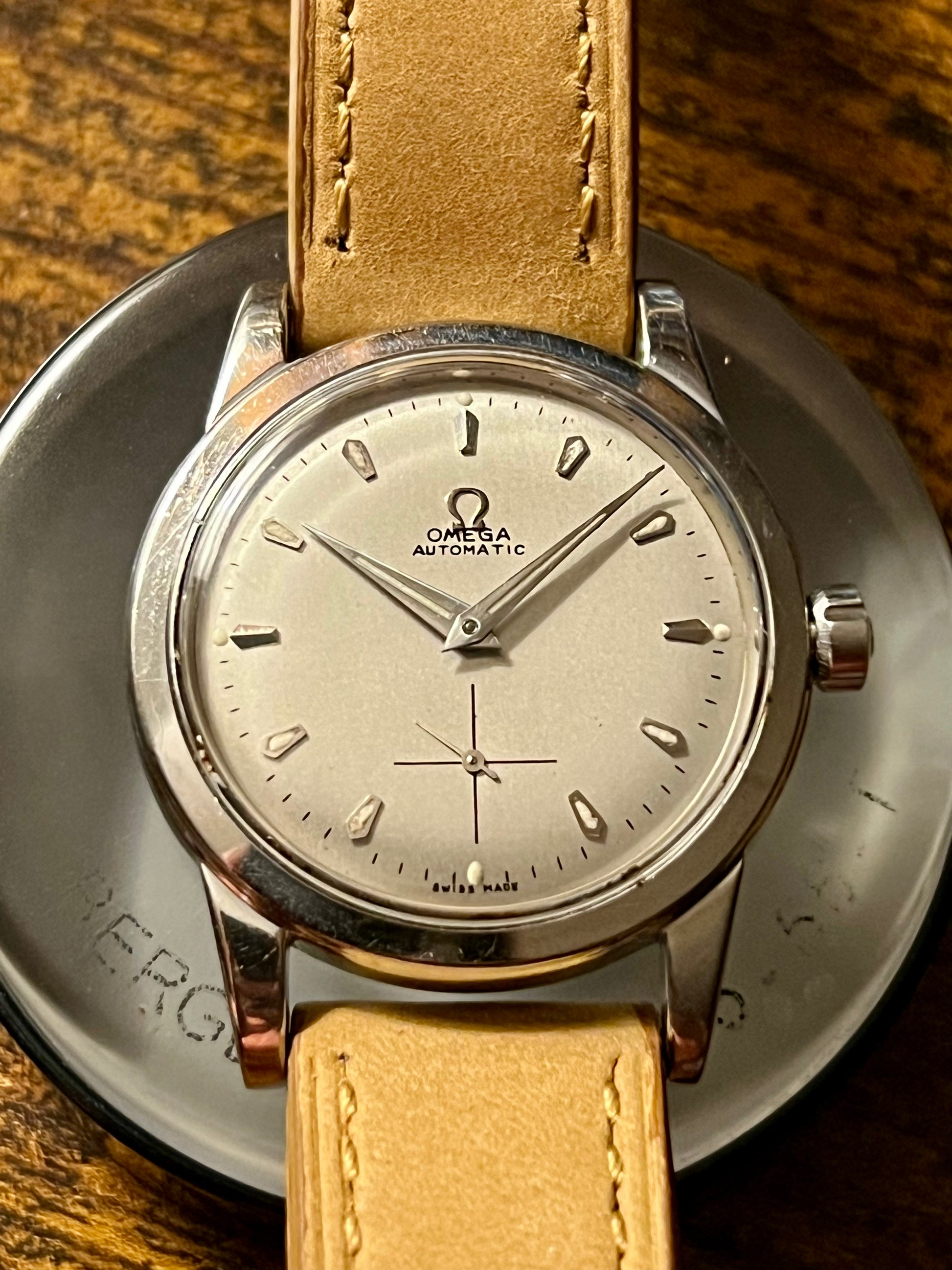 This iconic 1947 Omega Bumper Automatic is a true classic, offering both elegance and a unique tactile experience. The distinct bumper-style automatic winding rotor produces a gentle "bump" as it reaches the terminal positions of its travel, a feature cherished by vintage watch enthusiasts.