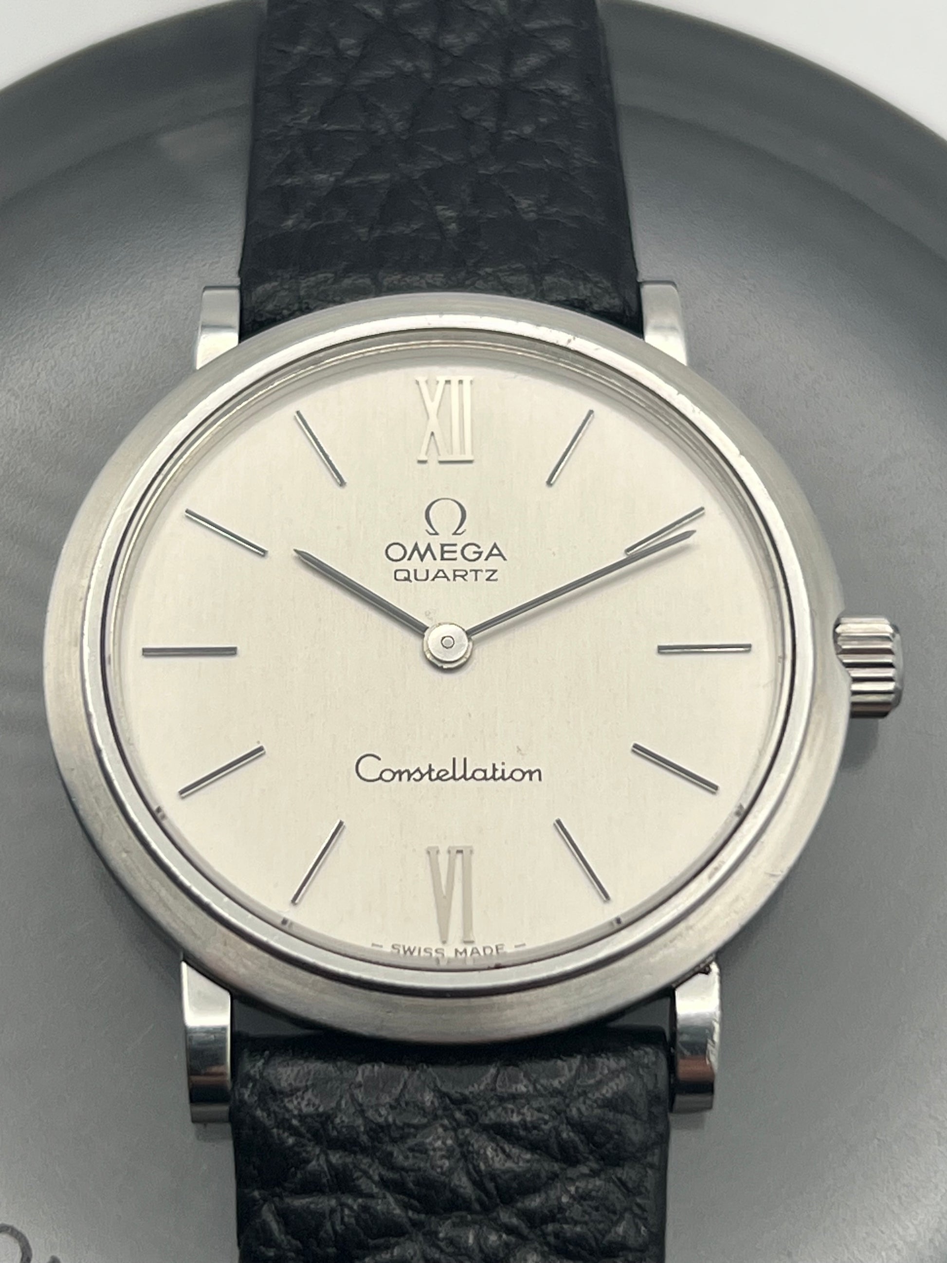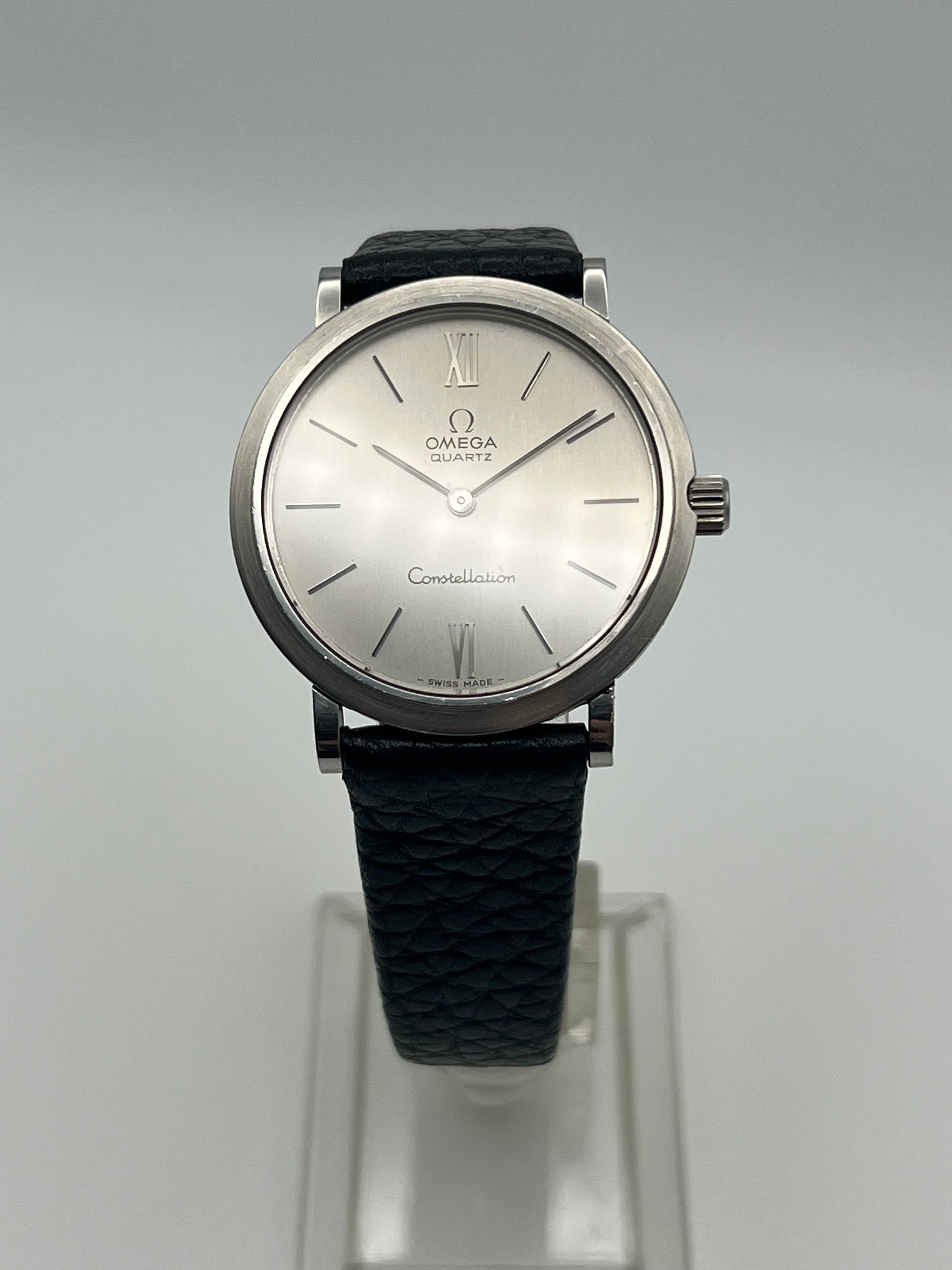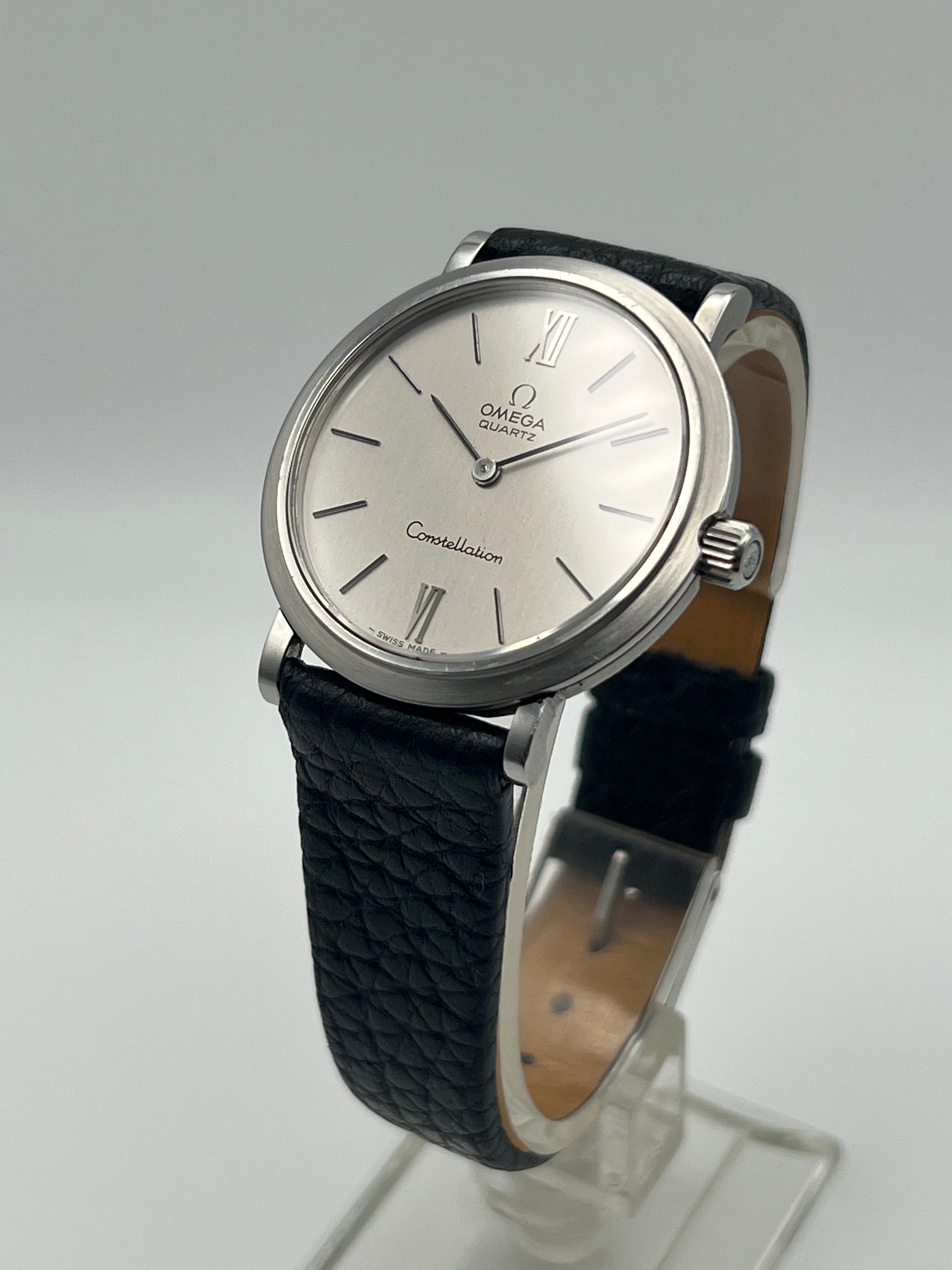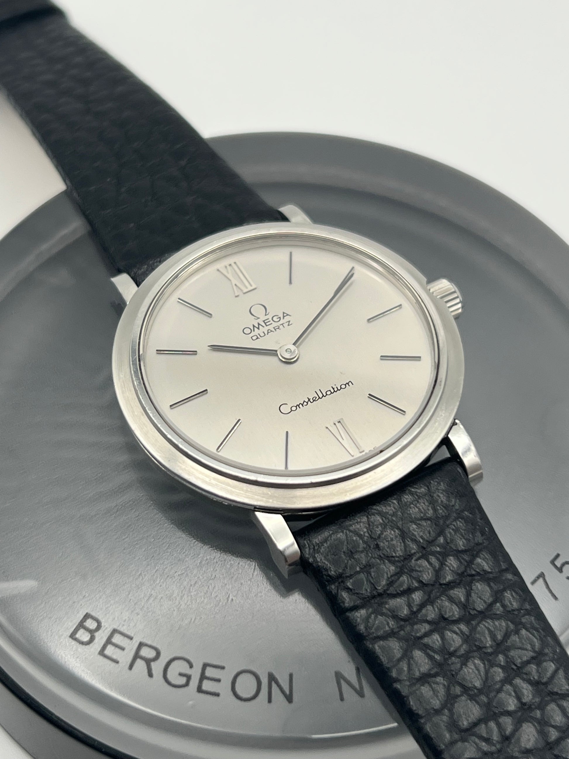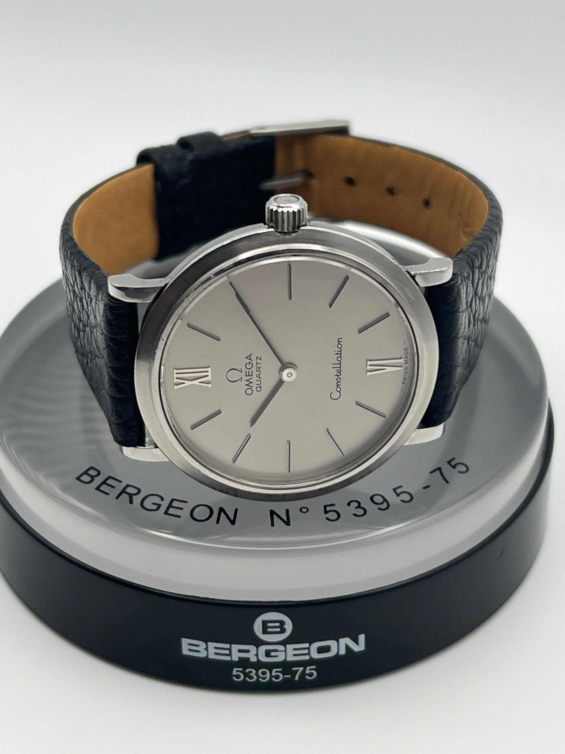 This vintage Omega Constellation Quartz Caliber 1330 from the mid 1970s is a rare Accuset model featuring Omega’s clever time setting design. Push in the crown to advance the minute hand precisely and pull it out to rotate the hour hand independently. The movement has been fully serviced and runs with the excellent accuracy expected from Omega’s pioneering quartz technology.