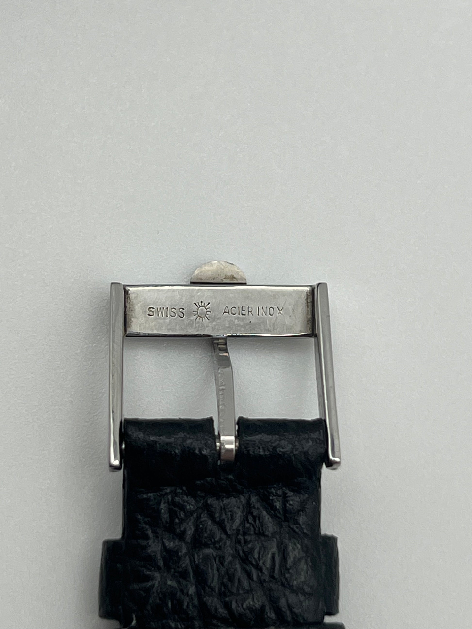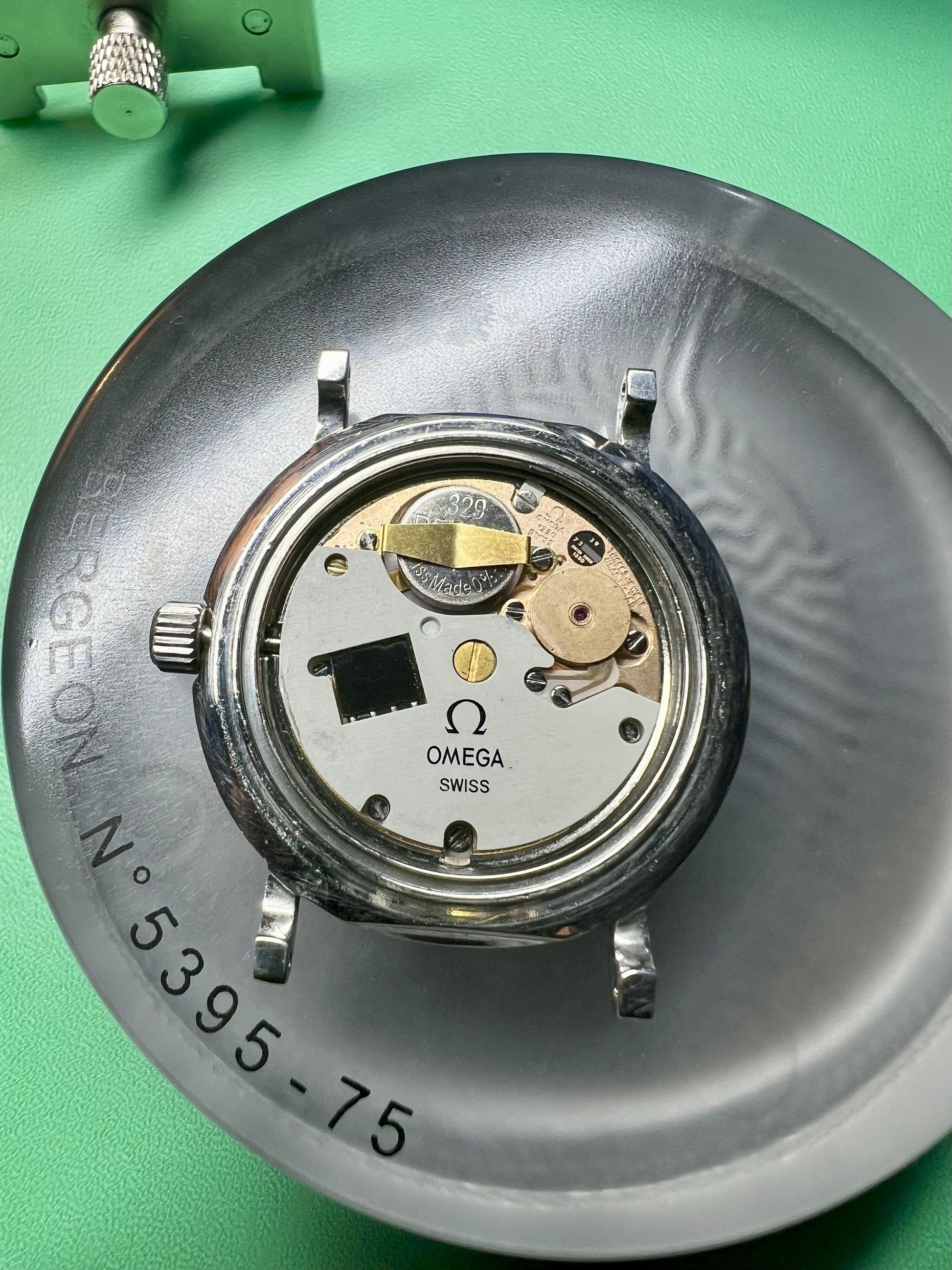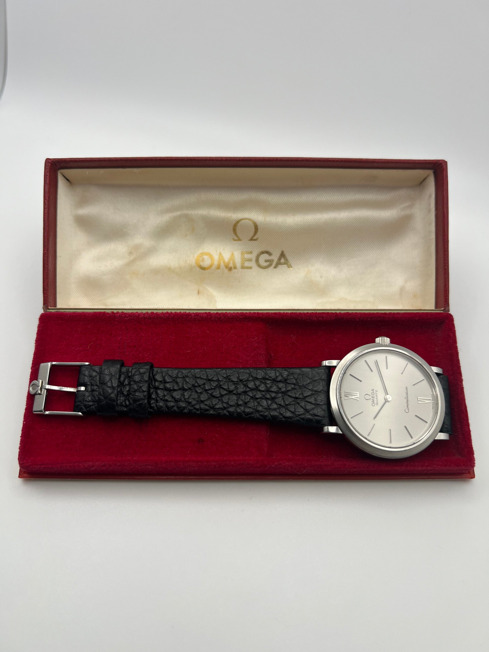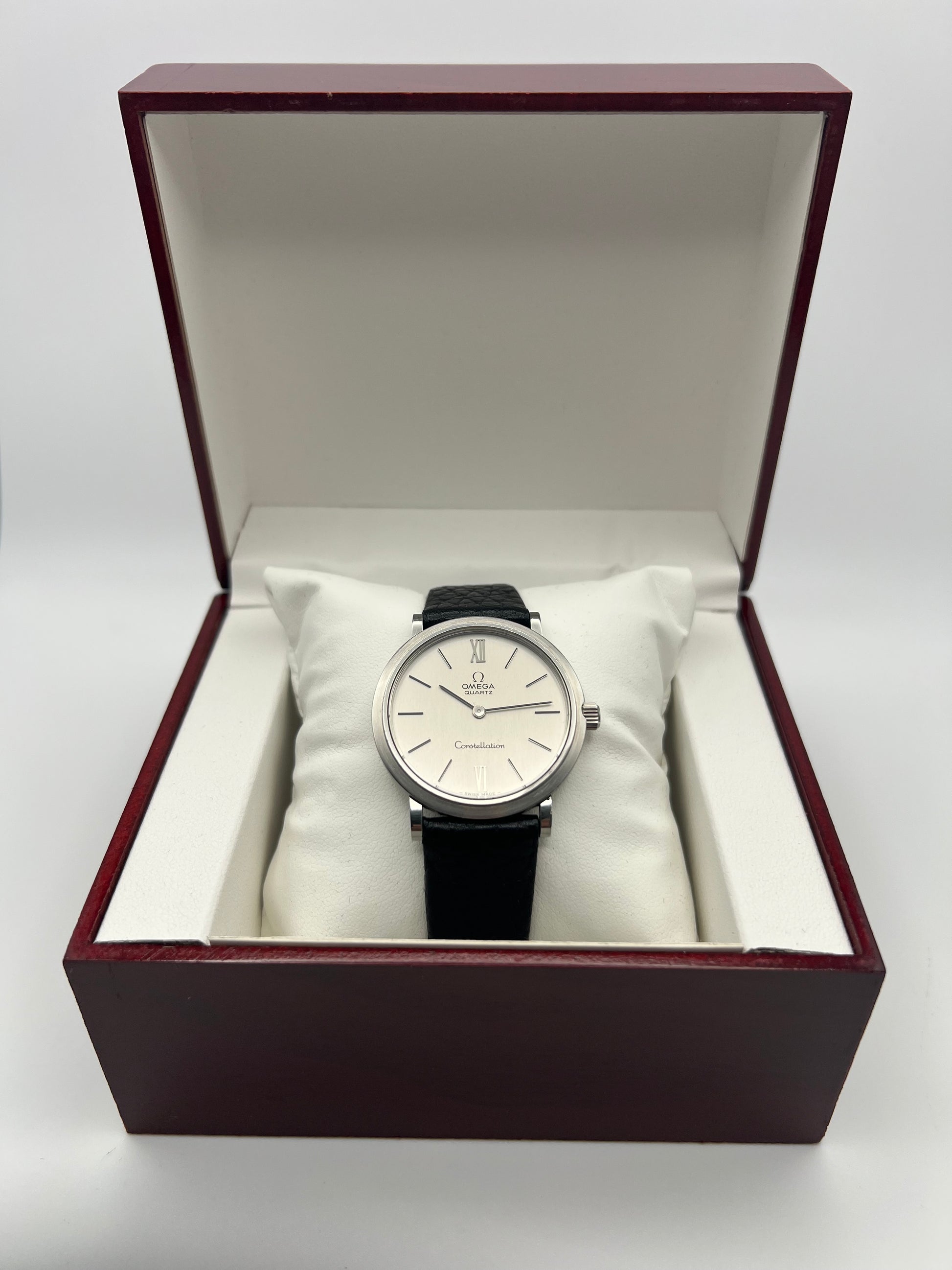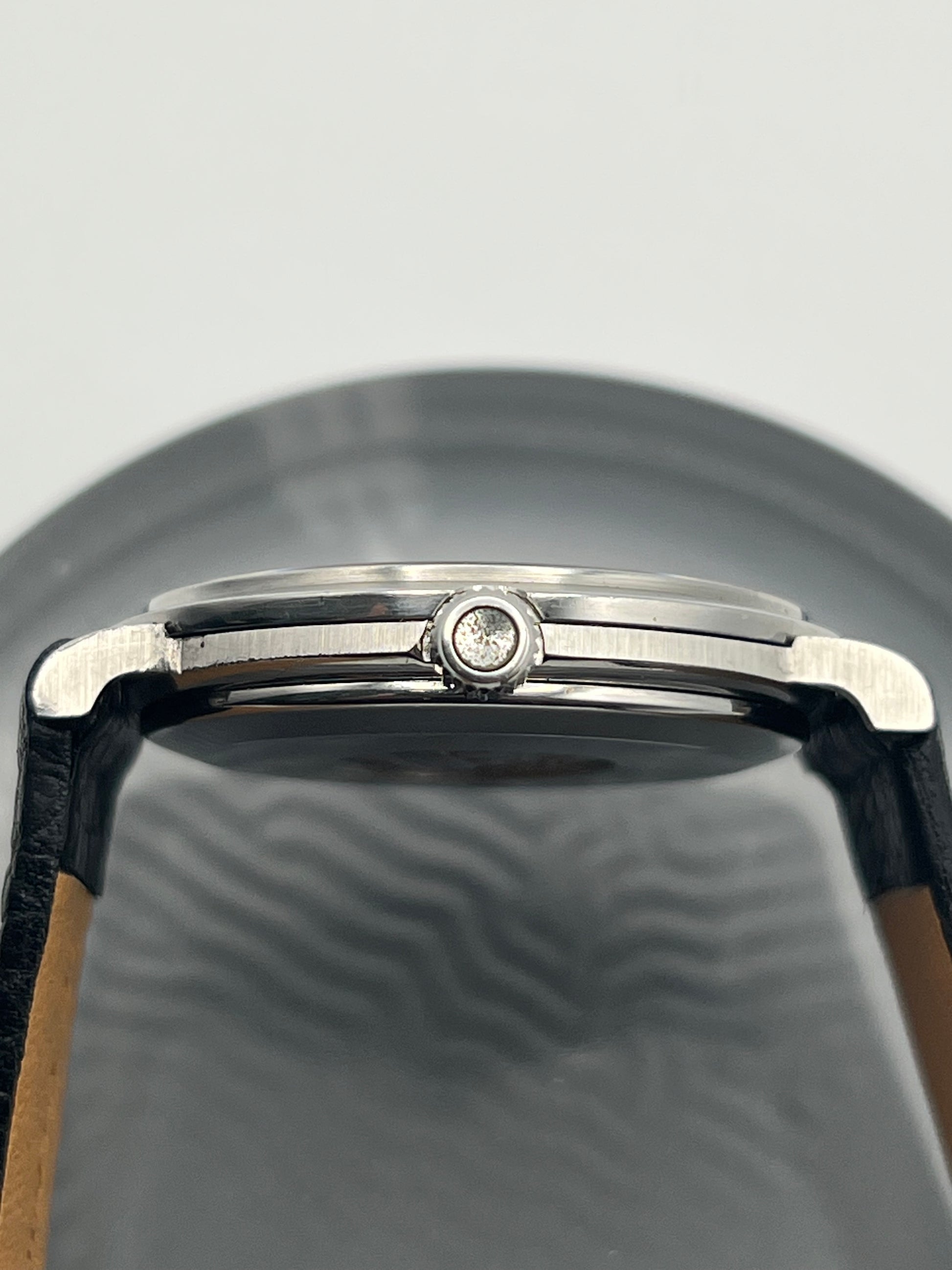 This vintage Omega Constellation Quartz Caliber 1330 from the mid 1970s is a rare Accuset model featuring Omega’s clever time setting design. Push in the crown to advance the minute hand precisely and pull it out to rotate the hour hand independently. The movement has been fully serviced and runs with the excellent accuracy expected from Omega’s pioneering quartz technology.