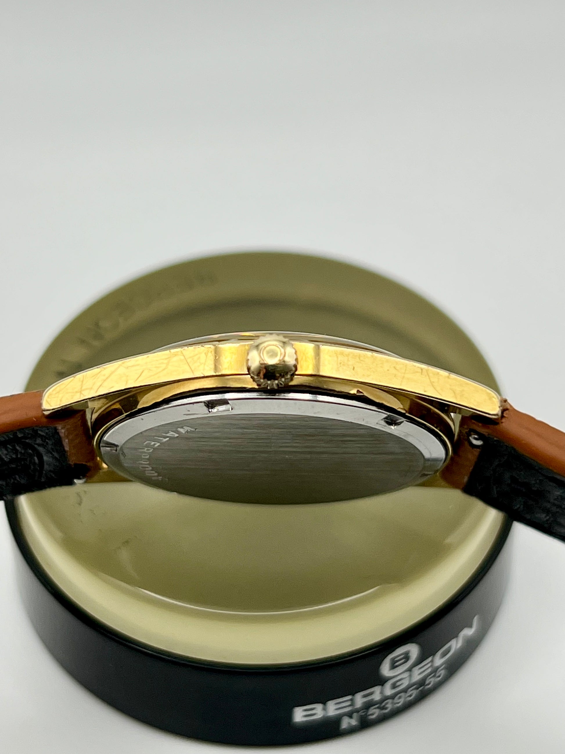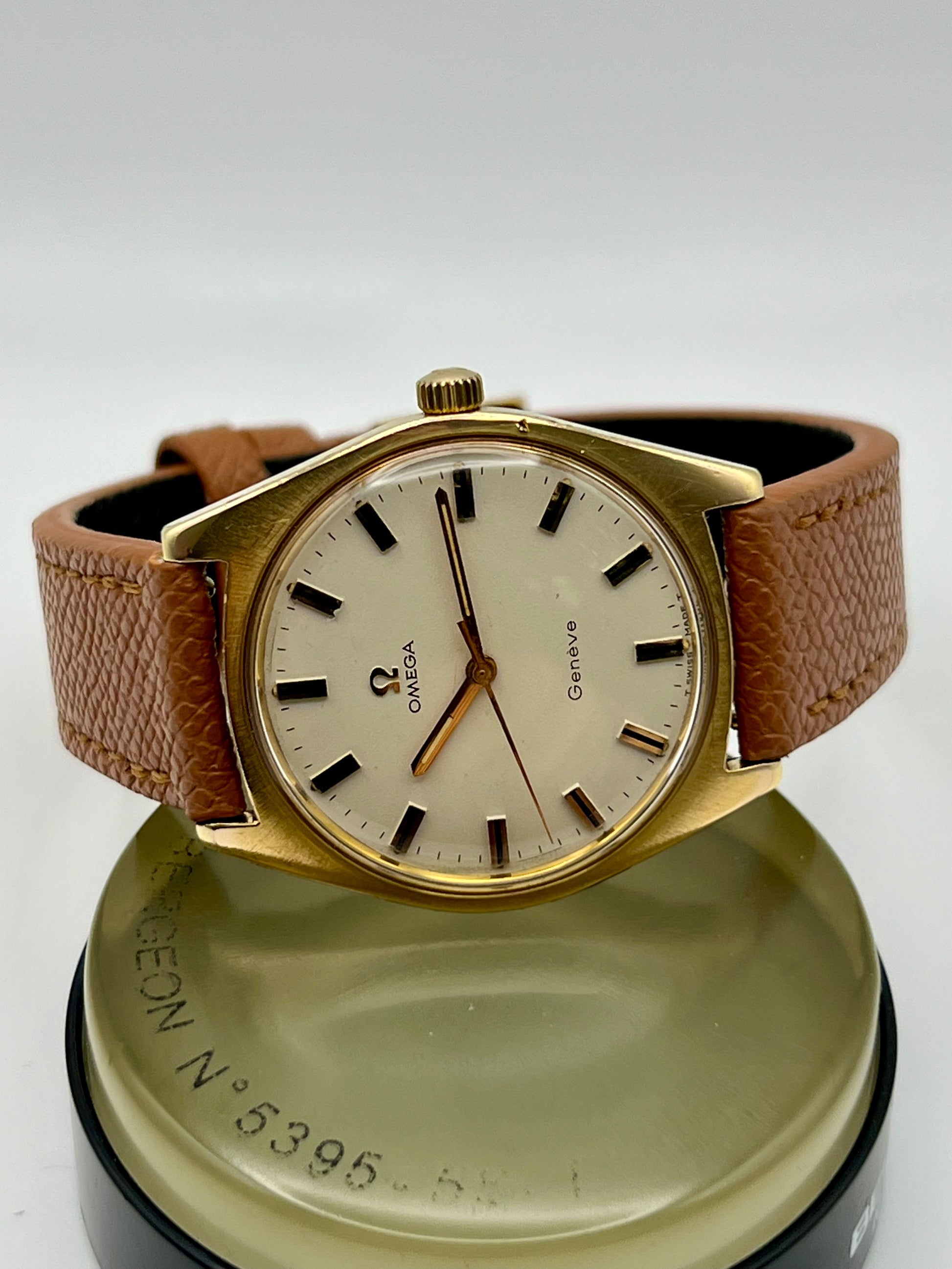 This stunning Omega Genève Ref. 135.041, features a 35mm gold-plated case with a radiant sunburst gold dial and matching gold-tone hands and indices. Powered by the renowned Omega Caliber 601 manual-wind movement, this timepiece offers reliable timekeeping, ensuring precision and longevity. The watch is in excellent condition, retaining its original Omega-signed crown and crystal, and comes mounted on a new leather strap. With its timeless design and exceptional craftsmanship, this vintage Omega Genève is a true collector's piece.