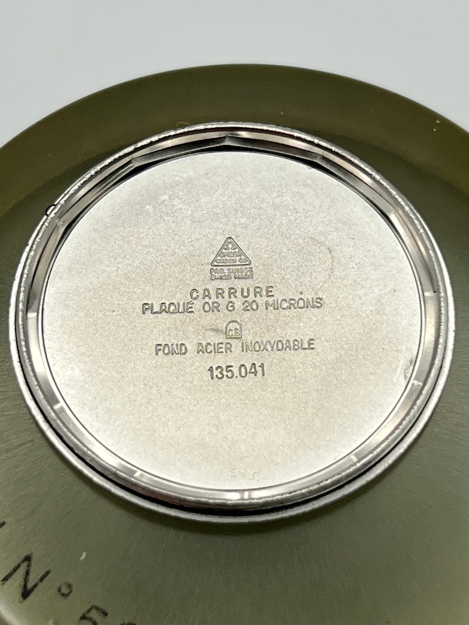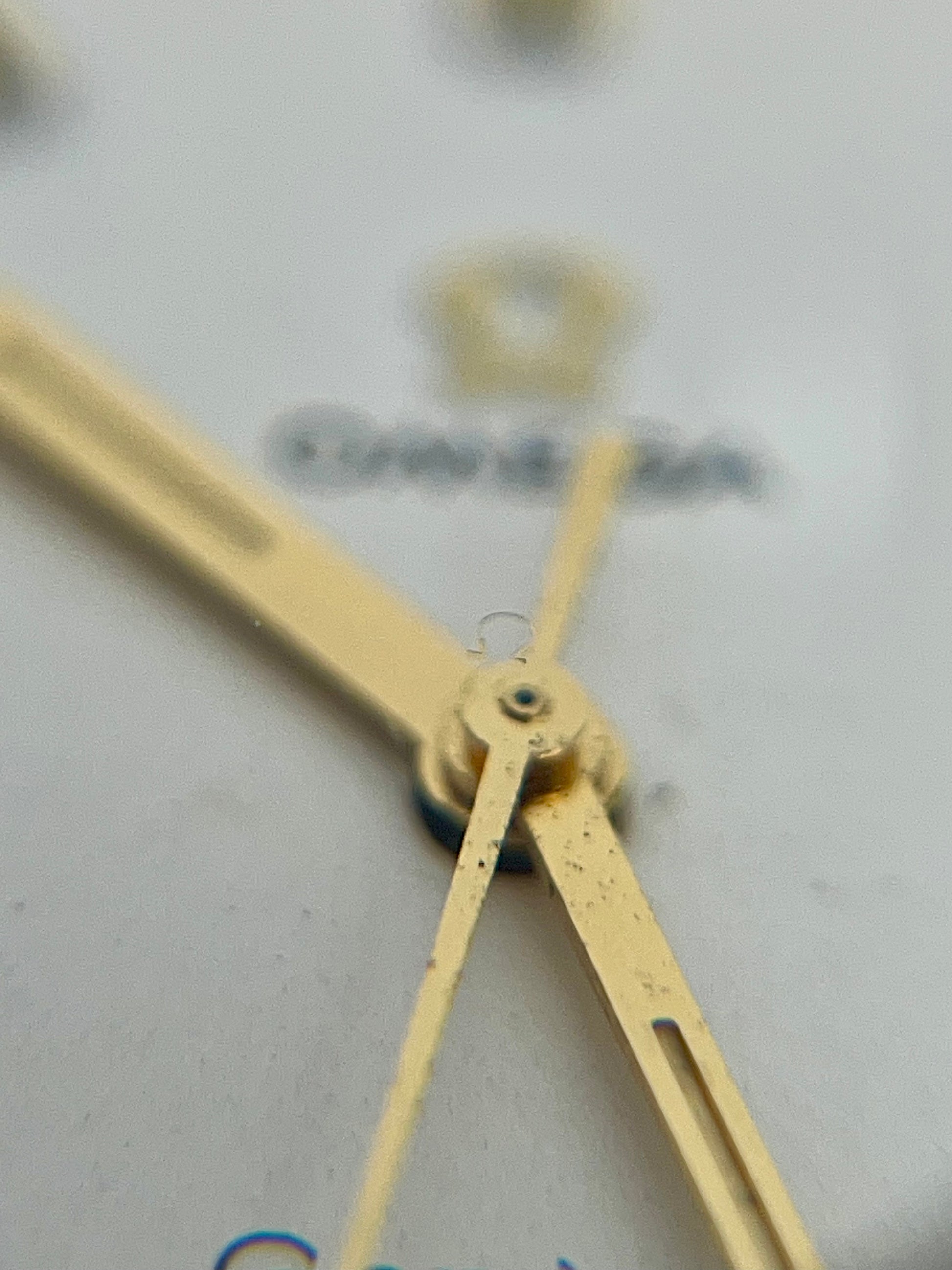 On the case next to the crown has a small dent.  On the back of the watch where the case back contacts the case has pitting due to corrosion.  Corrosion since removed.  The original Omega crystal has a couple deep scratches, nearly un-noticeable to the naked eye.