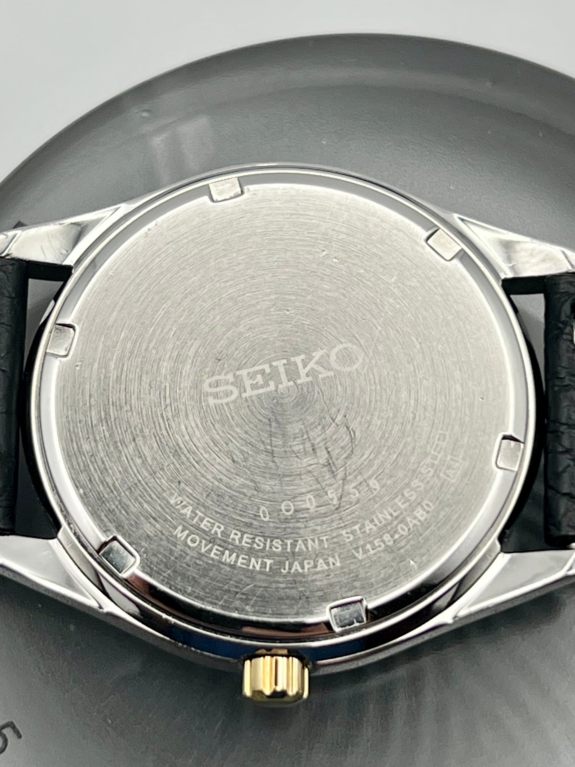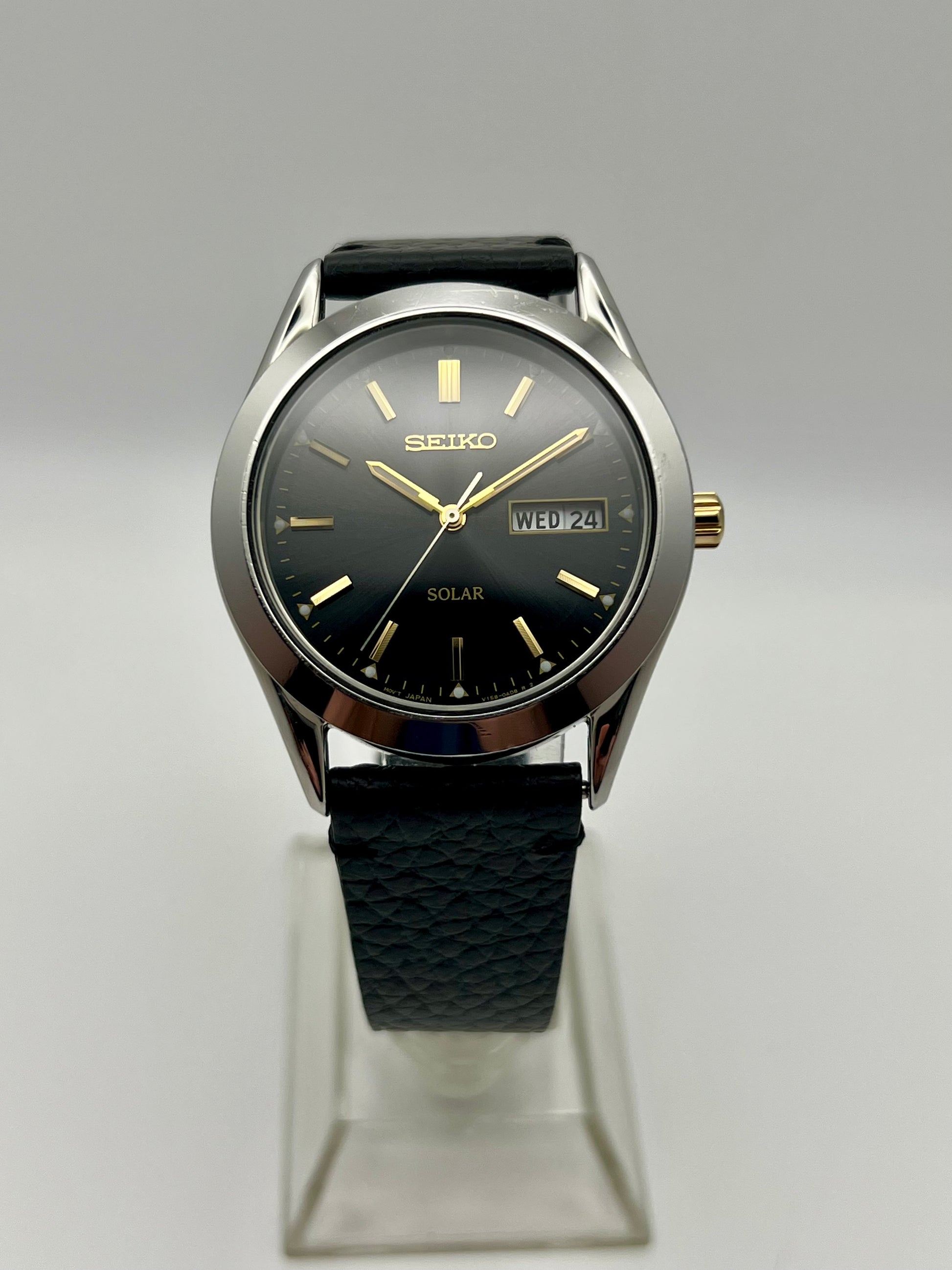 This Seiko V158 0AB0 is a reliable and stylish choice for everyday wear. It runs on the Seiko Caliber V158, a solar quartz movement with day and date functions. The movement uses a rechargeable capacitor instead of a traditional battery, offering long term reliability. The capacitor has been recently replaced, allowing the watch to hold a full charge for years to come. It features instant start, overcharge protection, and keeps time with an accuracy of around fifteen seconds per month. The black dial is accented with gold tone indices and a day and date display, all protected by a new sapphire crystal. The stainless steel case is paired with a gold tone crown and a black full grain leather strap from Dassari, creating a clean and versatile look.