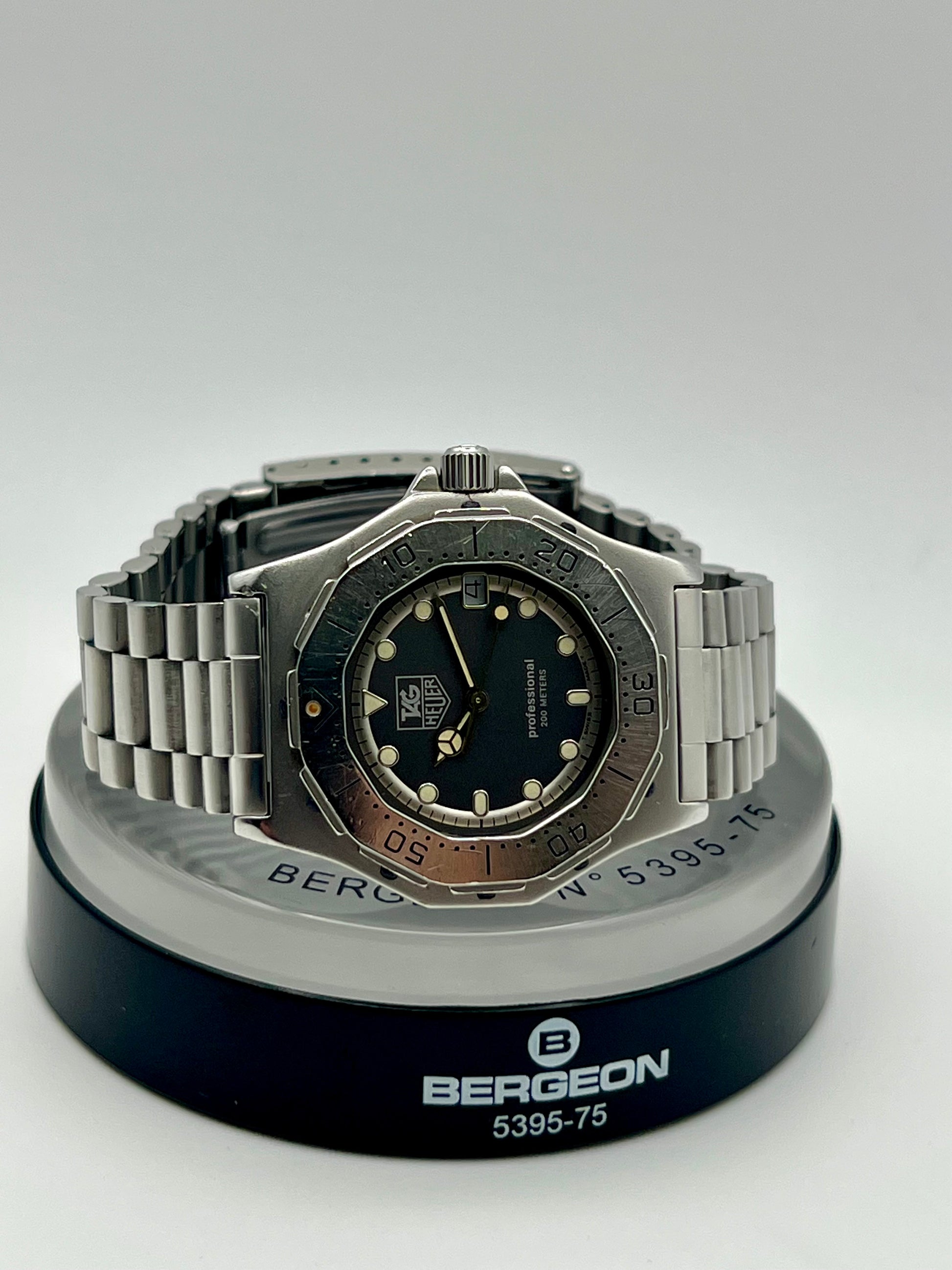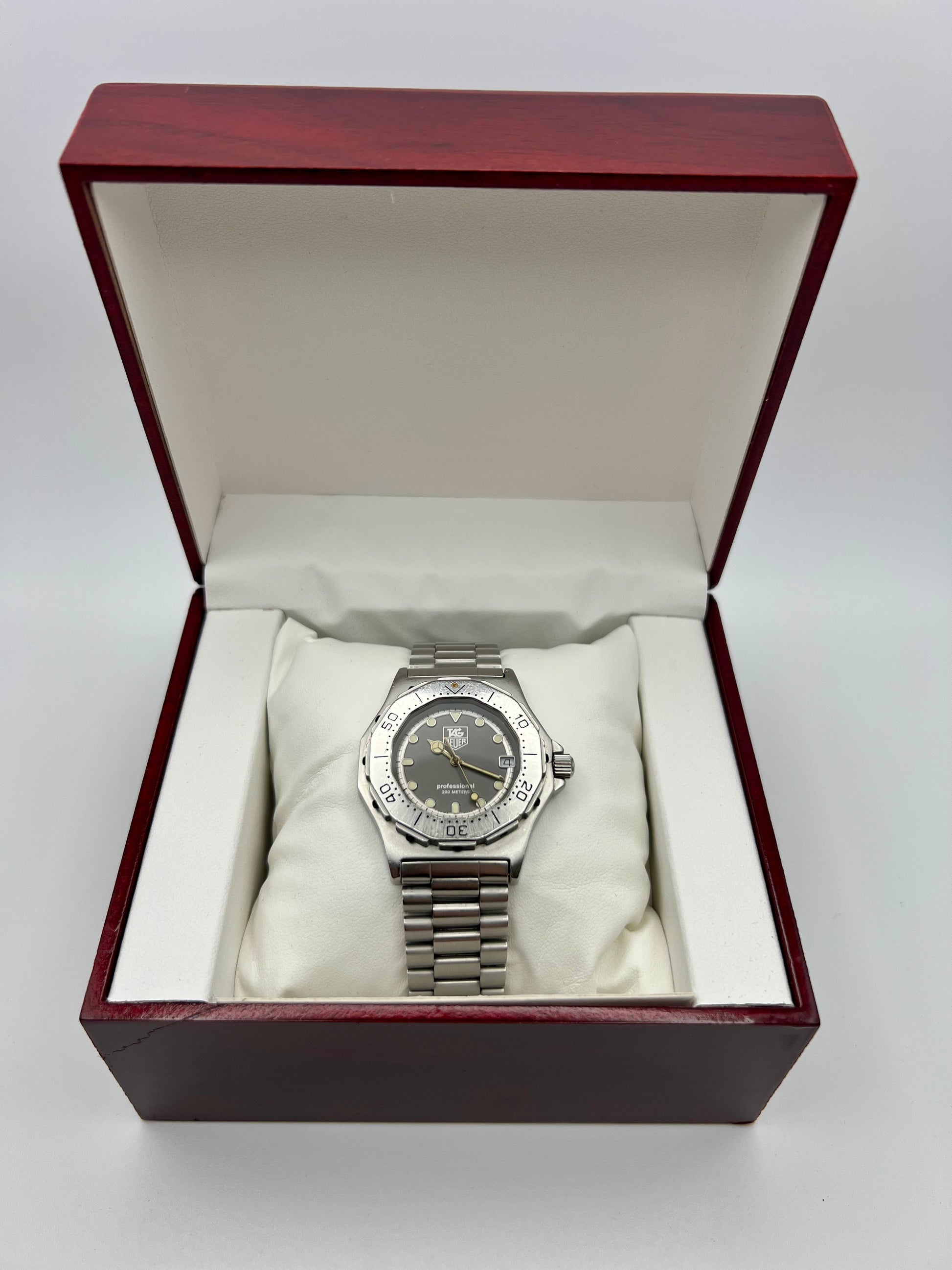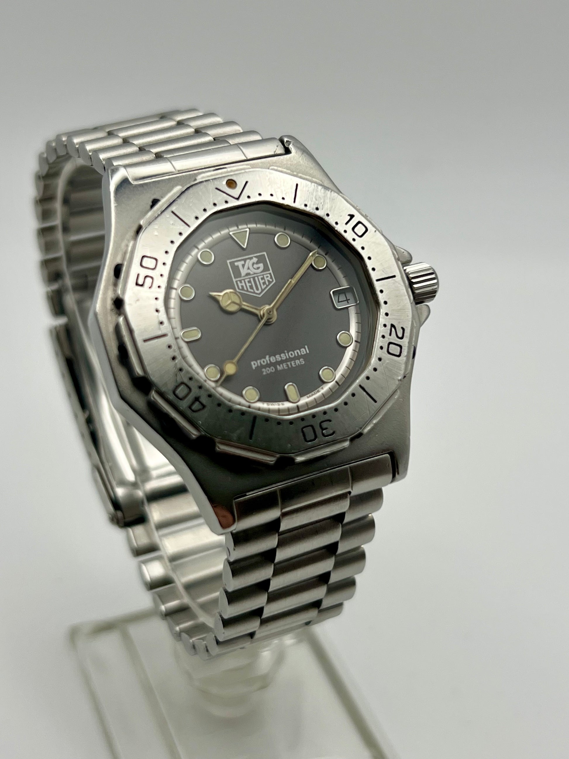 Presenting the rare TAG Heuer Professional 3000 Ref. 923.213 grey dial, a striking stainless steel classic that blends understated elegance with vintage pedigree. This midsize quartz model features a clean grey dial with luminous hands and markers, housed under a sapphire crystal for lasting durability. The integrated stainless steel case and bracelet are accented by black insert details on exterior of bezel, some of which are missing and likely made of carbon fiber. These original elements are no longer available and their absence adds a sense of character and visible history to this uncommon reference. Considered a small men's or medium sized women's watch, it wears comfortably while offering a refined vintage presence.