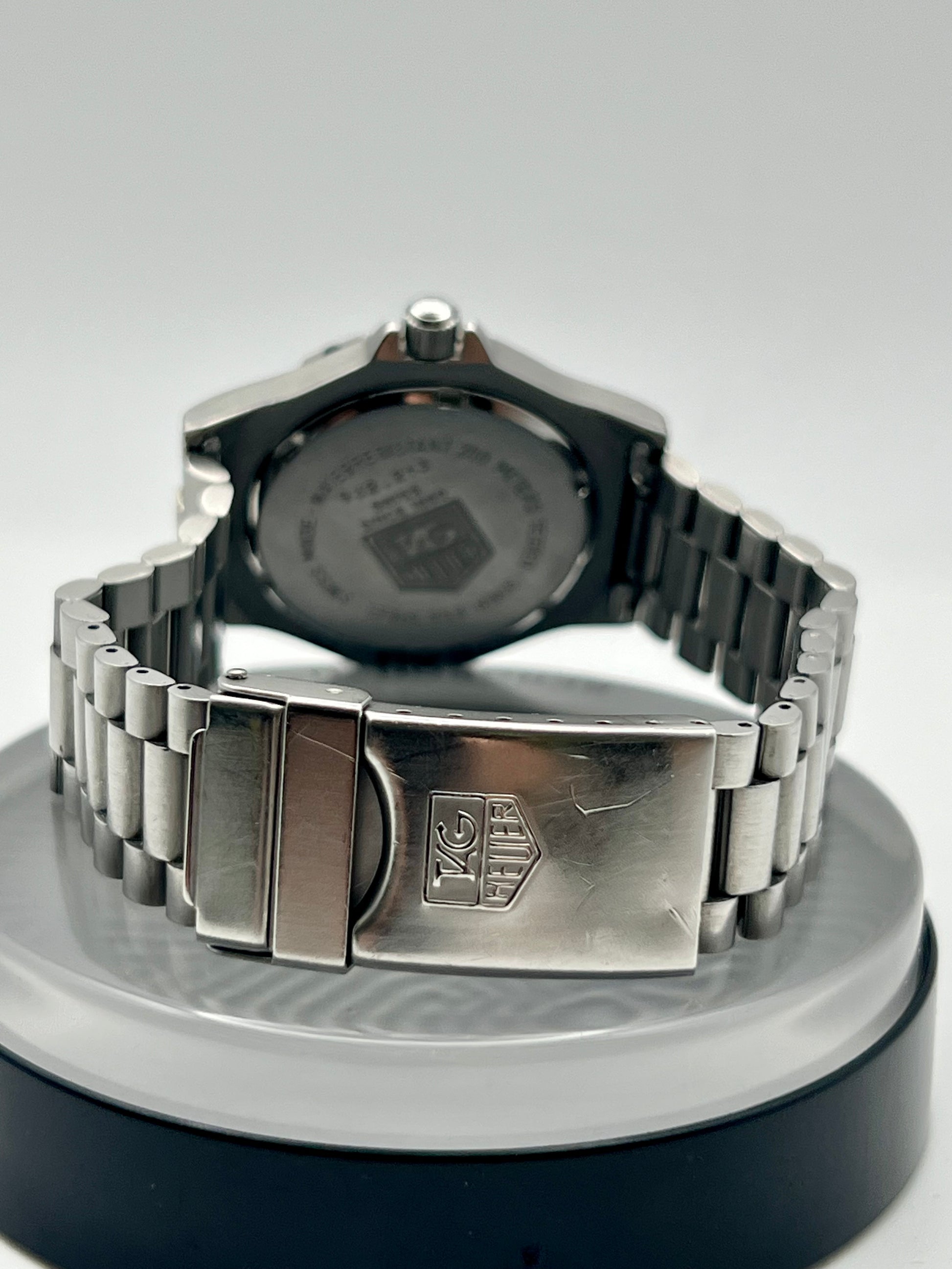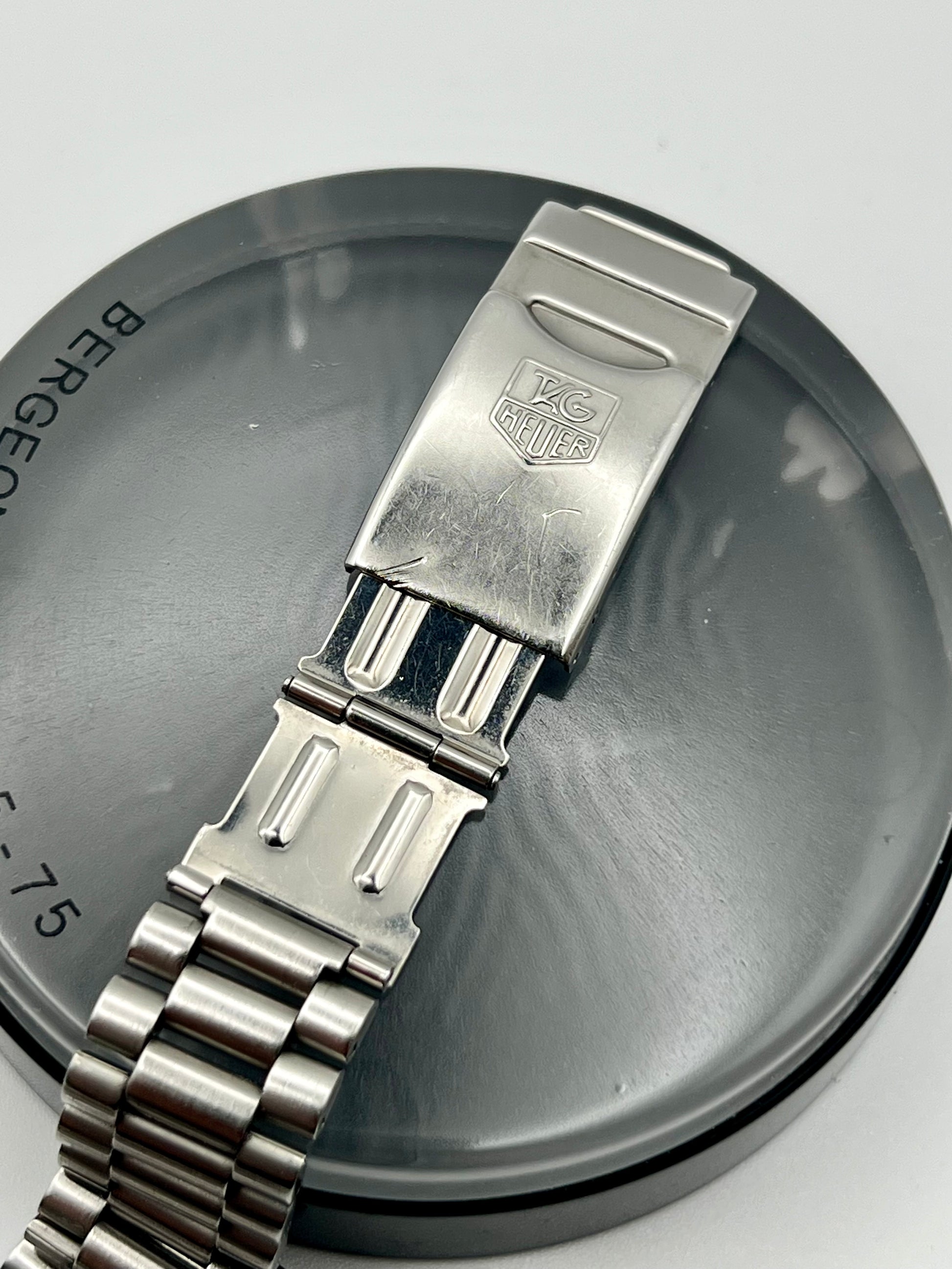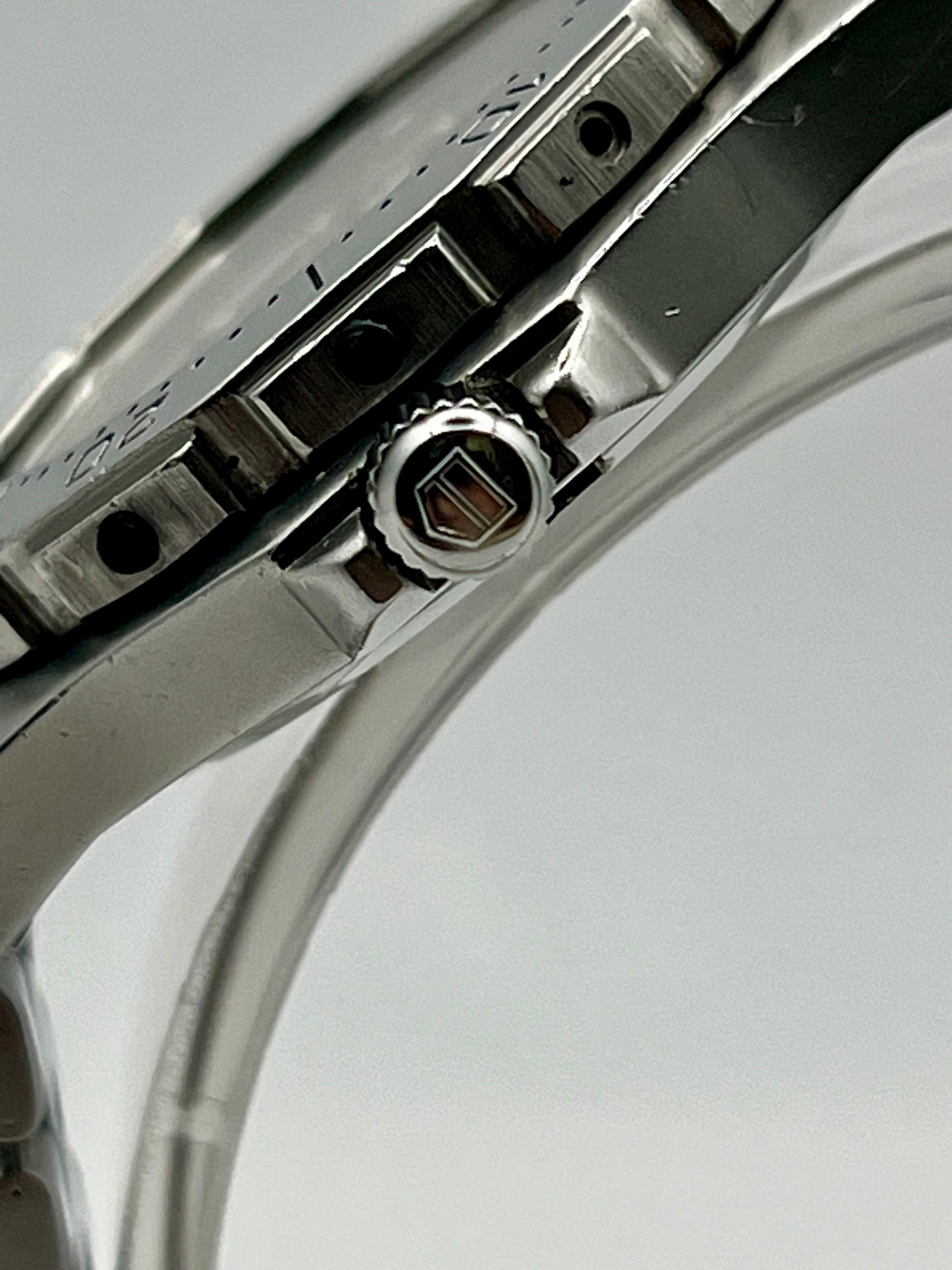 Presenting the rare TAG Heuer Professional 3000 Ref. 923.213 grey dial, a striking stainless steel classic that blends understated elegance with vintage pedigree. This midsize quartz model features a clean grey dial with luminous hands and markers, housed under a sapphire crystal for lasting durability. The integrated stainless steel case and bracelet are accented by black insert details on exterior of bezel, some of which are missing and likely made of carbon fiber. These original elements are no longer available and their absence adds a sense of character and visible history to this uncommon reference. Considered a small men's or medium sized women's watch, it wears comfortably while offering a refined vintage presence.