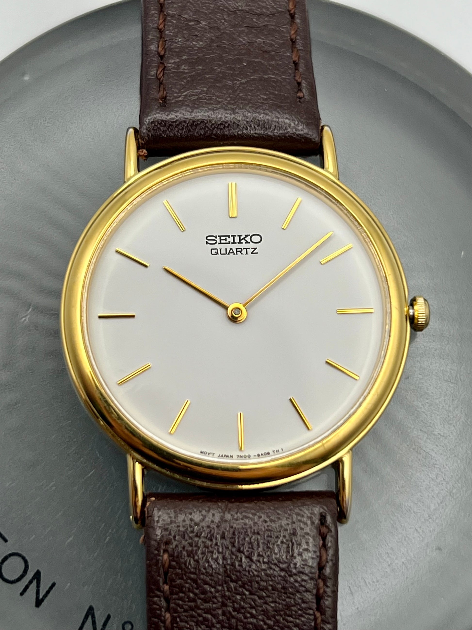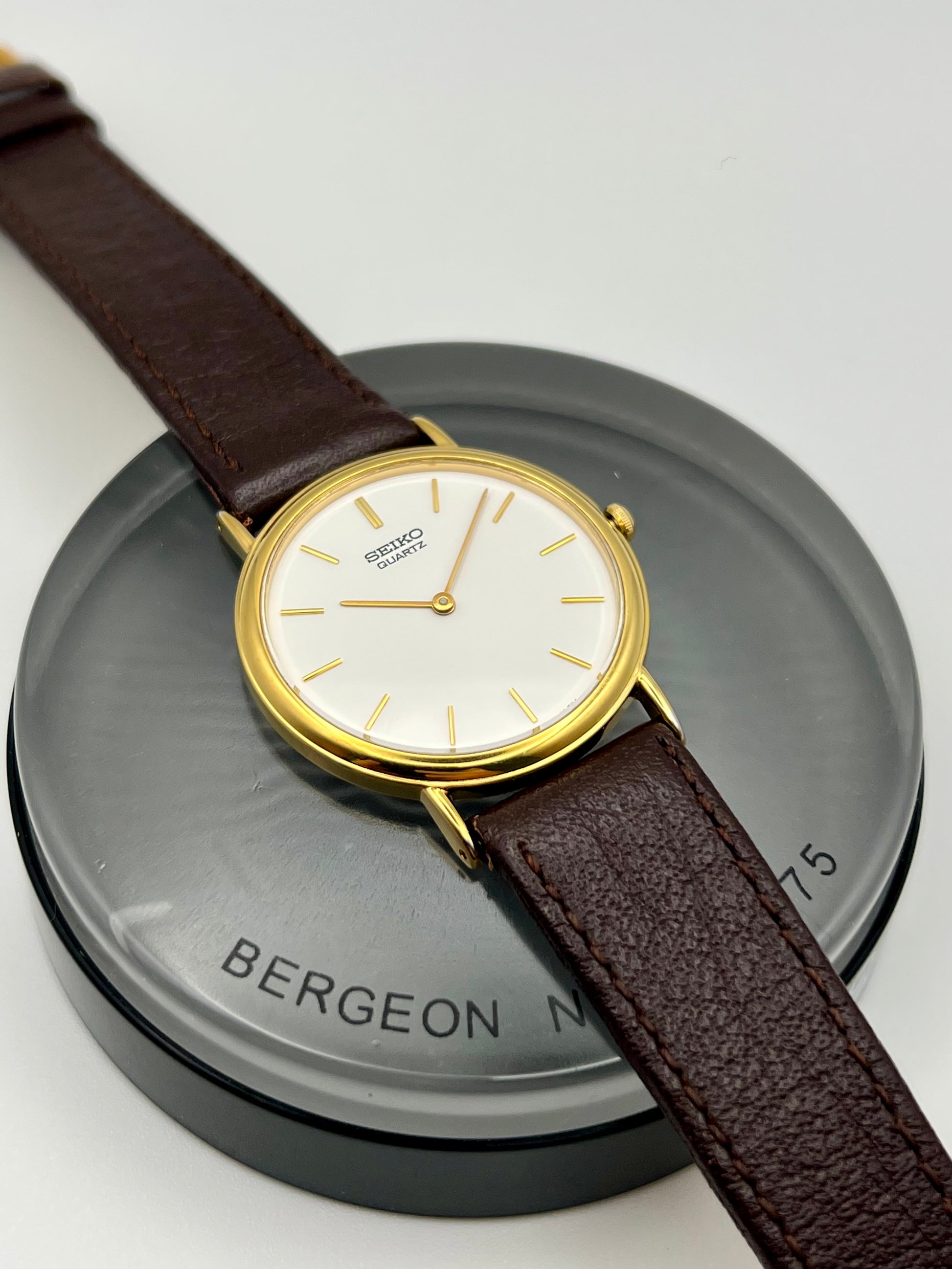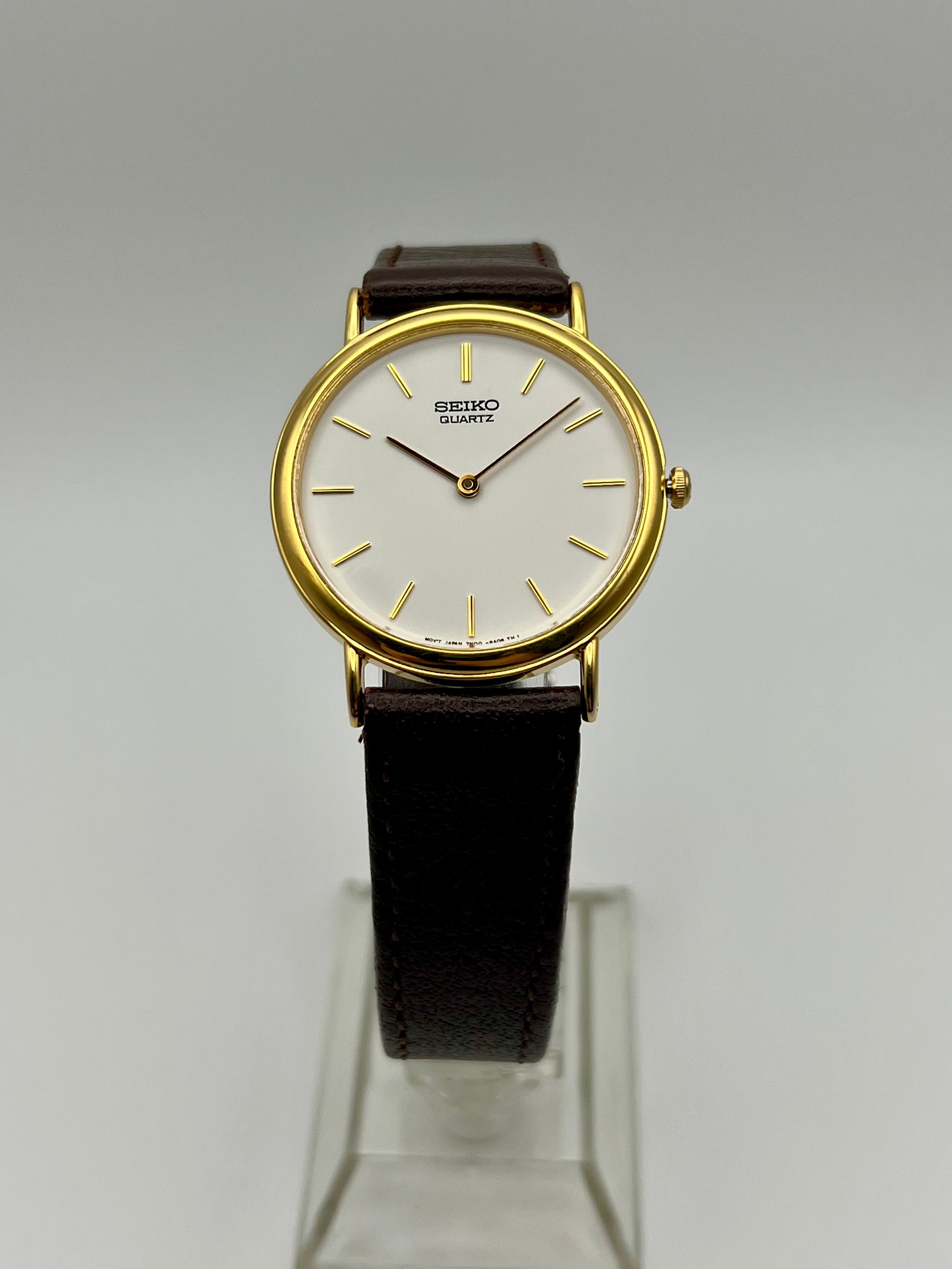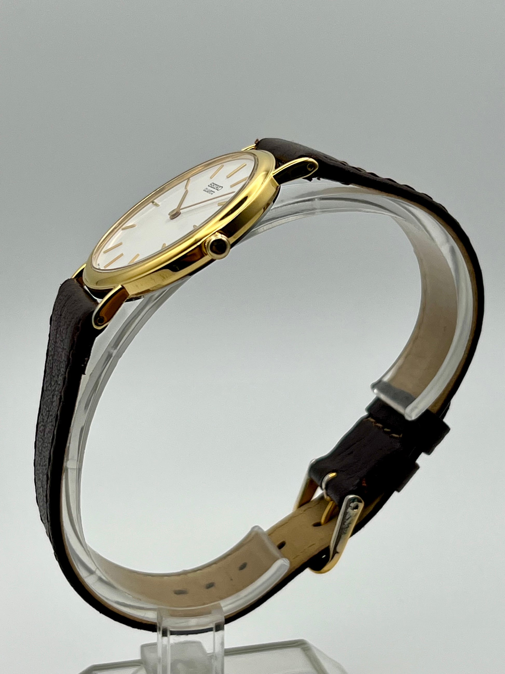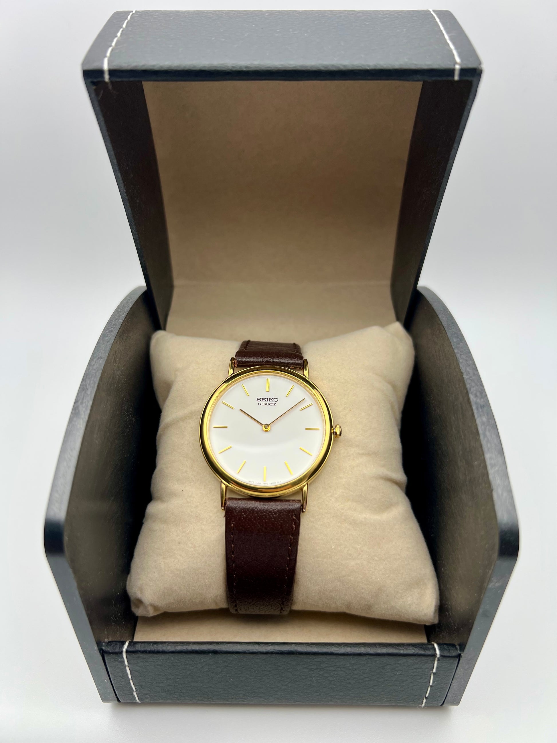 Powered by Seiko’s reliable quartz movement, it delivers accurate timekeeping with minimal upkeep. The ultra thin case slips easily under a cuff, making it an ideal choice for dress or everyday use. Light vintage wear, fully functional, and a great example of classic Seiko design that remains stylish and practical today.